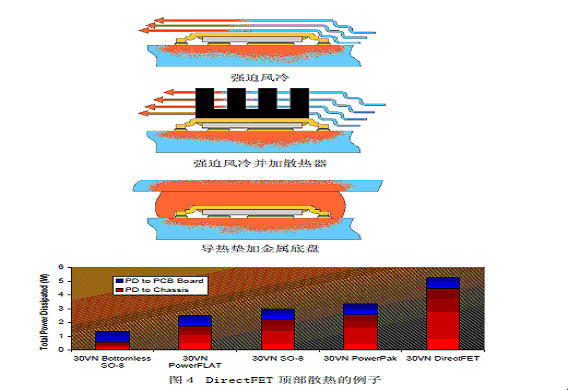 По сравнению с типичными небольшими свинцовыми пакетами, тепловое сопротивление DirectFET значительно снижено. В пакете DirectFET материал термостойкости между соединением и печатной платой-Только Металл выше и припой, используемый для установки. Тепловое сопротивление (Rthj-pcb) соединения SO-8 с печатной платой составляет около 20 °C/Wmax, в то время как прямой tfet посылка того же размера составляет менее 1 °C/W, А верхнее металлическое сливное соединение пакета DirectFET-это соединение чипа. Между посылка вкой и тепловым сопротивлением всего 3 °C обеспечивается низкий уровень теплового сопротивления/Вт. Благодаря этому метод отведения тепла устройства сильно отличается от предыдущего. Принудительное воздушное охлаждение или Теплопроводящая Наполняющая среда могут использоваться для передачи тепла в правильно Заземленный радиатор. Эти понятия иллюстрируют фигуры.
