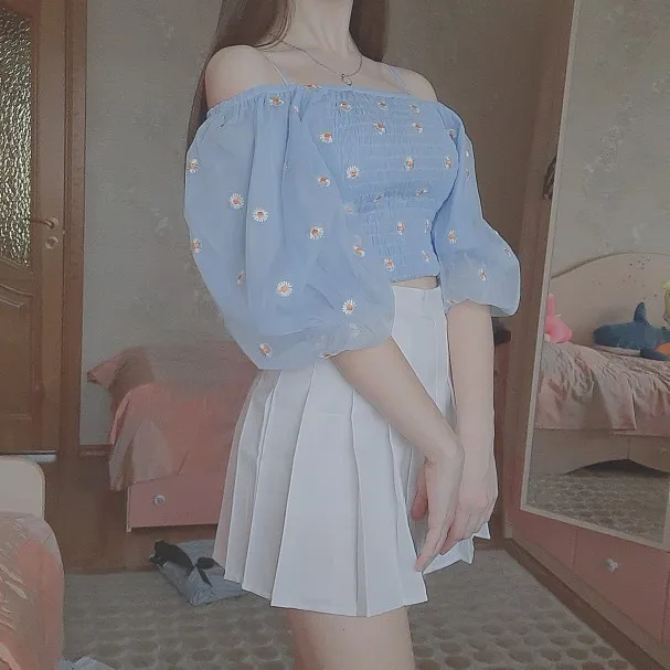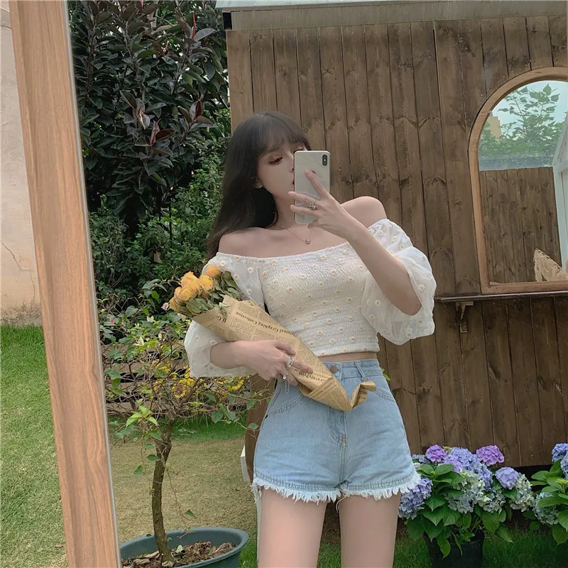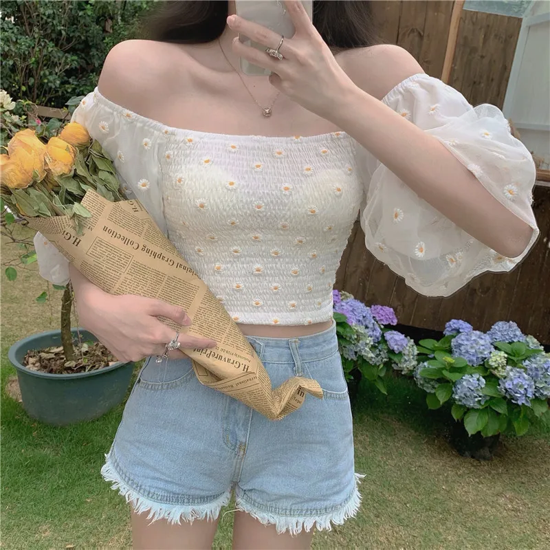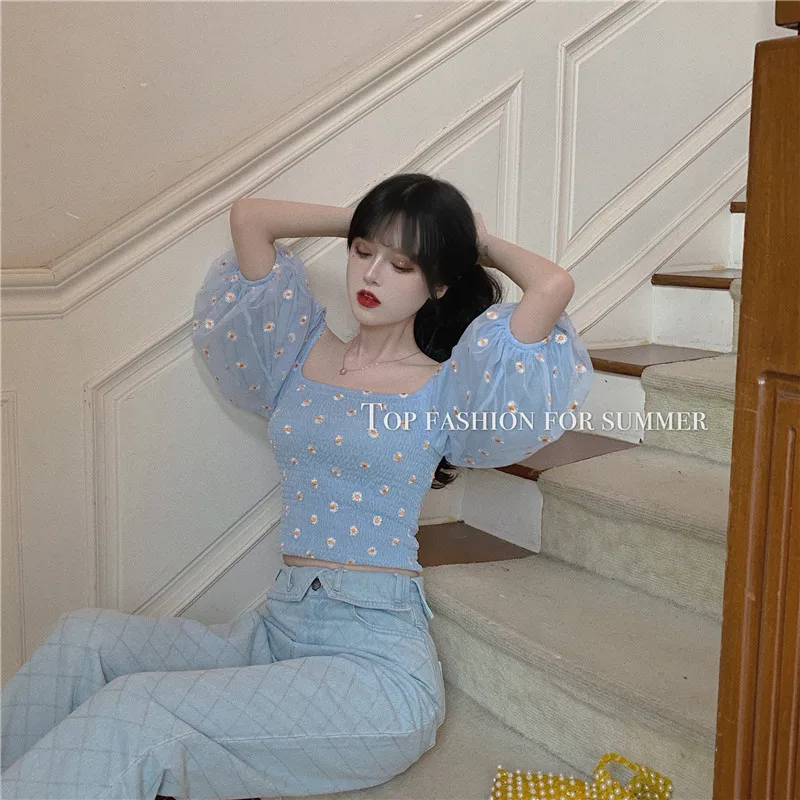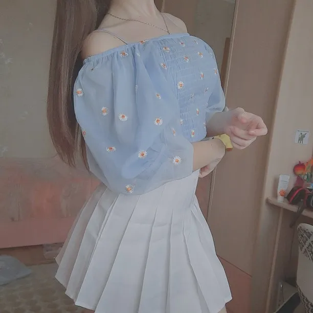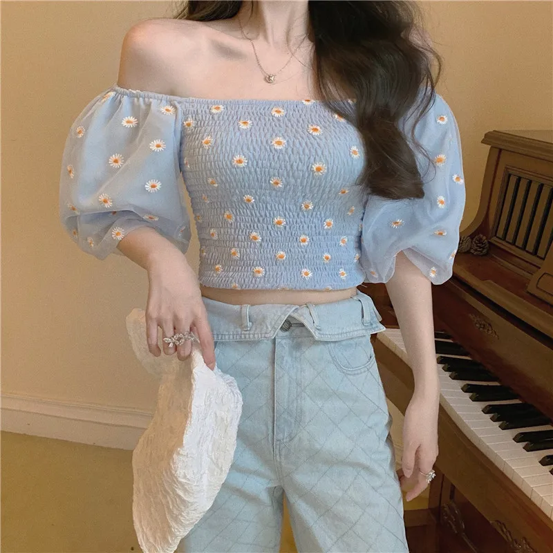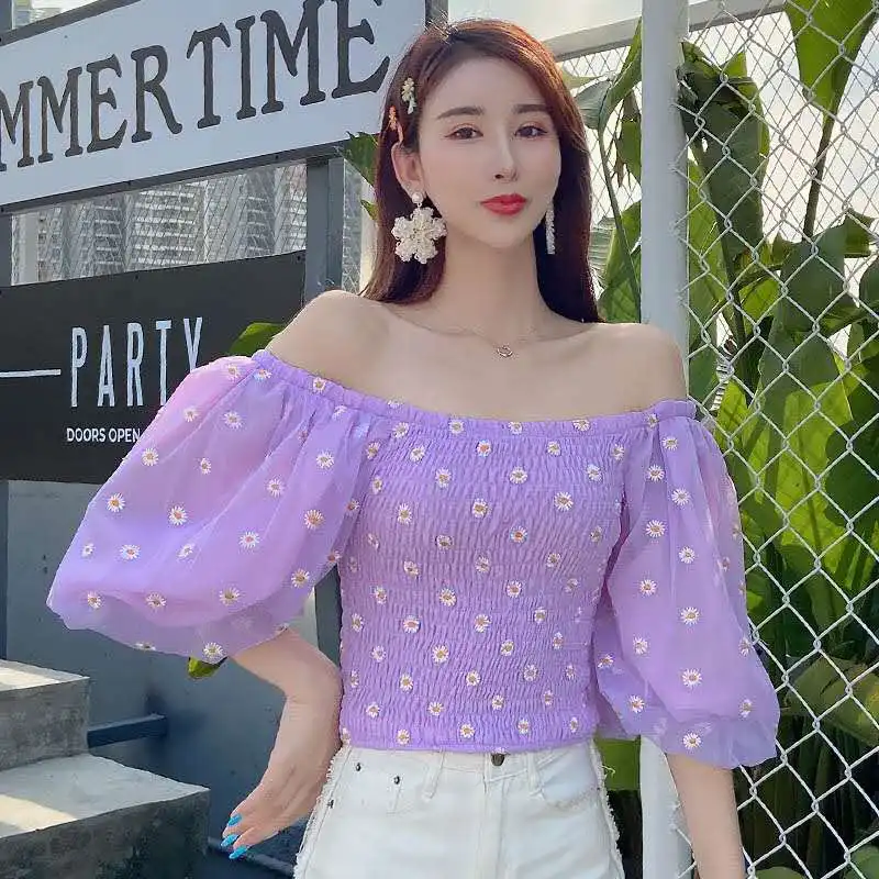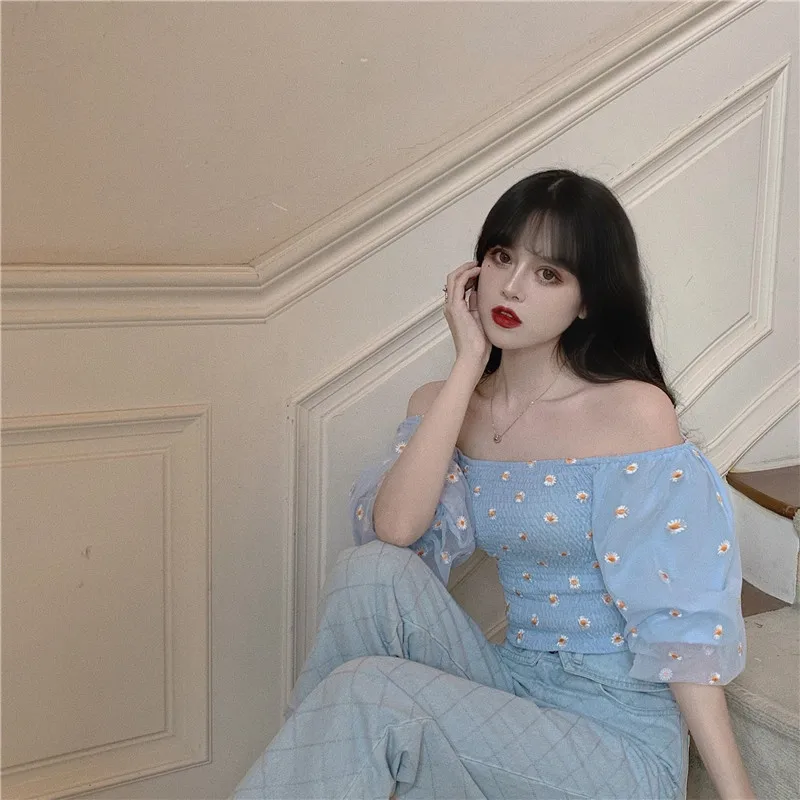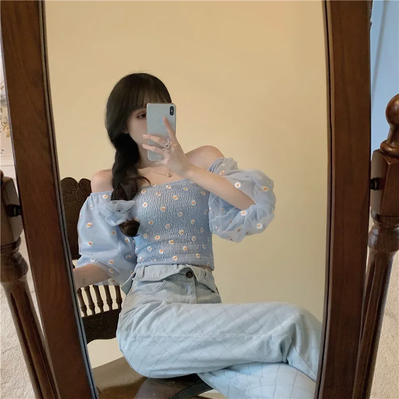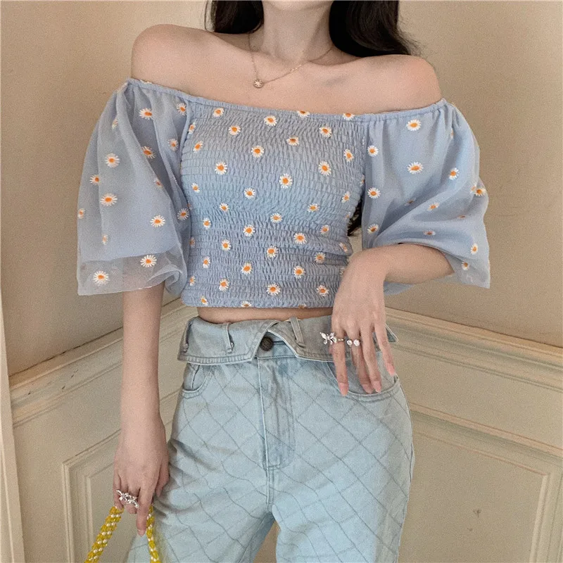 Блузка женская сетчатая с цветочным принтом, с вырезом лодочкой и рукавами-фонариками, DX129