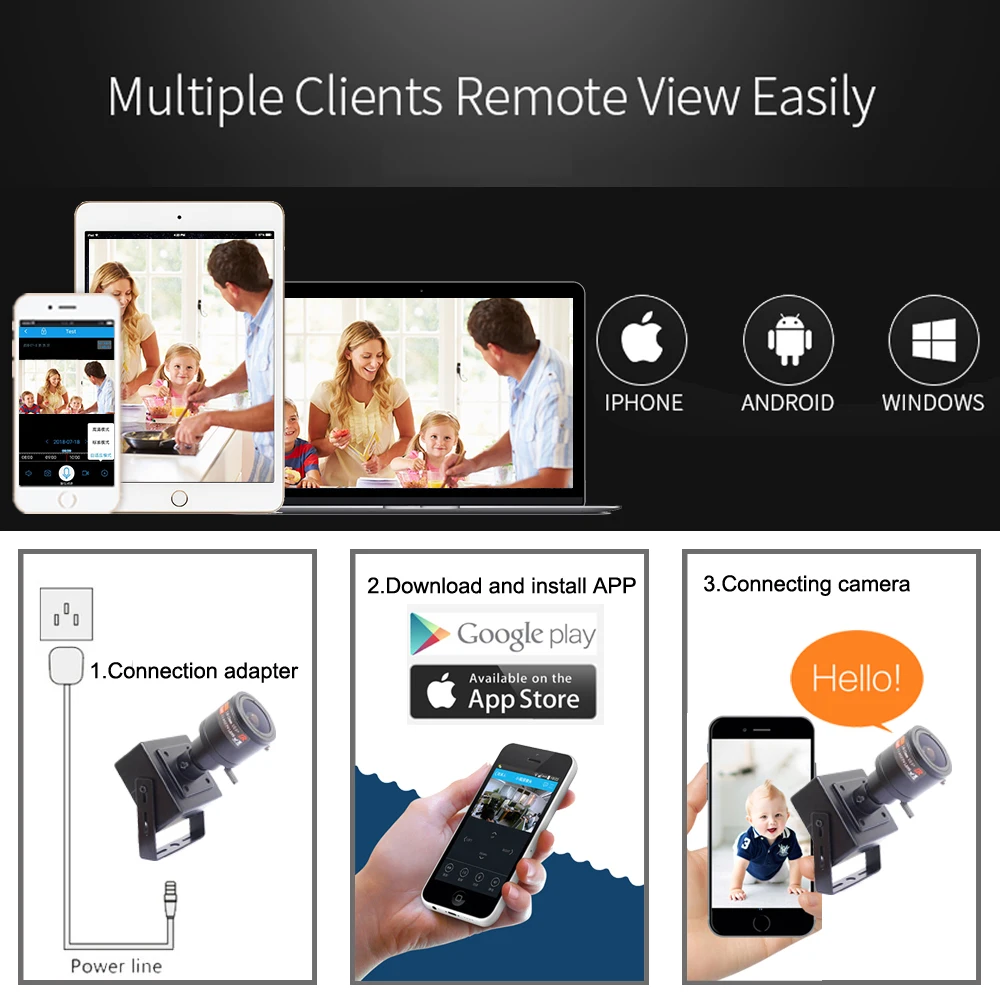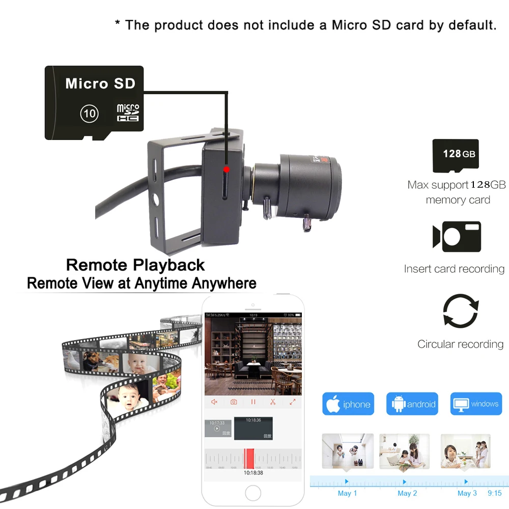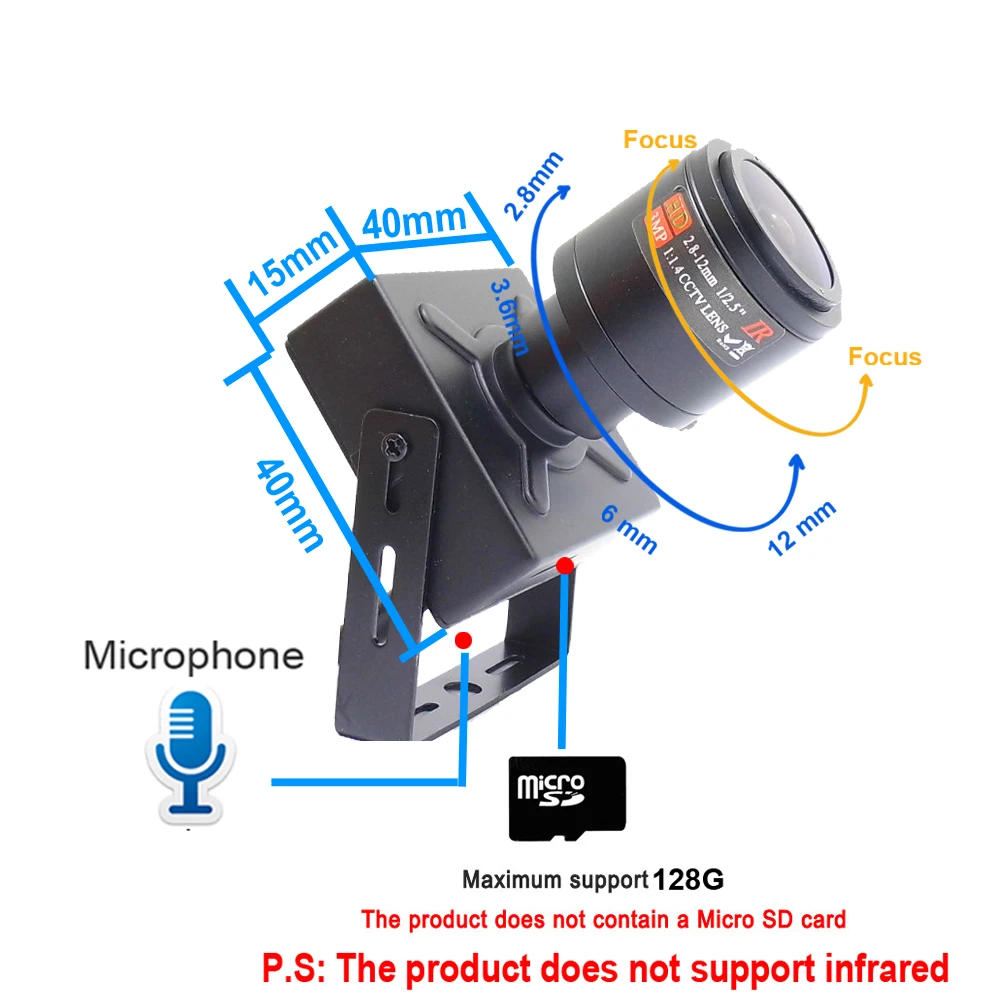 Меньший размер: 4 см * 4 см * 1,5 см Поддержка 2,8 мм-12 мм ручной зум-объектив Поддержка проводного сетевого кабеля Поддержка записи Micro SD (максимальная поддержка 128 г, продукт не включает карту Micro SD по умолчанию) Встроенный микрофон Поддержка разрешения HD (2560*1920 / 2560*1440) Поддержка компьютера, телефона Android, подключения iPhone