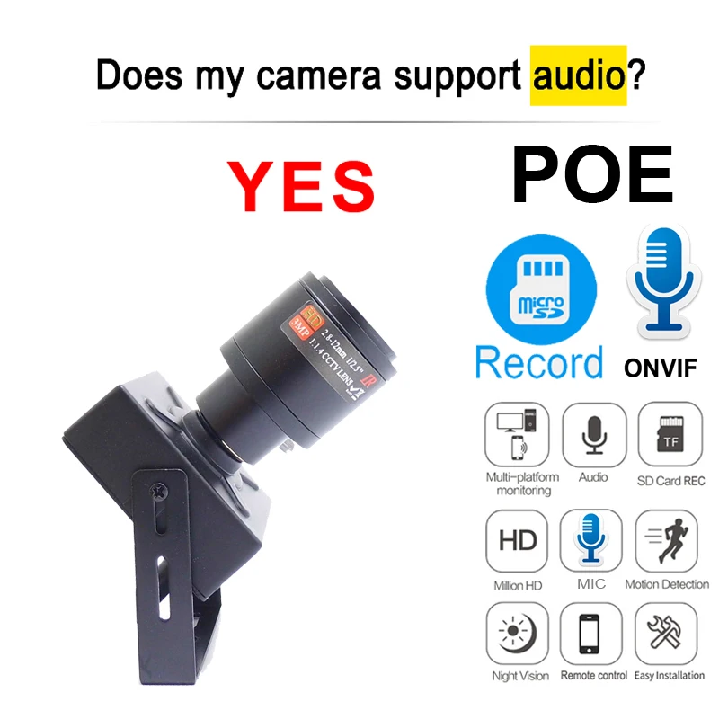 5 МП аудио ip-камера (2560*1920 / 2560*1440) Аудио запись Объектив: 2,8 мм-12 мм Руководство Поддержка Micro SD карты, до 128 Гб (не содержит Micro SD карты); Поддержка ONVIF, может работать с третьей вечерние NVR. Поддержка мобильного видеонаблюдения (iOS,android) Поддержка обнаружения движения и оповещения по электронной почте Встроенный микрофон Удаленное видео в реальном времени, звук в реальном времени Поддержка записи видео и звука