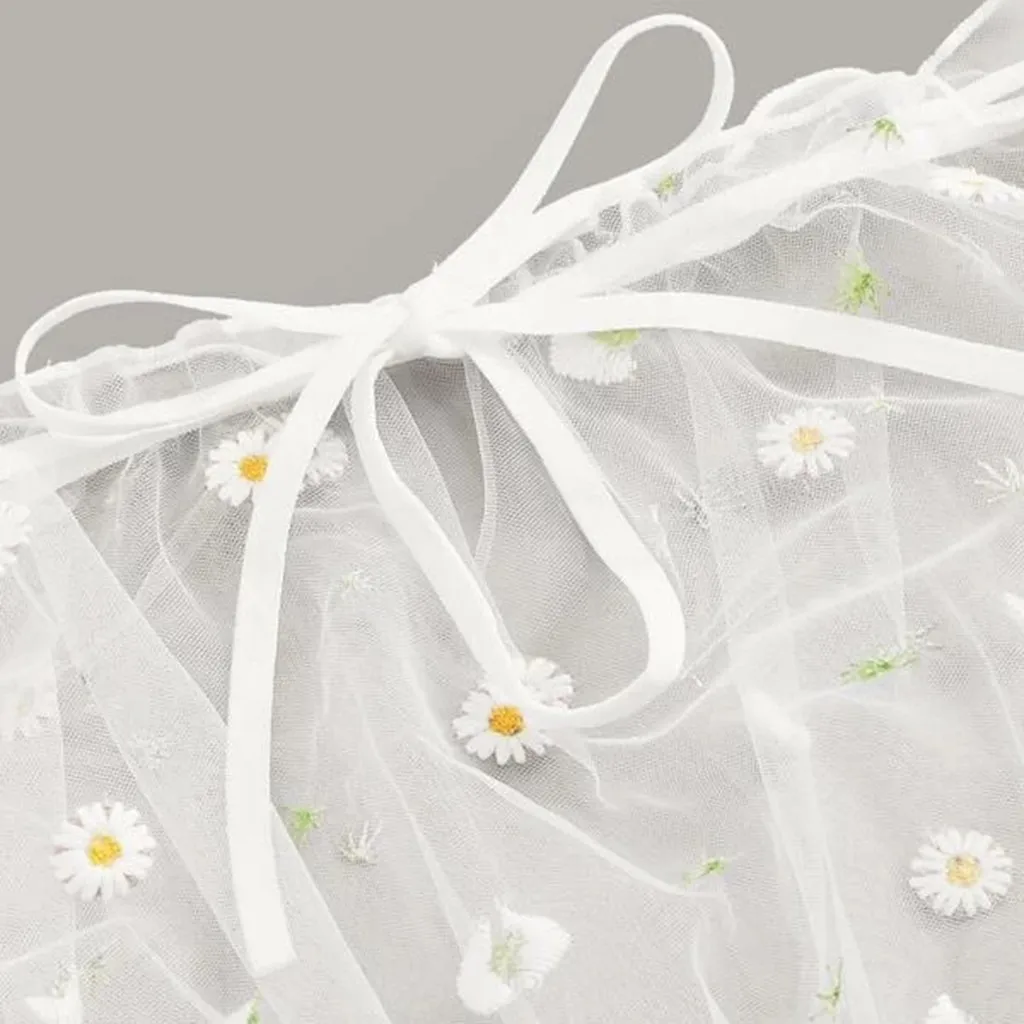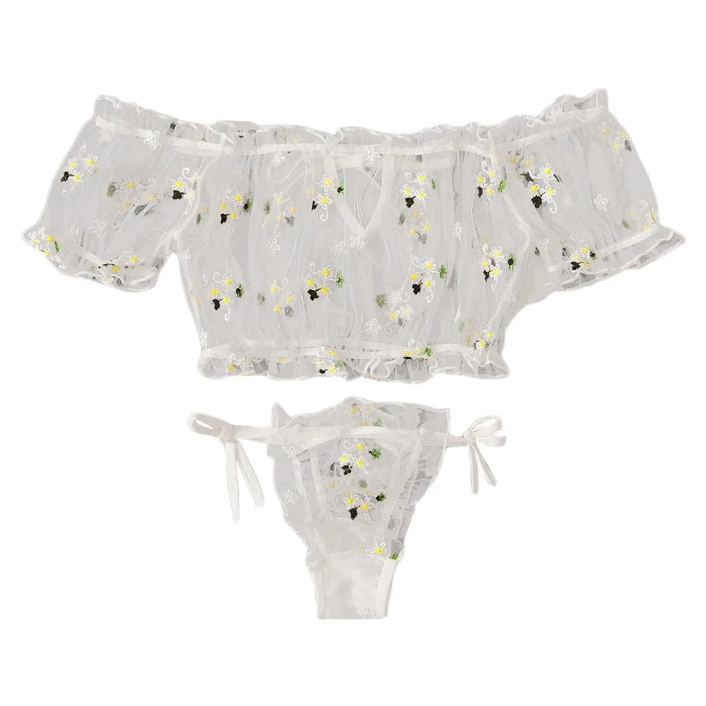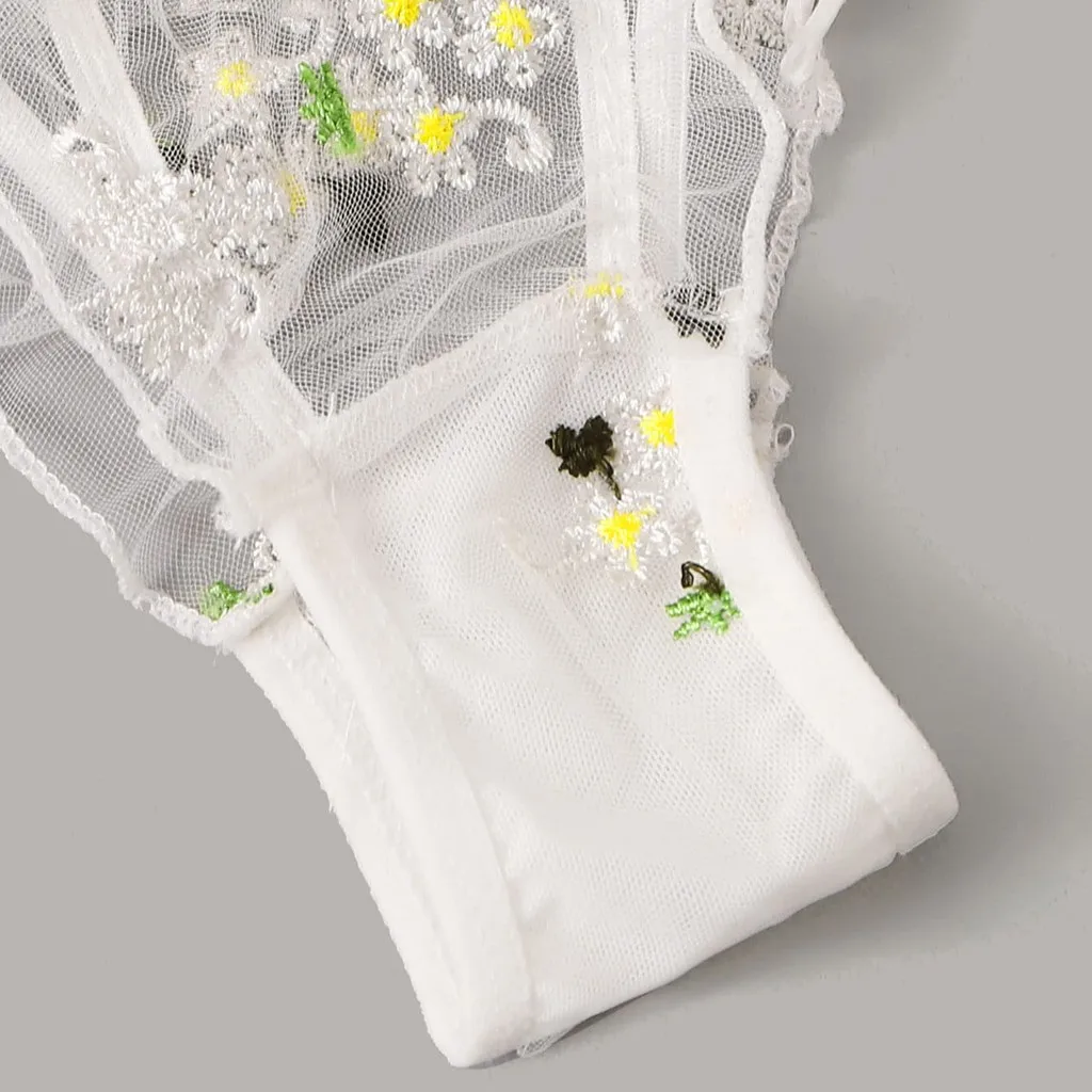 Женская кружевная Пижама без бретелек с вышивкой и бантом, бюстгальтер и тонкие прозрячные трусики в комплекте, женское нижнее белье, ночные костюмы с цветочной вышивкой
