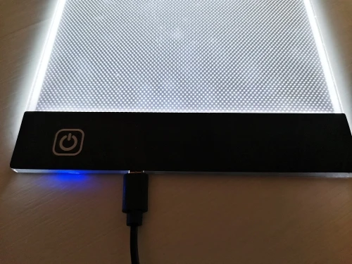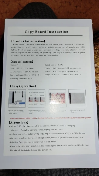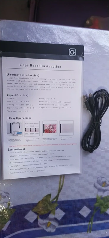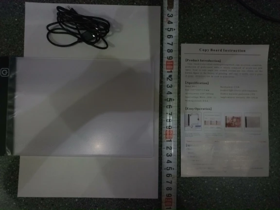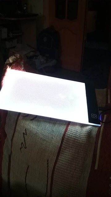 Отличная доска для копирования рисунка. Трехуровневая подсветка, достаточно яркая даже для плотной бумаги. В комплект входит провод с USB входом, можно подключить к ноутбуку , что весьма удобно. Продавцу спасибо за отличный товар!