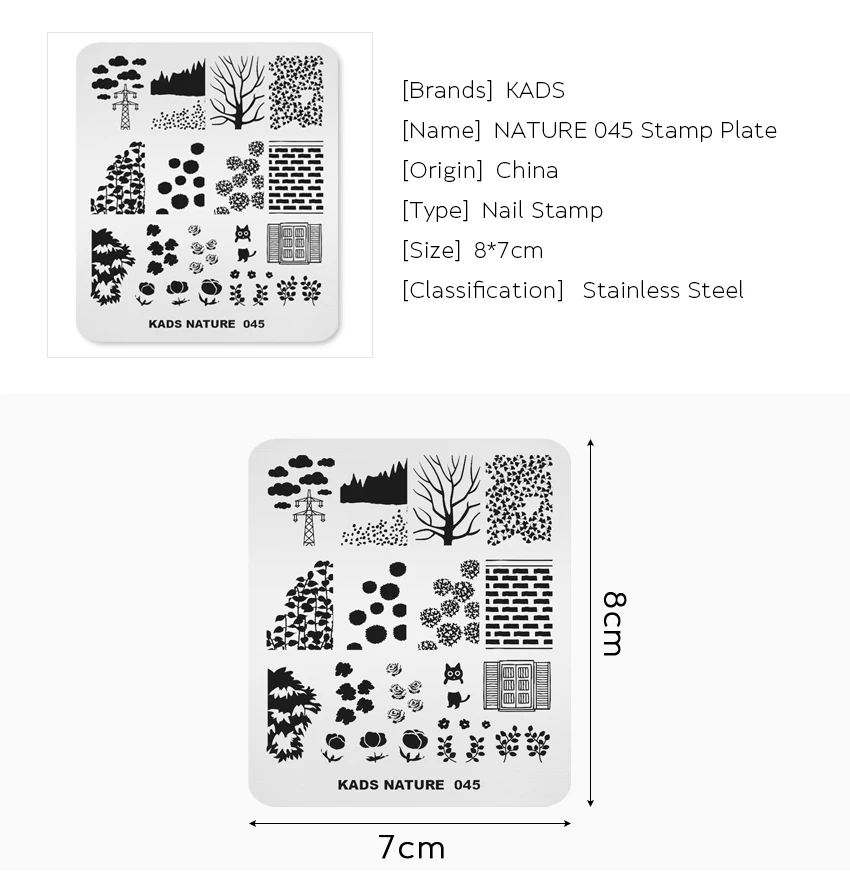 Описание: 1. Пластина для штамповки ногтей легкая, но она изготовлена из высококачественного материала из нержавеющей стали. 2. Штамповочные пластины, разработанные дизайнером KADS, обеспечивают ваш уникальный опыт дизайна ногтей. 3. Довольно хорошо Выгравированные пластины, дают вам лучший эффект штамповки, чем обычные штамповочные пластины. 4. Отличный шаблон для дизайна ногтей, простой в использовании, идеально подходит для домашнего использования. 5. Любой, кто любит делать свои ногти и не очень выдуманный! Не было никаких проблем делать свои собственные ногти с ним! 6. Штамп может выбрать изображение очень хорошо и легко для применения. 7. Дизайн ногтей штамп шаблон изображения пластины с красивым дизайном. Сделайте ваш ноготь более привлекательным. Особенности: 100% Новинка и высокое качество Обратный шаблон дизайна. Материал: нержавеющая сталь Размер пластины: 2,75*3,14 дюйма/8*7 см В комплект входит: 1 шт. природа 045 штамповочная пластина Инструкции по уходу за изделием Пластина защищена тонкой прозрачной защитной пленкой, пожалуйста, Снимите пленку перед использованием, так что лак для ногтей может быть передан штампом. Использование: 1. Нанесите Базовое покрытие или обычный лак на ноготь. 2. Нанесите лак на желаемое изображение внутри пластины. (Рекомендуется: Используйте однотонный лак для ногтей, так что текстура будет толще, чем у других лаков для ногтей) 3. Сделайте скребок, наклонившись на 45 градусов, и быстро и сильно удалите чрезмерную полировку изнутри и снаружи. 4. Немедленно нажмите на штамп плавным движением, чтобы подобрать дизайн. Изображение переносится на штамп. 5. Нанесите изображение на ноготь мягкими движениями. Изображение переносится на ноготь. 6. Повторите вышеуказанные шаги для всех ваших ногтей. 7. После штамповки ногтей нанесите верхнее покрытие для длительного ношения.