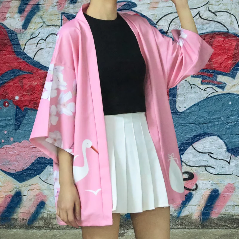 Кимоно женское с принтом Журавля, свободная рубашка в японском стиле Харадзюку, повседневный жакет, юката, пальто для пар, лето