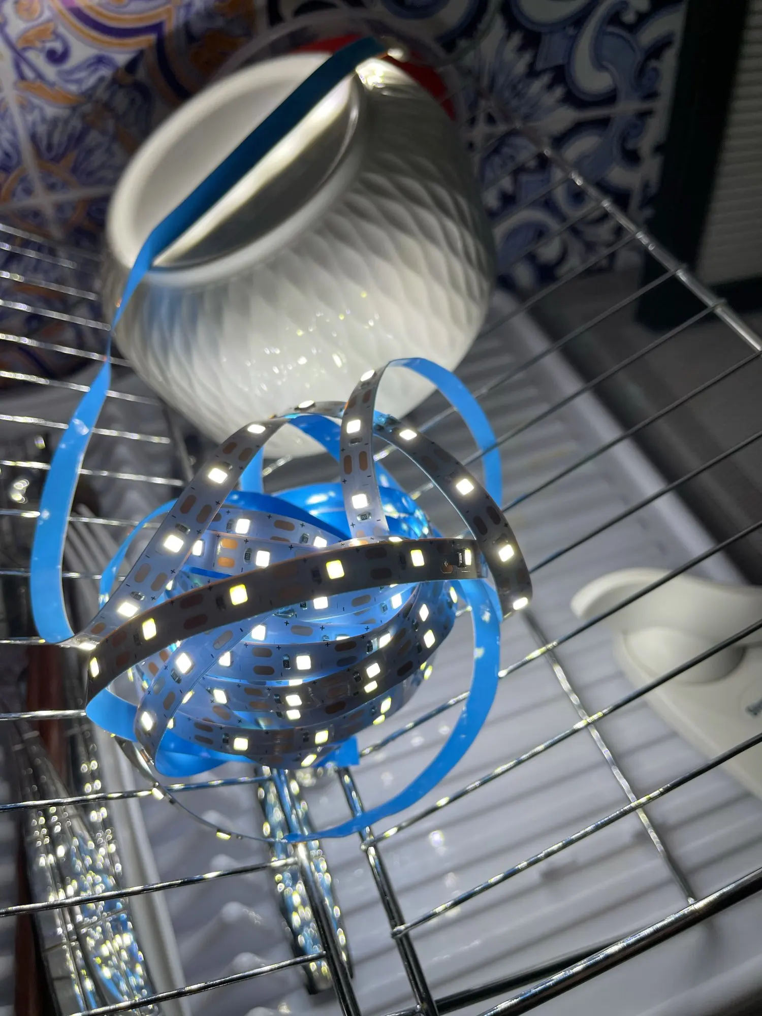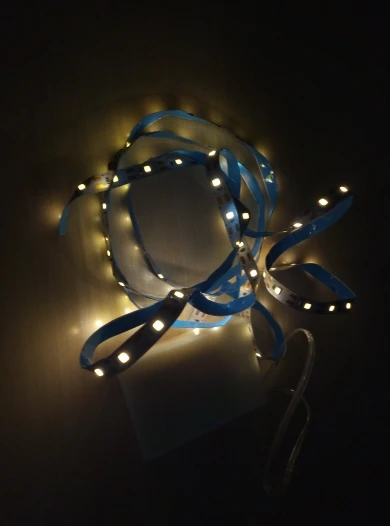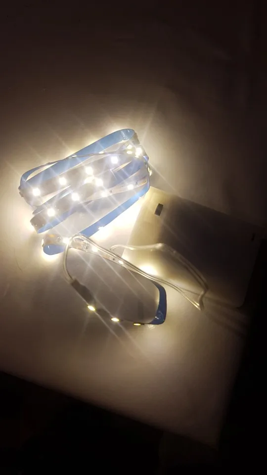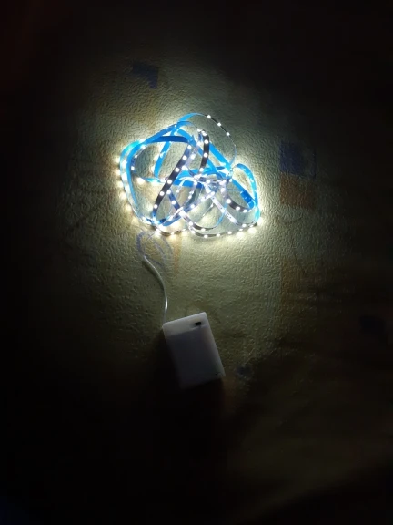 Впечатляющий, Светодиодная лента имеет клейкую полоску, и вы можете приклеить ее, хороший свет по цене, которую она имеет, чтобы поставить наклейку на светодиодную ленту только 190 с переключателем 200, аккумуляторы не включены. Есть то, что они длятся. I Will buy again.