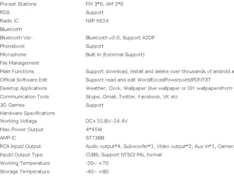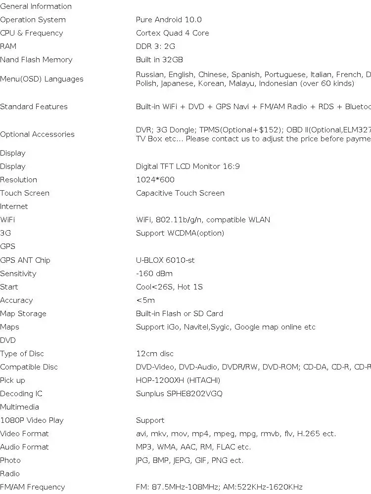 Радио тюнер/RDS /FM / GPS навигация/Wifi /Bluetooth/Управление на руль/Разделенный экран/USB /SD/сенсорный экран/1024*600 /Mirror Link/камера заднего вида/карта/Сабвуфер/DVD /CD плеер (некоторые элементы не поддерживают)