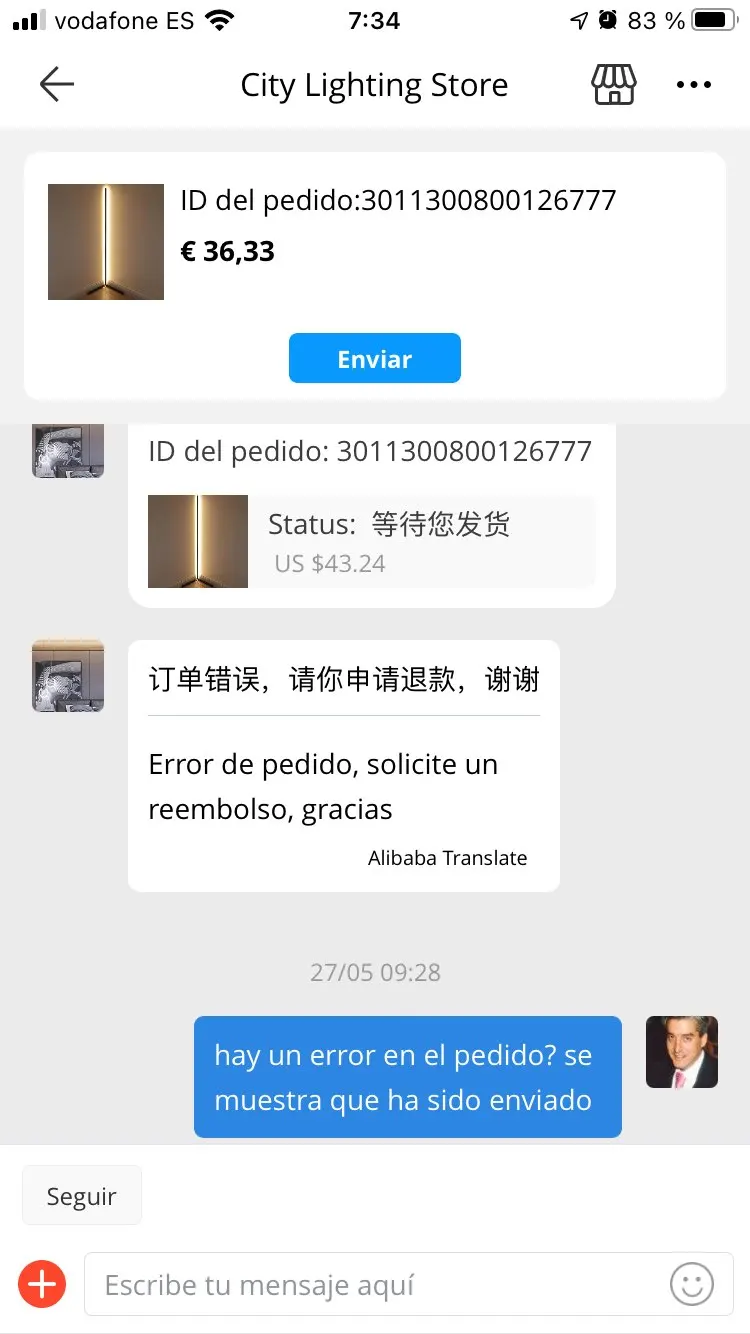 Я покупаю 27 мая. Это указывает на то, что возникла проблема, которая просит вернуть деньги, и все же помечает его как отправленный. Видя, что он не прибывает и просит вернуть деньги, в споре он утверждает, что уже доставил его мне, что я отправляю его 23 (4 дня до покупки), И он доставил его мне 27. Он мошенник, и он взимает отслеживание других заказов. Я не знаю по ошибке, так как вы настаиваете на своих словах