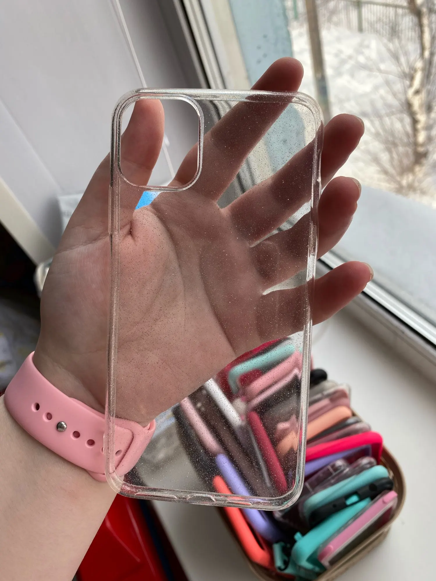Он пришел примерно через два месяца. Чехол идеально подходит, в нем много блесток. Но он не выглядит так, как на картинке. На картинке он имеет меньше блесток, чем в реальной жизни.