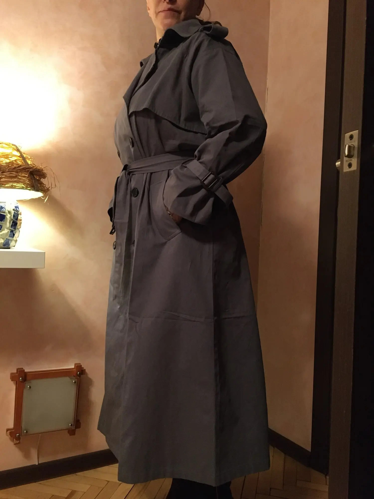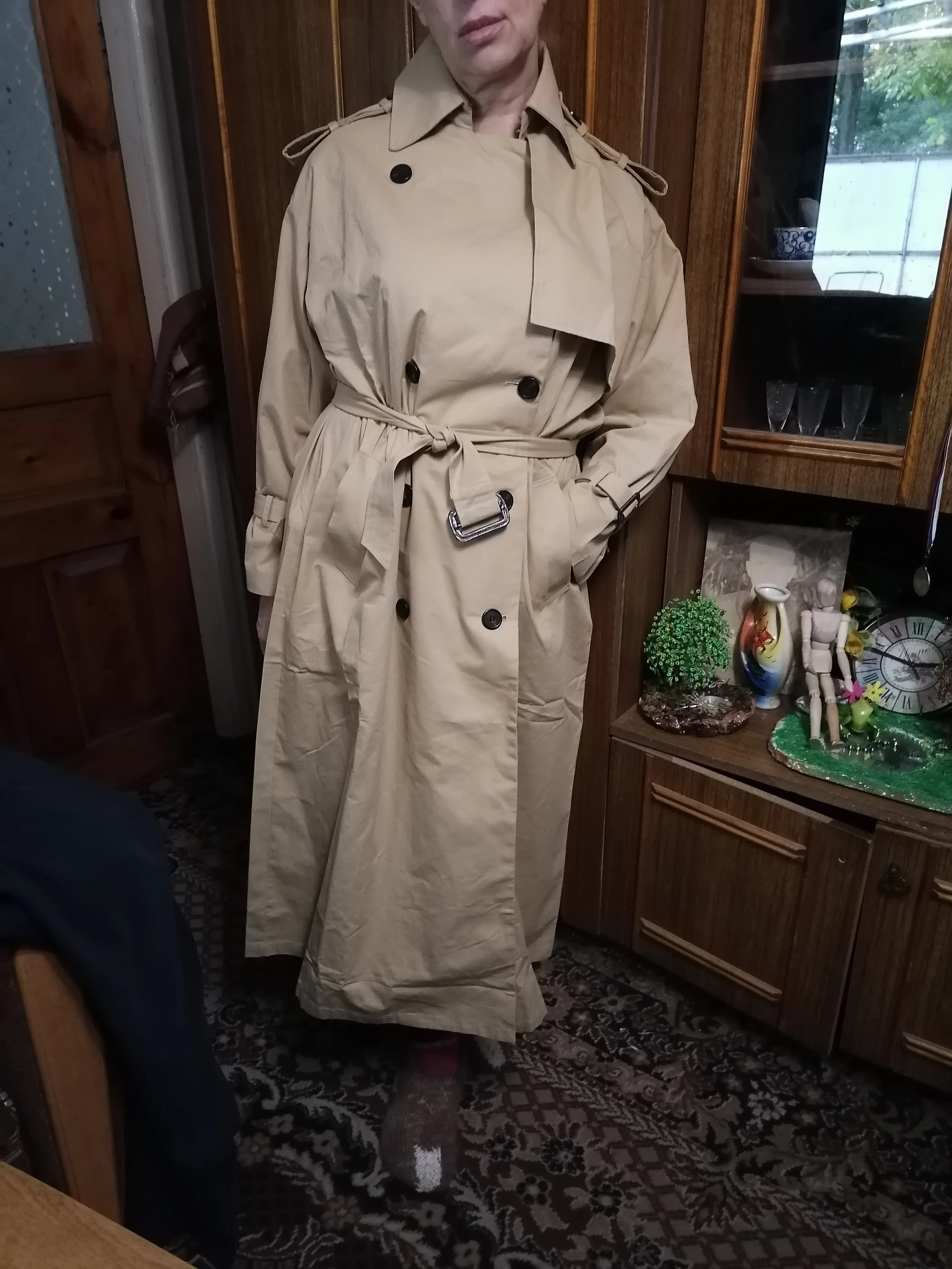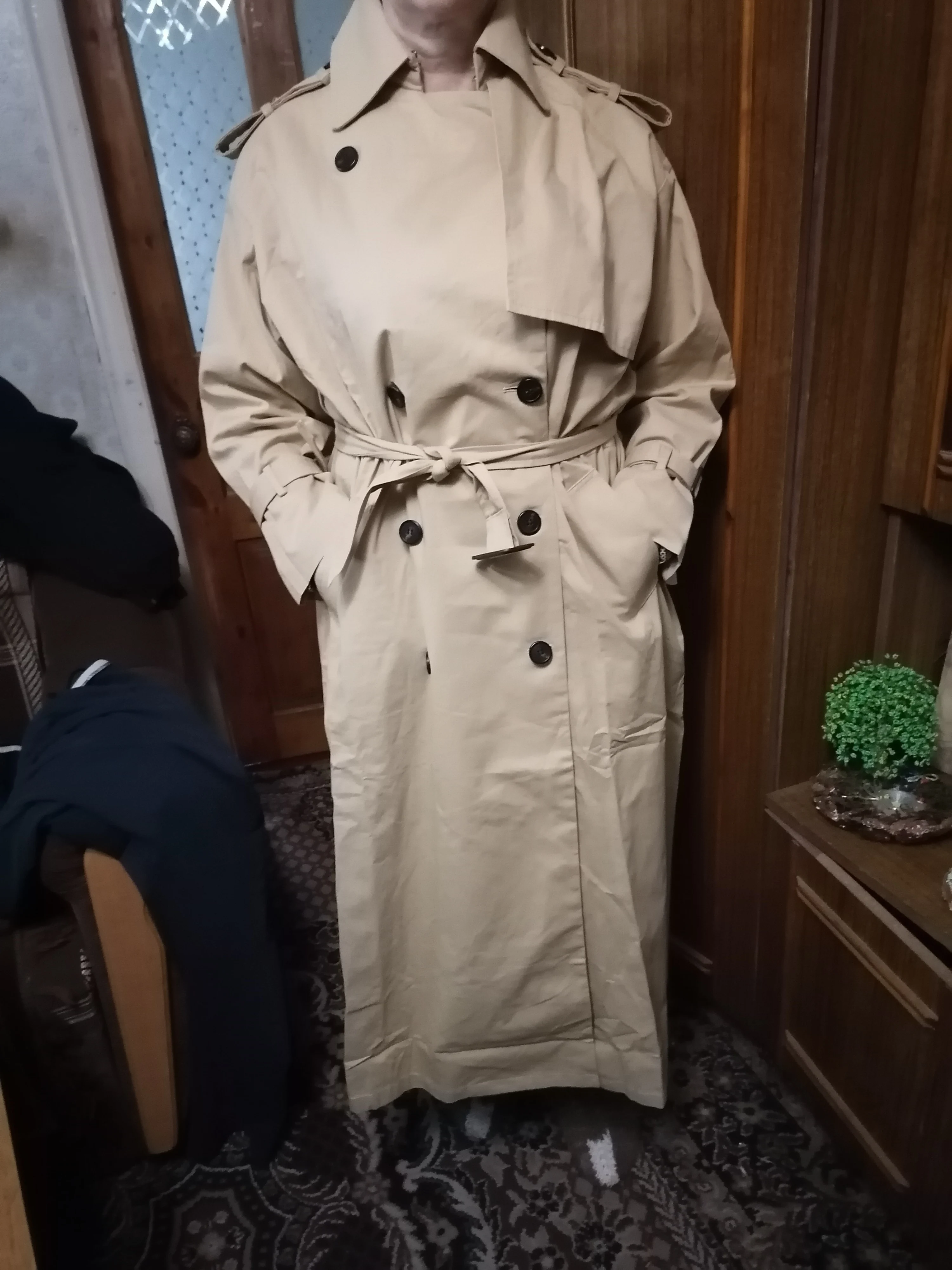 Я в восторге! Шикарный тренч. На рост 170 см - идеальная длина. Размер L сел отлично, оверсайз как и хотела. Да вырез сзади высоковат и талия выше моей, но ателье с этими мелочами справится! Я довольна, материал качественный, хоть и лёгенький. И наверное, хотелось бы пояс чуть длинне, чтобы можно было на узел завязать. Но в остальном - супер!!! Продавец - умничка, выслал по запросу фото тренча, чтобы я посмотрела цвет и ткань.