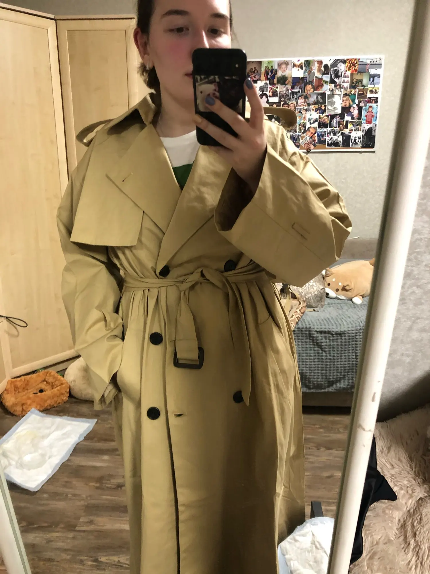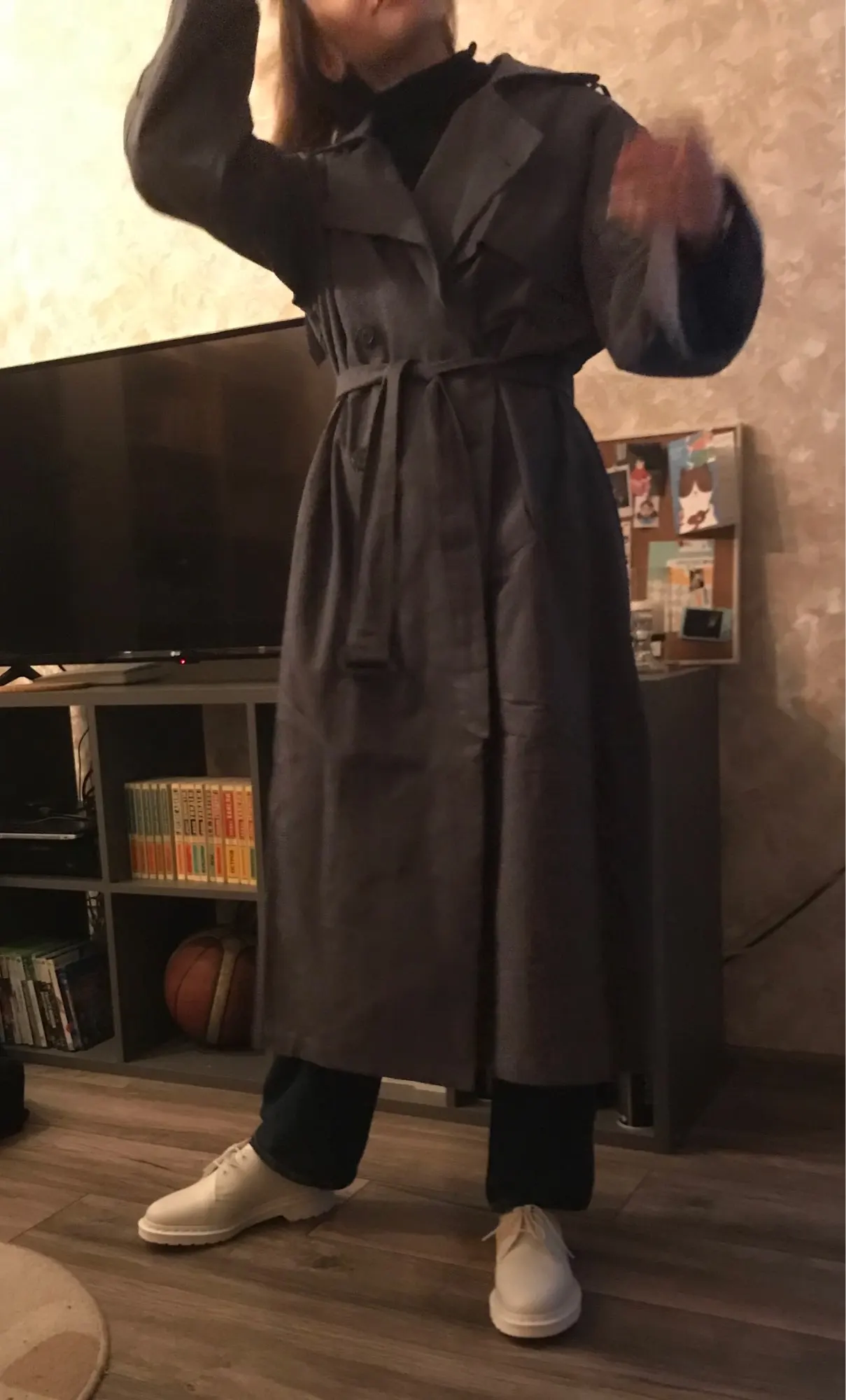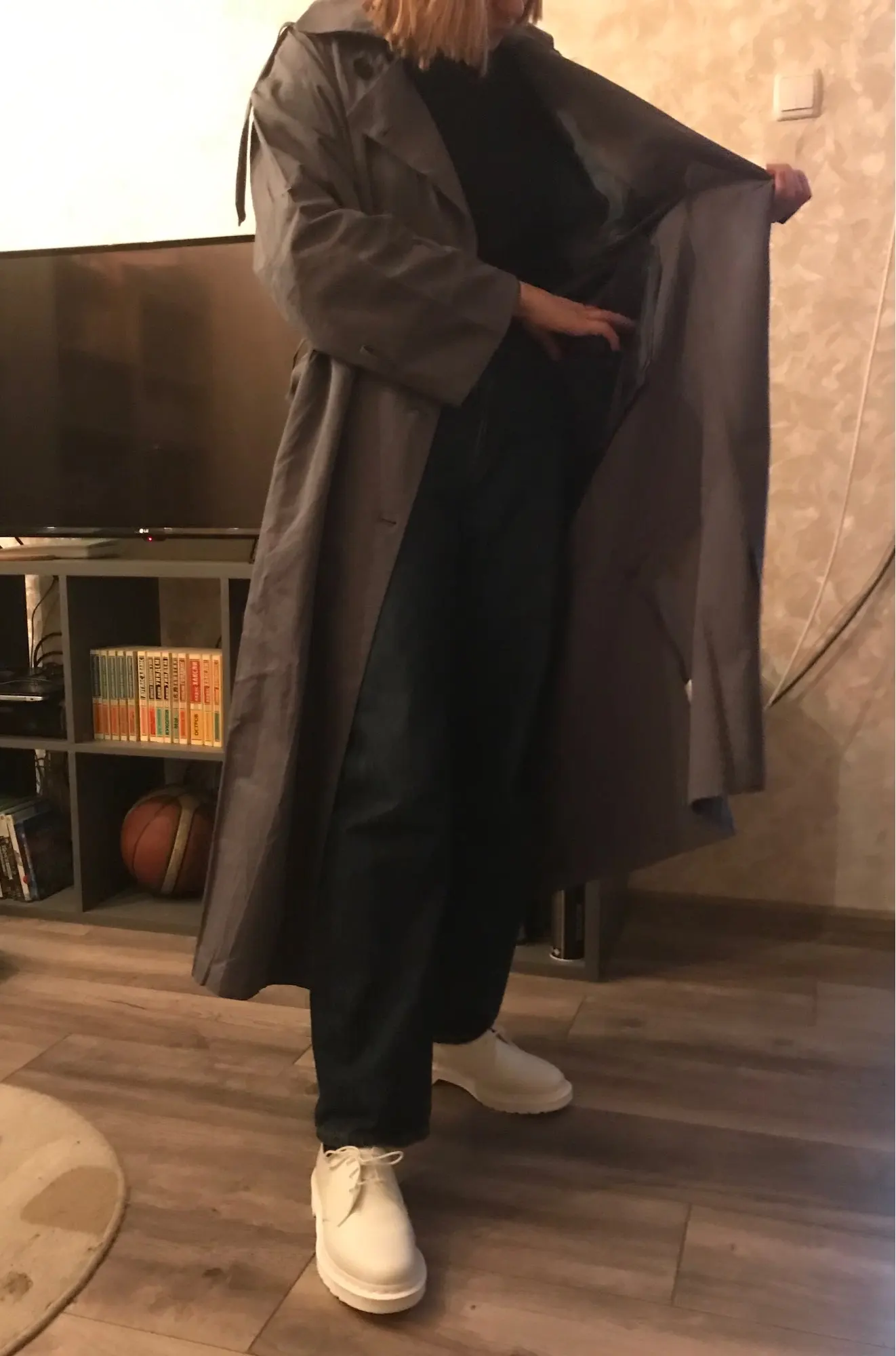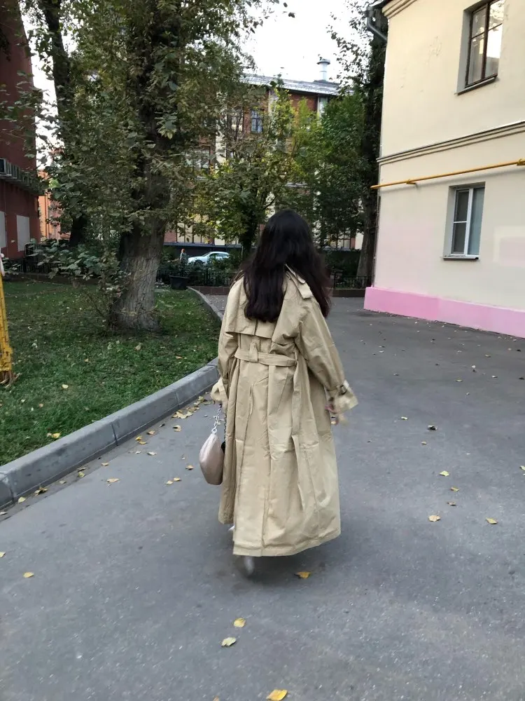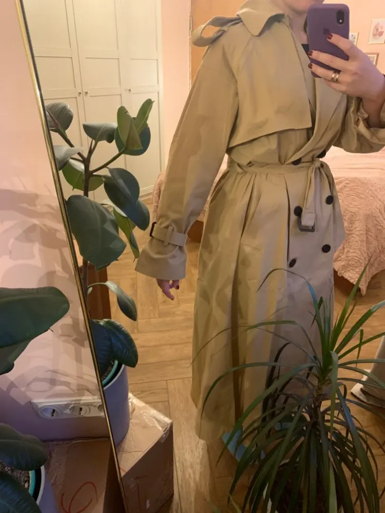 Отличный тренч! В жизни выглядит реально как с фоток, главное - хорошенько его отпарить. Подобные в Москве в магазинах стоят от 7000₽, а если и есть схожие по цене, то они короткие. Он, конечно, совсем не теплый, но вместе с курткой Юникло под низ можно ходить до +7 градусов. Очень сильный вырез сзади, который расходится, но это ничего, я его сама зашиваю.