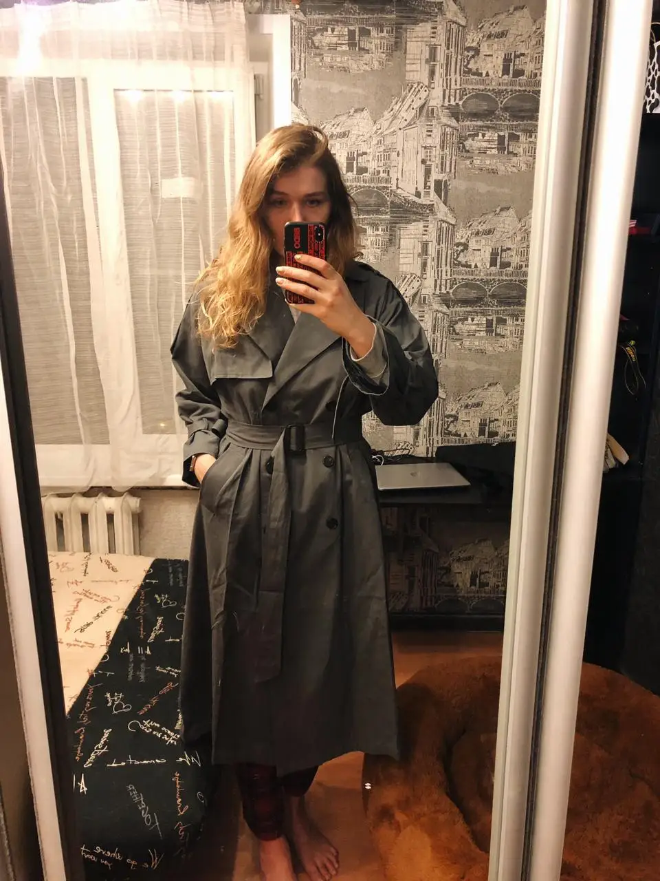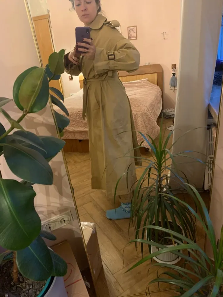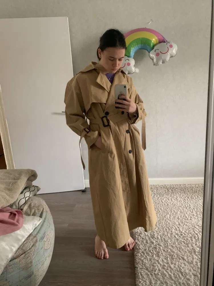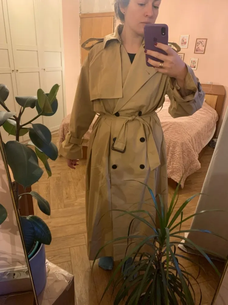 Тренч волшебный. Искала максимально длинный, чтоб прям почти до земли. Пришел за пару недель. Параметры 88/62/102, рост 170. Сидит свободно, мб чуть оверсайз, не сковывает