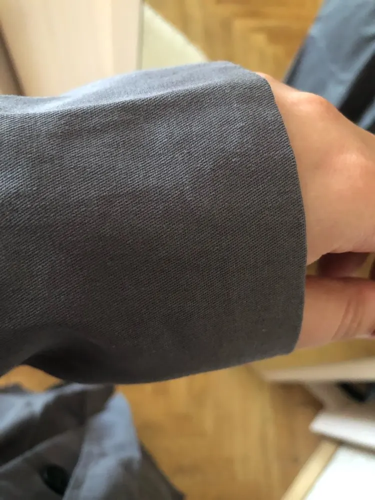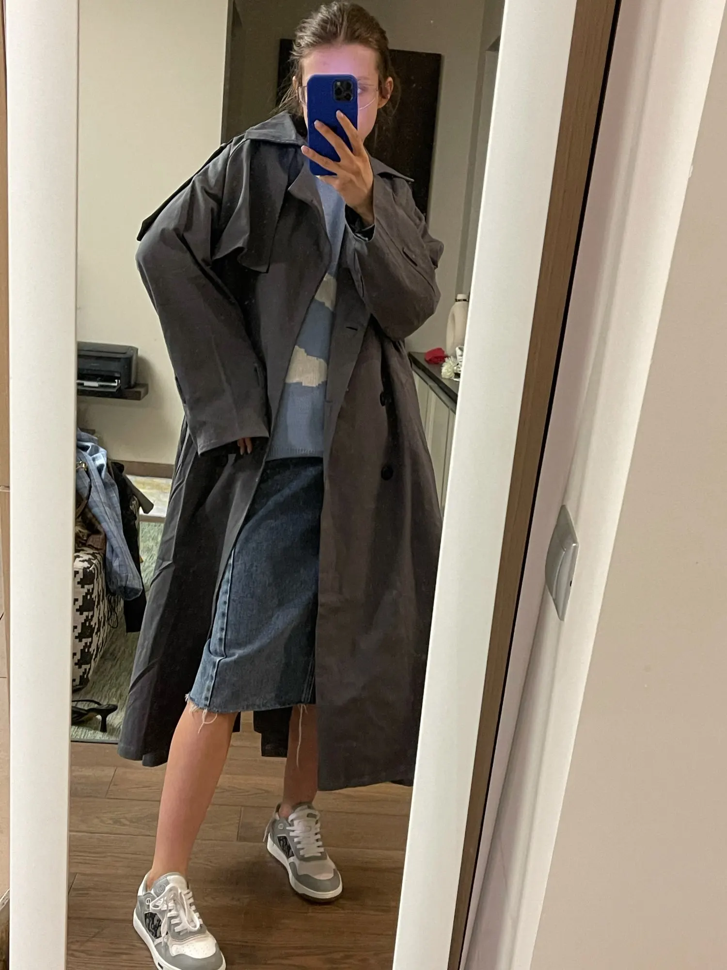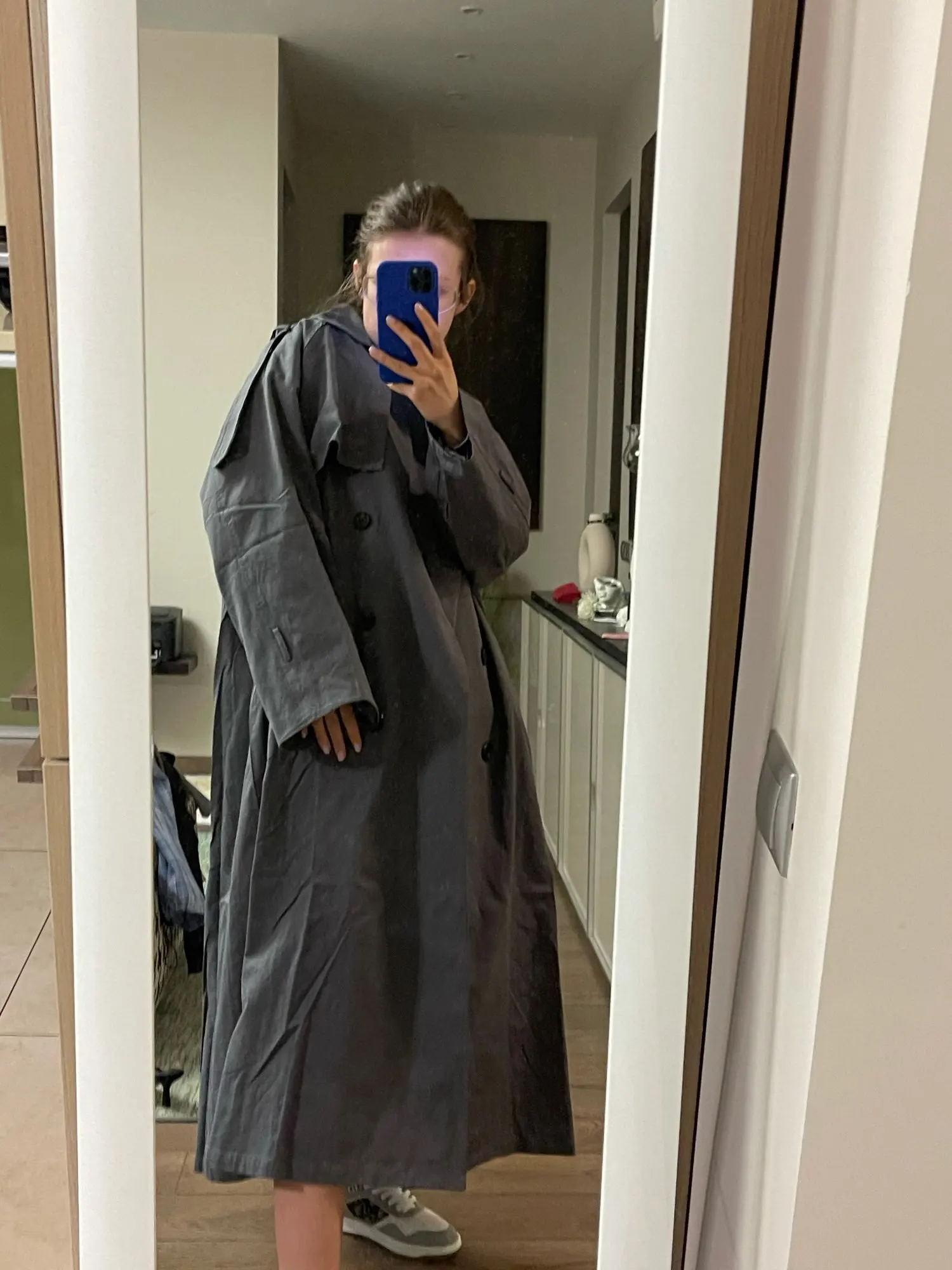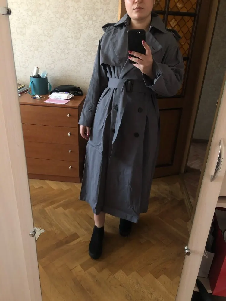 Взяла размер М на рост 164 (размер одежды S). Получила очень приятный оверсайз. Рукава сели хорошо по длине, подвороты делать не надо. Длина тренча на мой рост - чуть выше щиколотки. Переживала из-за разреза сзади, про который многие писали (он начинался чуть ли не от попы). Разрез идет от колена. То ли поменяли высоту разреза, то ли ранее брак был, не знаю. Ткань хорошая, похоже на плотный хлопок. Подклад есть в верхней части, от пояса вниз его нет. На весну хорошо, особенно с нижней тонкой курткой (типа uniqlo). Качество швов отменное. Серый оттенок глубокий, красиво смотрится. Тренч огнишко, в общем! Пришел за 1,5 недели в москву