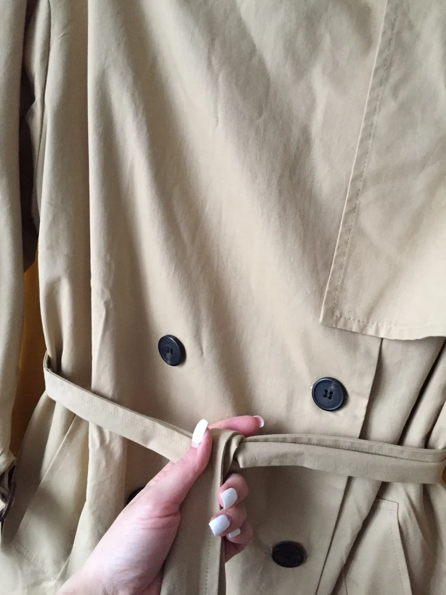 Тренч просто восторг! 10/10! Обычно ношу размер xs/S, почитав отзывы , взяла L и не ошиблась, хотелось оверсайз. Рукав и длина просто идеально ( мой рост 168). Очень качественно сшит, нигде ни ниточки торчащей. Цвет как на фото. Плюс доставка быстрая. В магазине такой будет стоить минимум 6к.