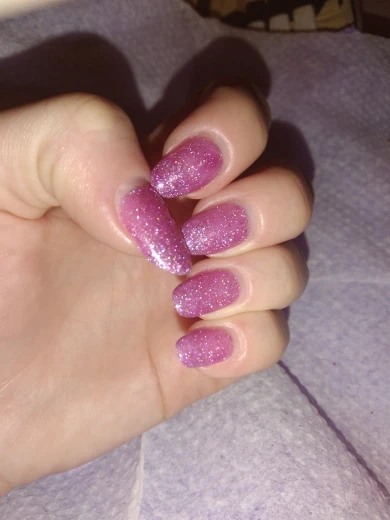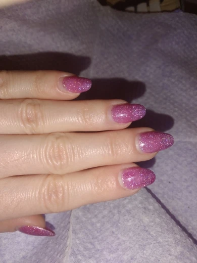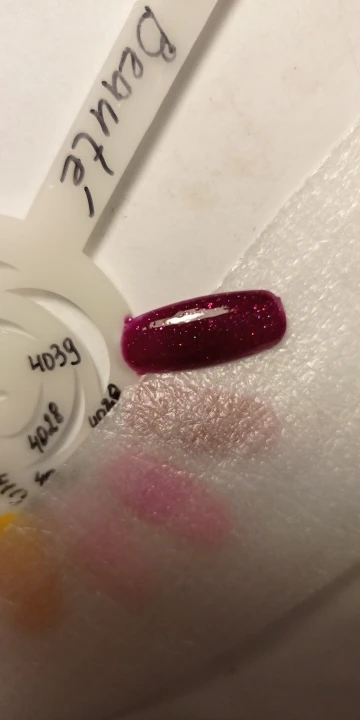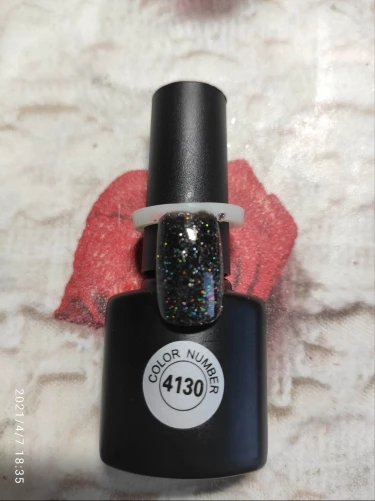 Лак до г. Омска доехал за 62 дня, очень долго, отслеживался до РФ. Пришел в целости, наполняемость ожидаемая, около половины. Цвет красивый, на малиновом фоне множество цветных блесток, в тени выглядят как серебристые, на солнце мерцают, красила в 2 слоя.