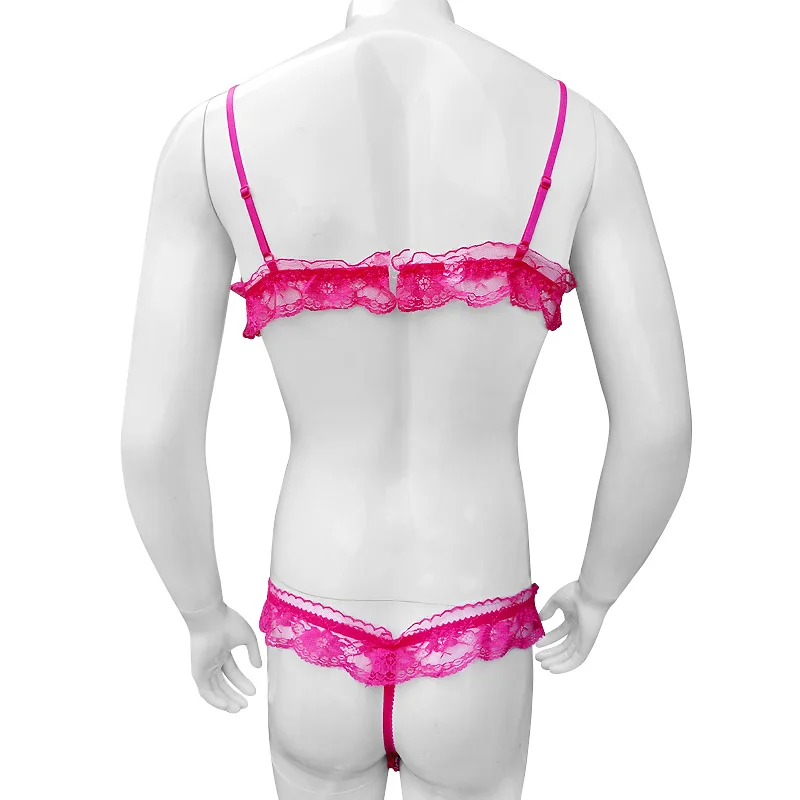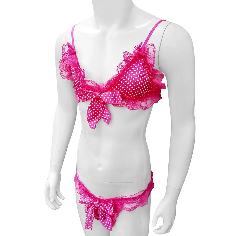 Комплект кружевного нижнего белья для мужчин, бюстгальтер с цветочными оборками, стринги, атлас в горошек, регулируемые бретельки, одежда для клуба и ночной жизни