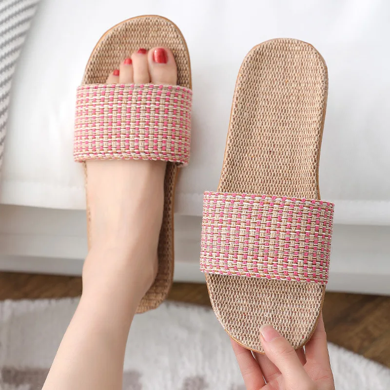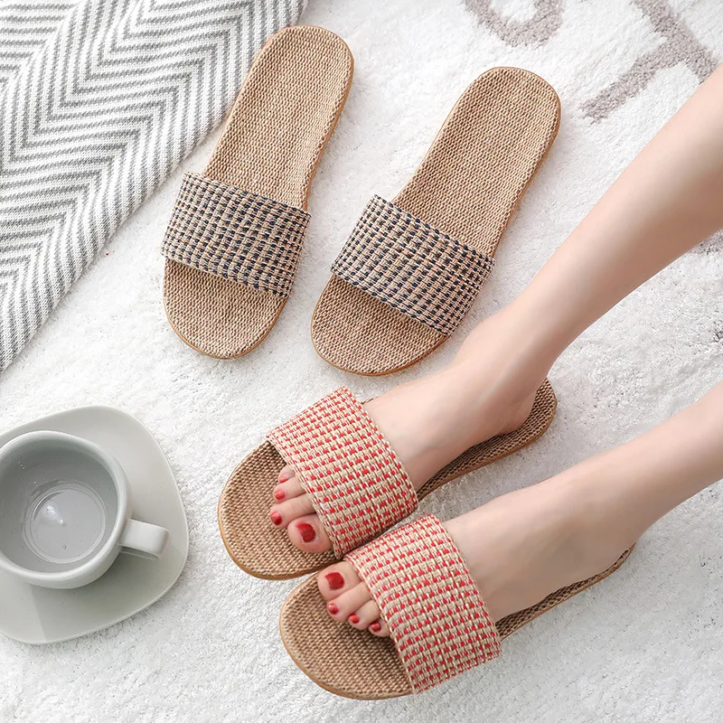Suihyungженские тапочки льняные; Новинка 2021 года; Летняя пляжная обувь для влюбленных; Повседневные шлепанцы в клетку из пеньковой ткани на плоской подошве; Женские вьетнамки