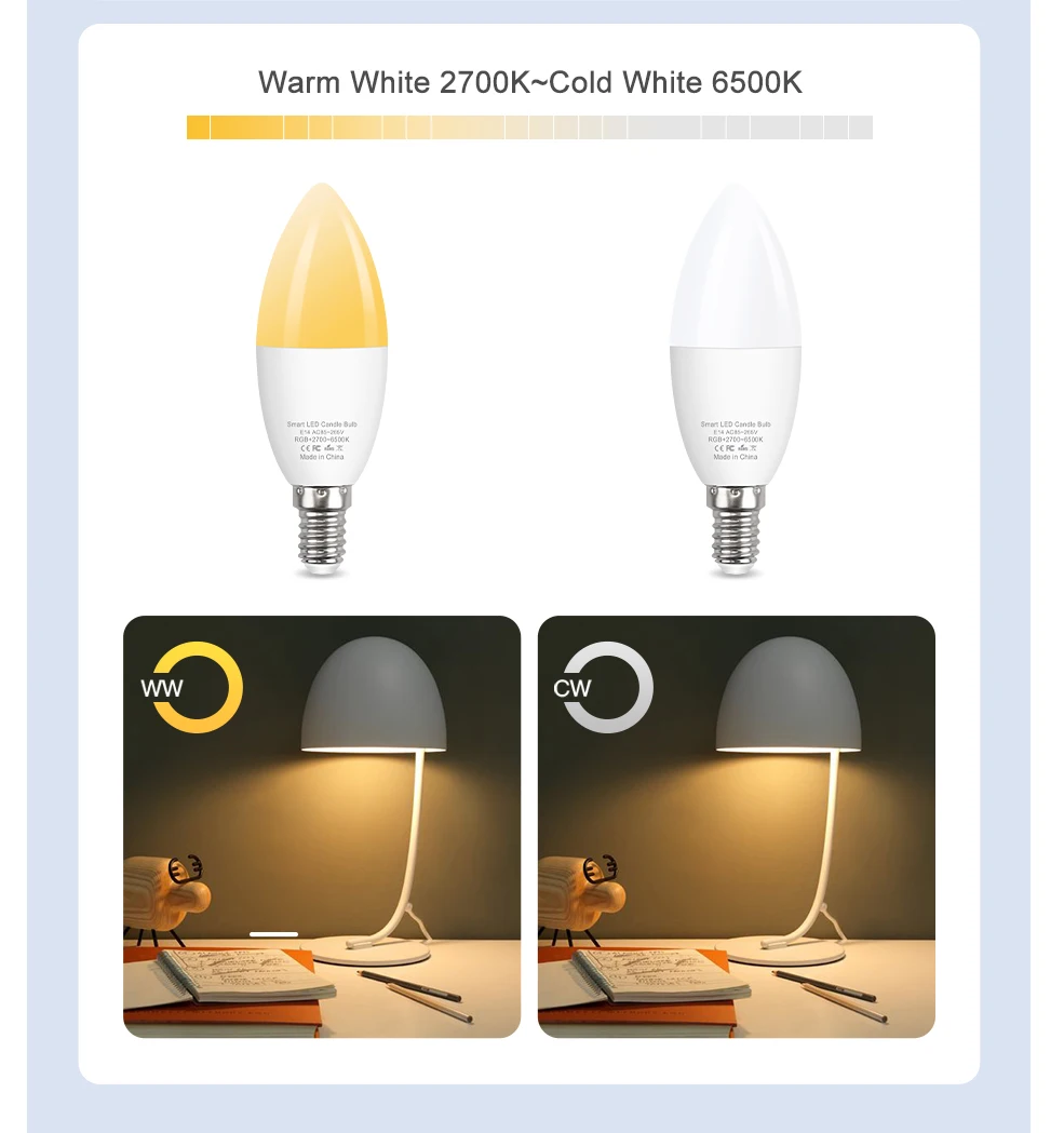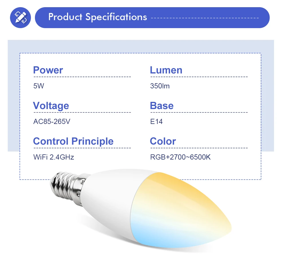 Тип: свечаСветильник Цвет: RGBCWГнездо: E14Приложение: smart lifeВходное напряжение: AC85-265VМощность: 5 ВтБеспроводной Тип: Wi-Fi 2,4 ГГц