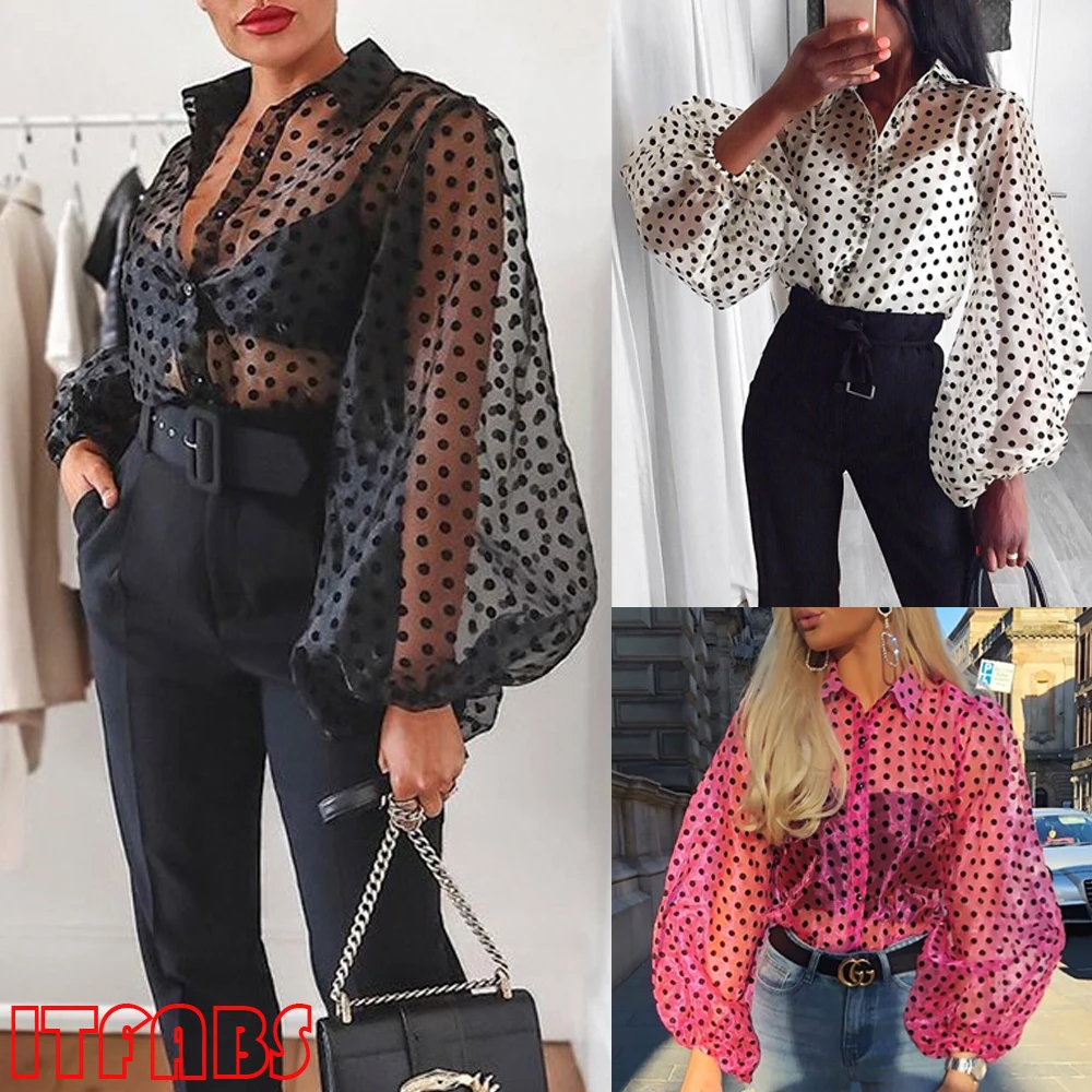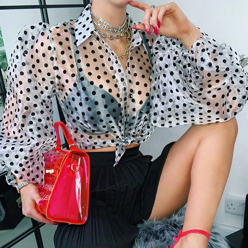 Женская пикантная сетчатая прозрачная блузка в горошек, рубашки с п...