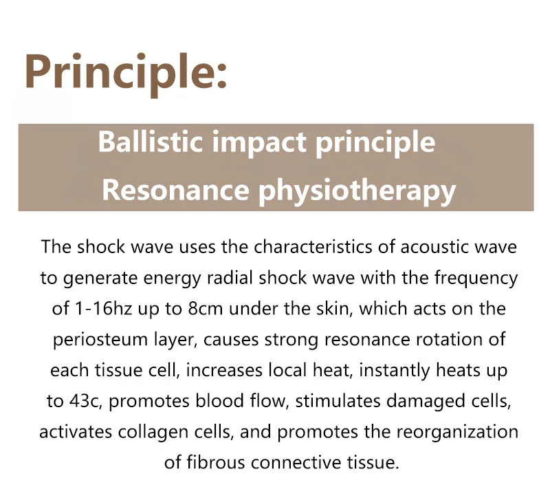 2. Ударная Волна может изменить химическую среду места повреждения, что делает ткани производят и отпускают химикаты, предотвращающие боль. Между тем, ударная волна может разрушить мембрану болевого рецептора, подавить производство и распространение болевых сигналов. Кроме того, ударная волна вызывает выработку эндорфина, уменьшая чувствительность места повреждения к боли.