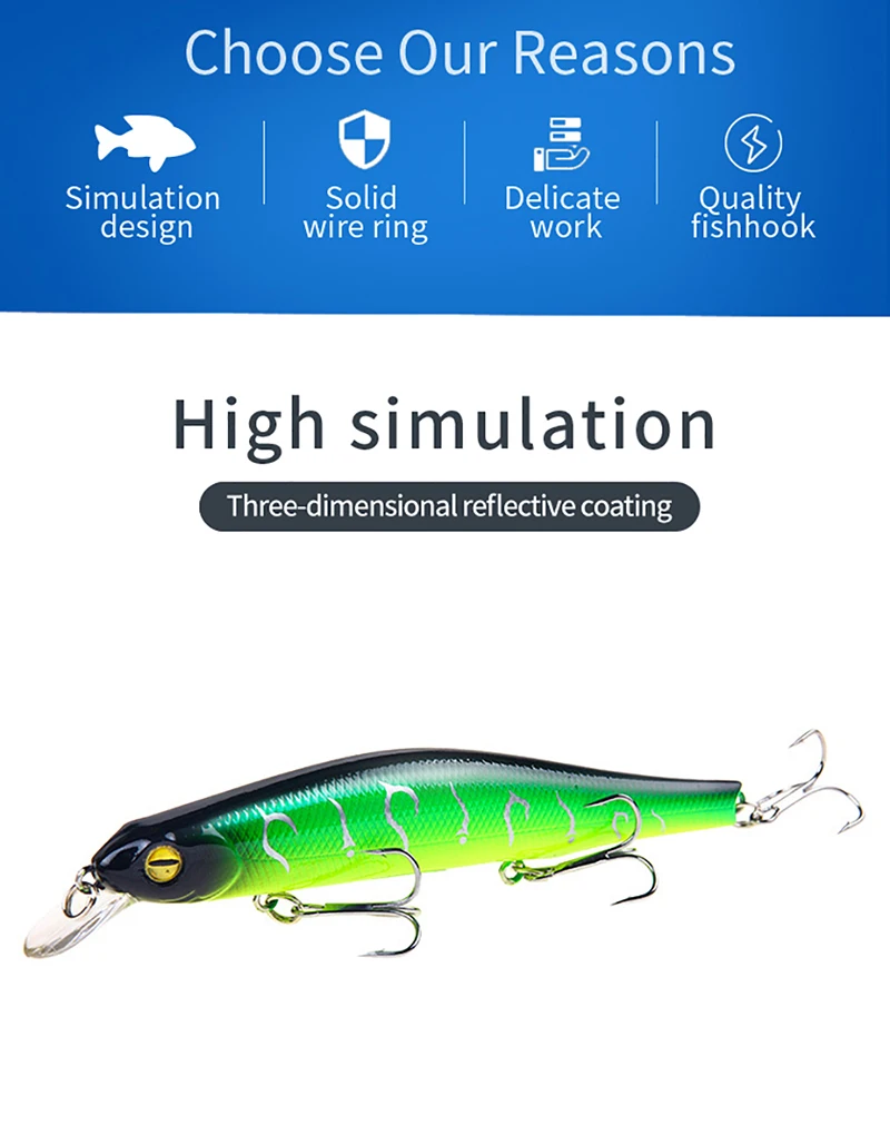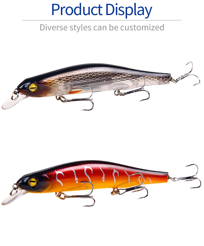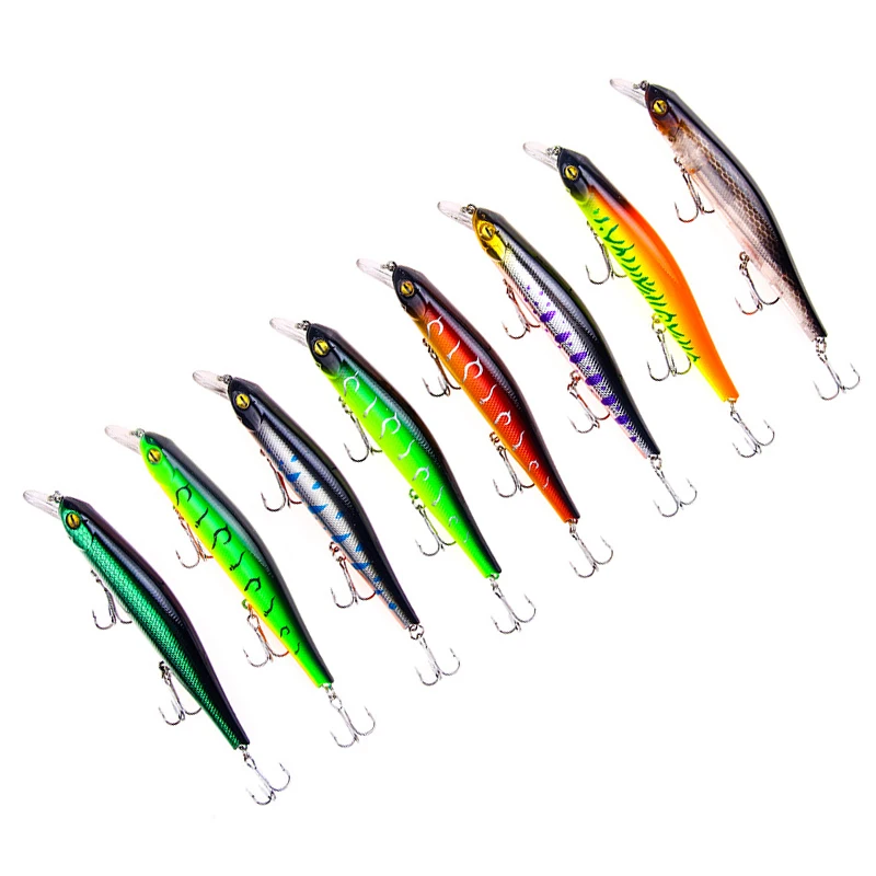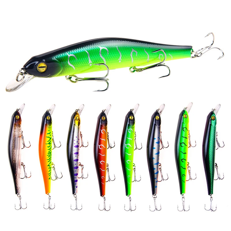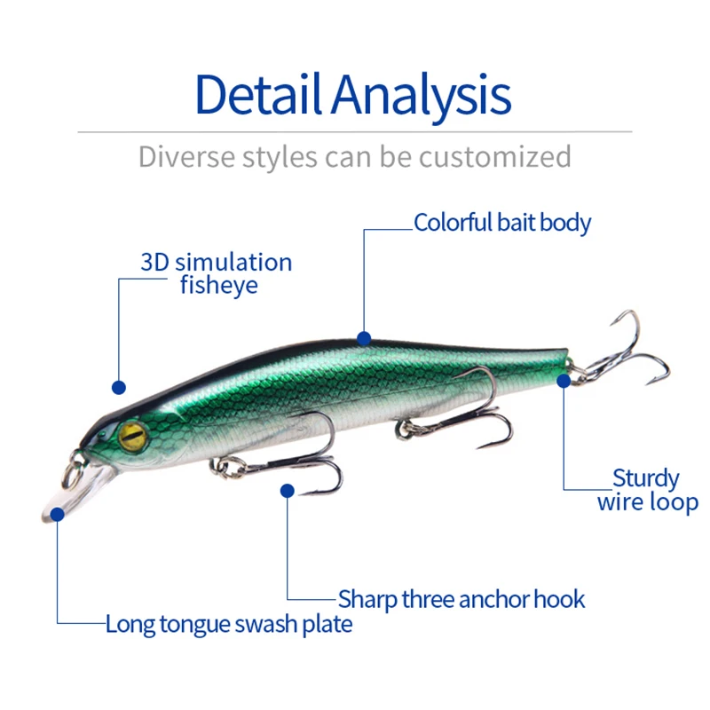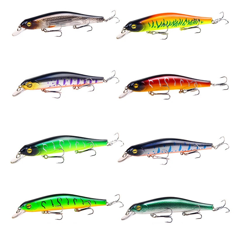 Тип: Искусственная приманка Название продукта: приманка для ловли гольяна Вес: 17,7 г Длина: 12,5 см Глубина погружения: 0,5-1,5 м Тип крючков: тройной крючок из высокоуглеродистой стали Цвет: 8 цветов, цвет s с 3 рыболовными крючками Материал: АБС-пластик Упаковка: 1 шт. в полиэтиленовом пакете