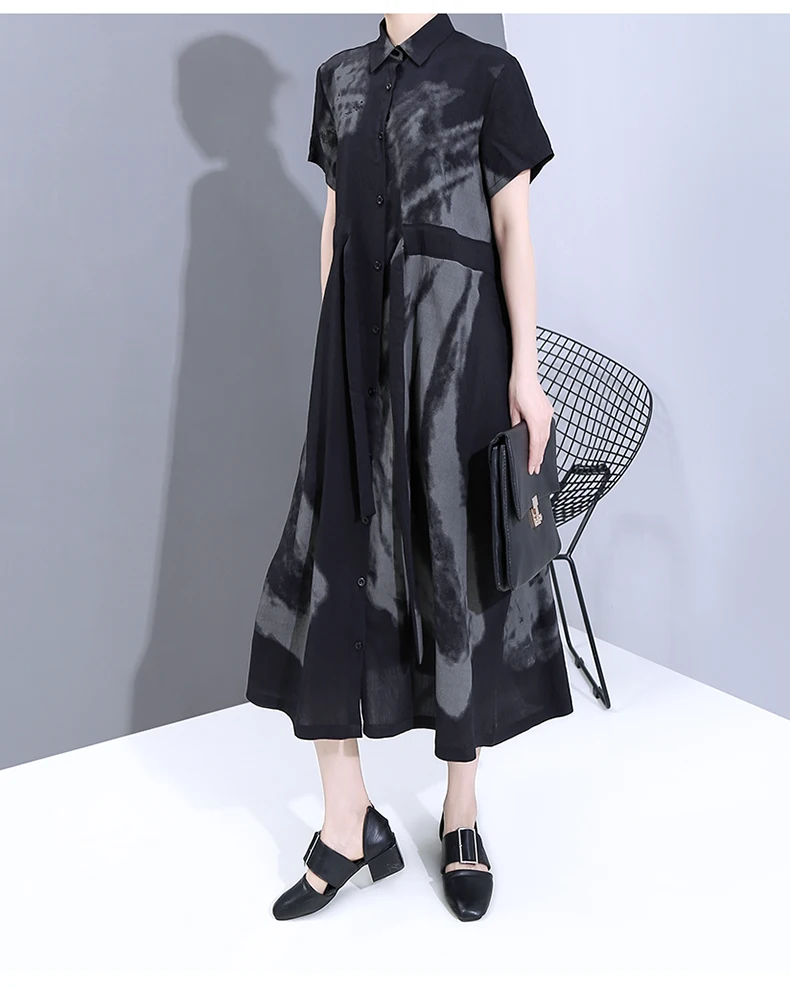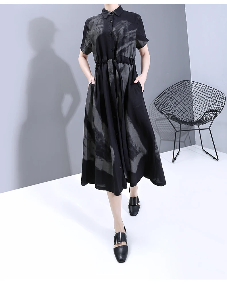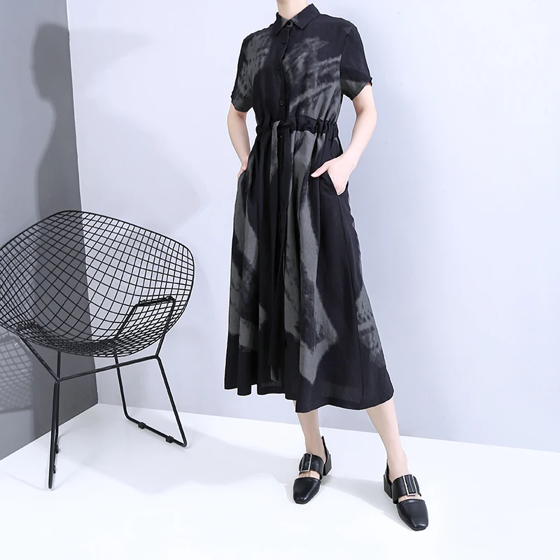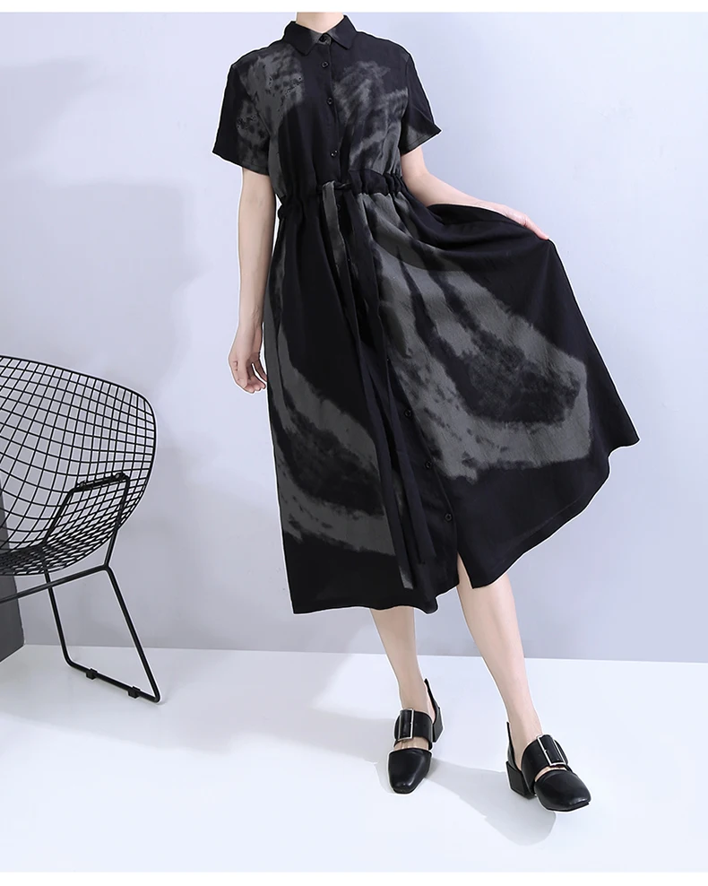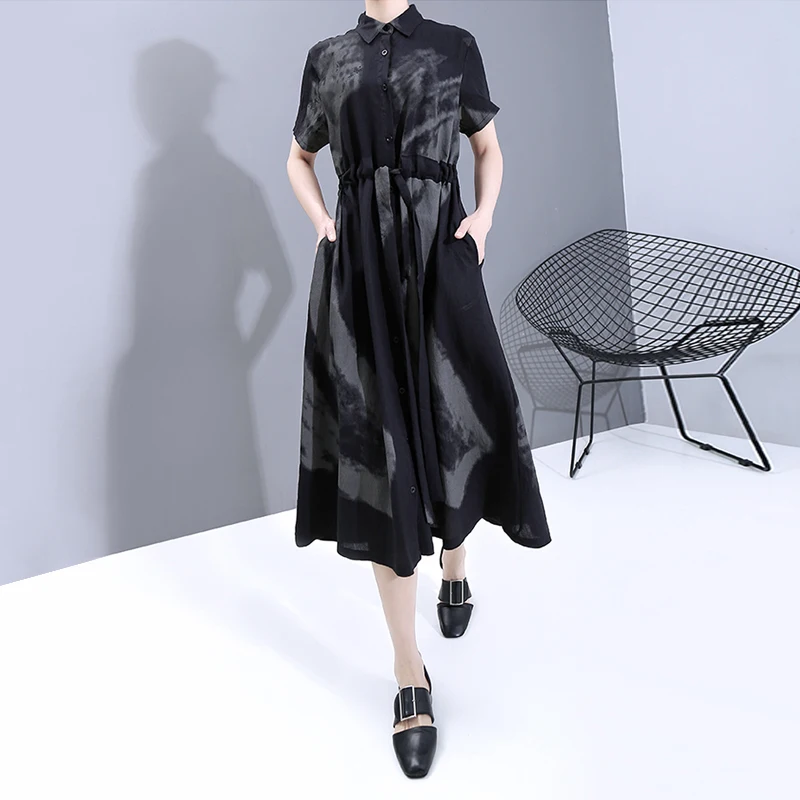 Новинка 2021 женское летнее ТРАПЕЦИЕВИДНОЕ черное винтажное Повседневное платье-рубашка с поясом и стильным принтом