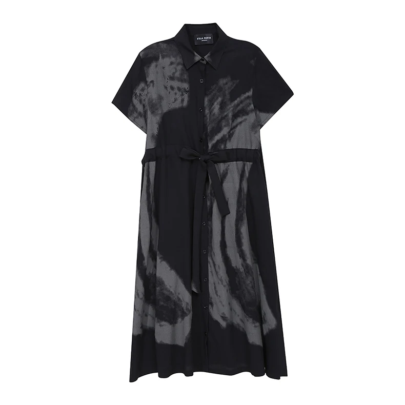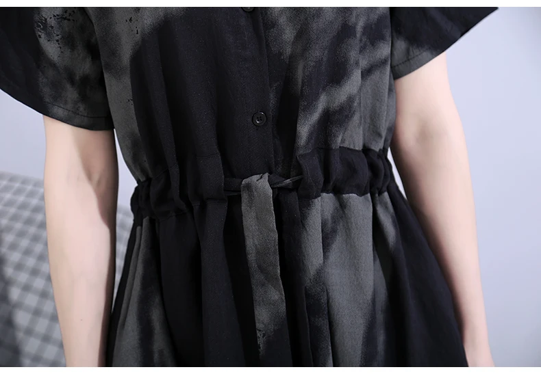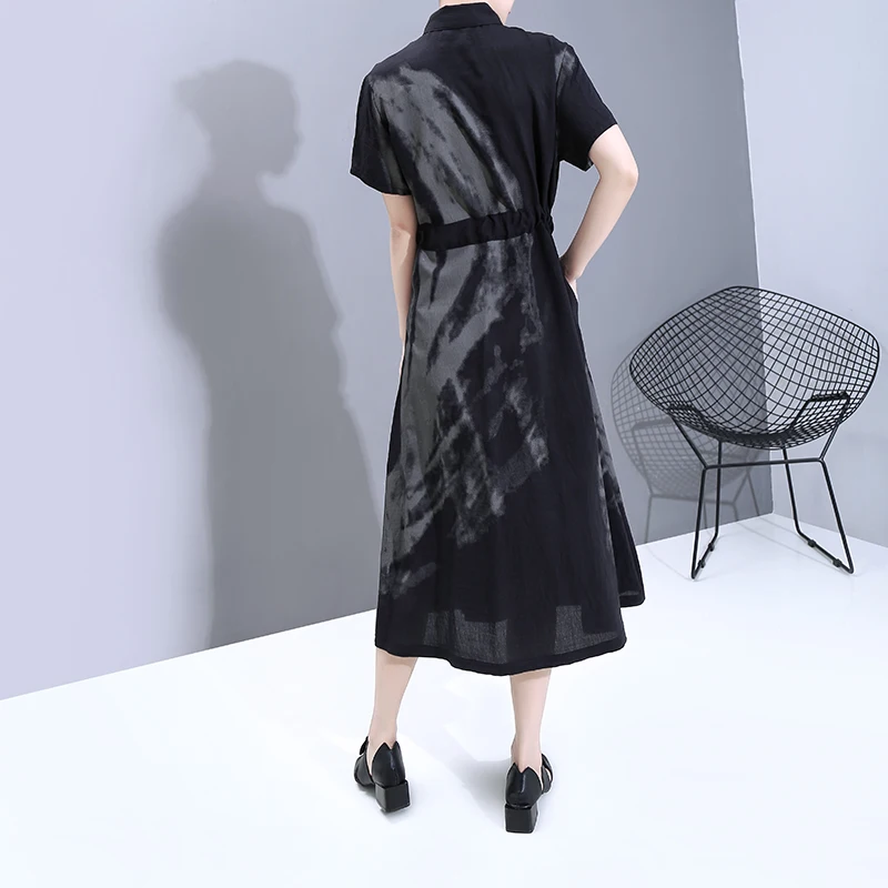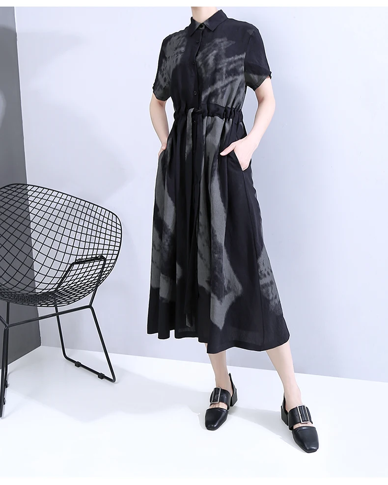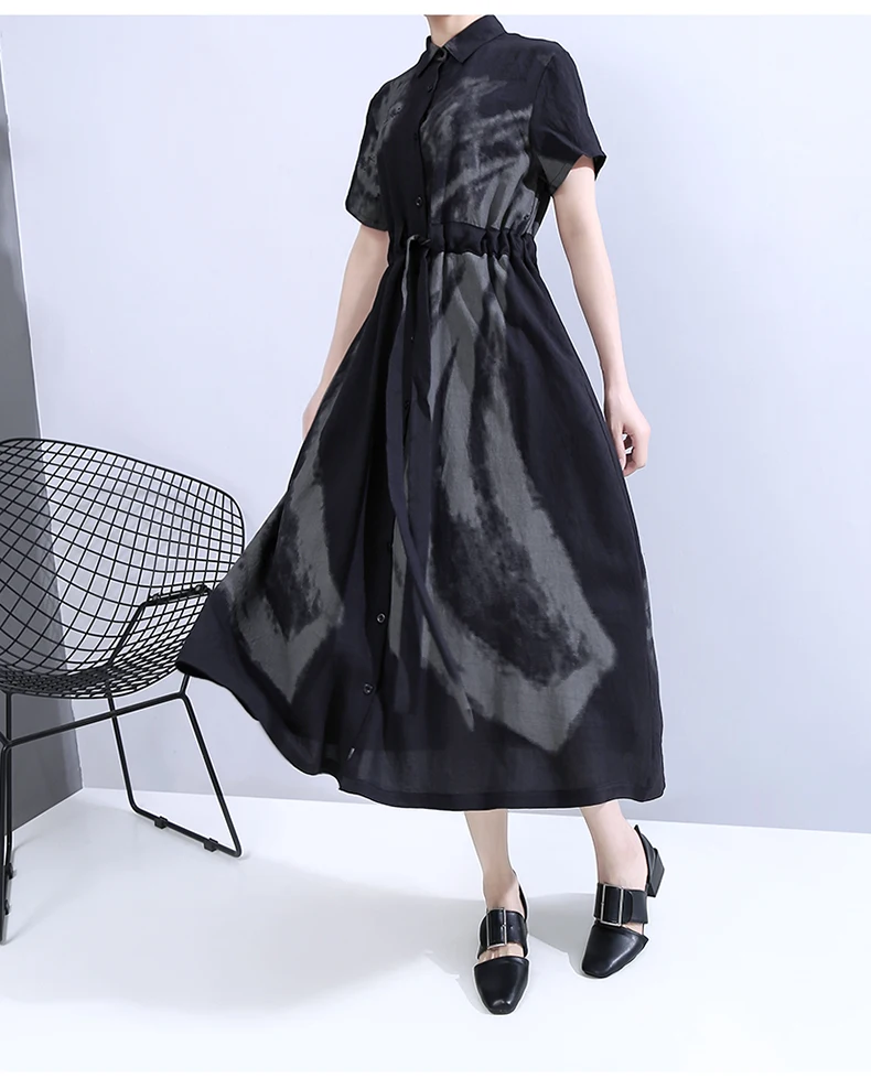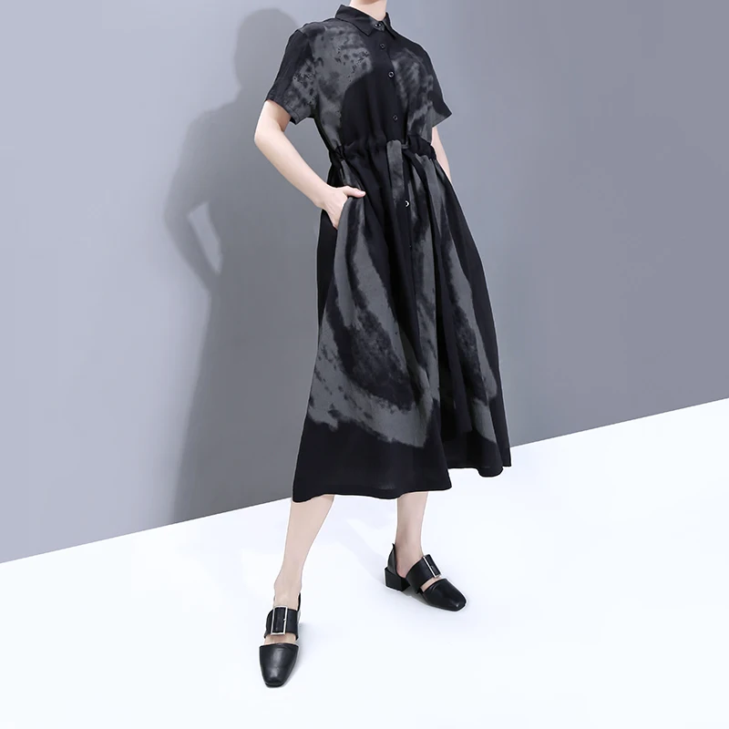 Новинка 2021 женское летнее ТРАПЕЦИЕВИДНОЕ черное винтажное Повседневное платье-рубашка с поясом и стильным принтом
