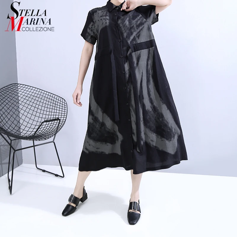 Новинка 2021, женское летнее платье трапециевидной формы, черное винтажное Повседневное платье-рубашка с поясом, дизайнерское стильное платье в стиле ретро с принтом, Femme 6171