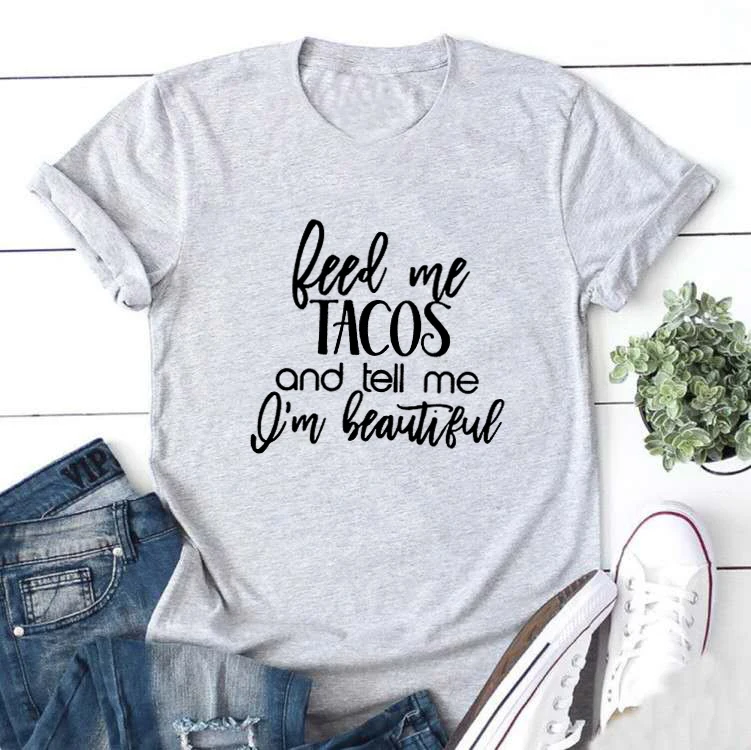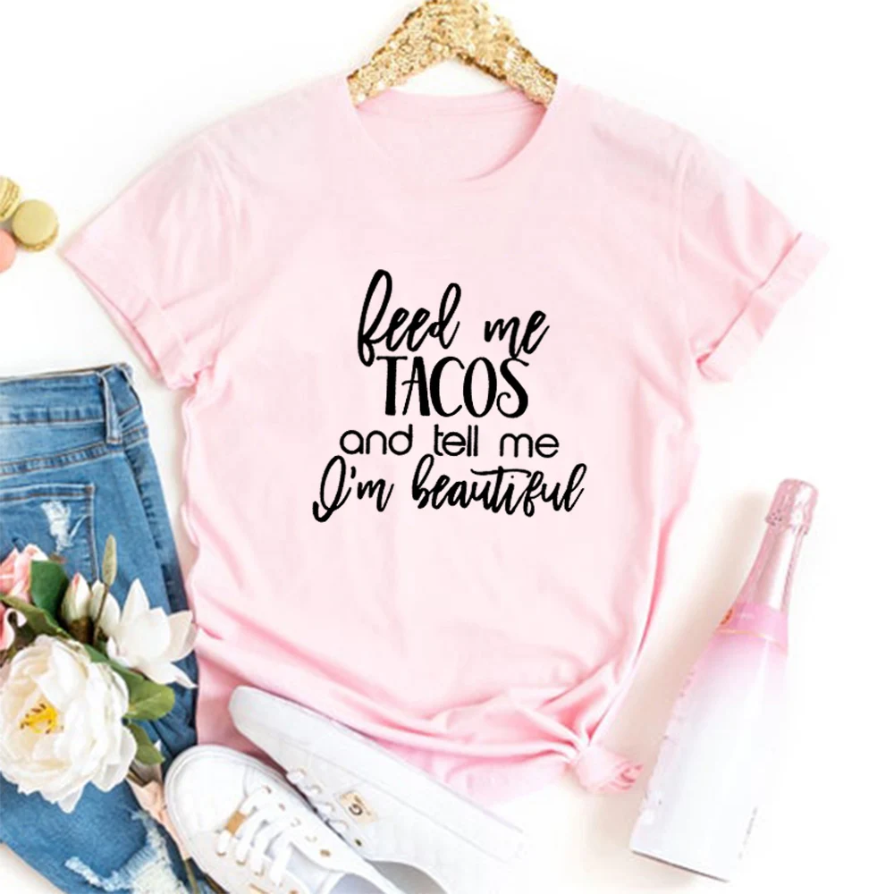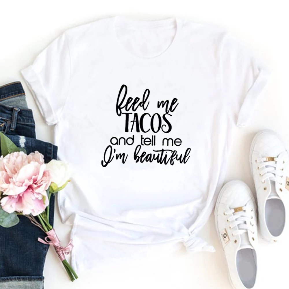 Женская футболка с принтом Feed Me Tacos and Tell Me, забавная Повседневная футболка с круглым вырезом, хлопковая футболка с коротким рукавом