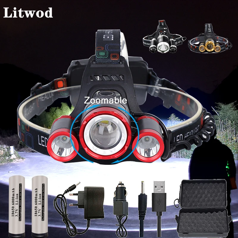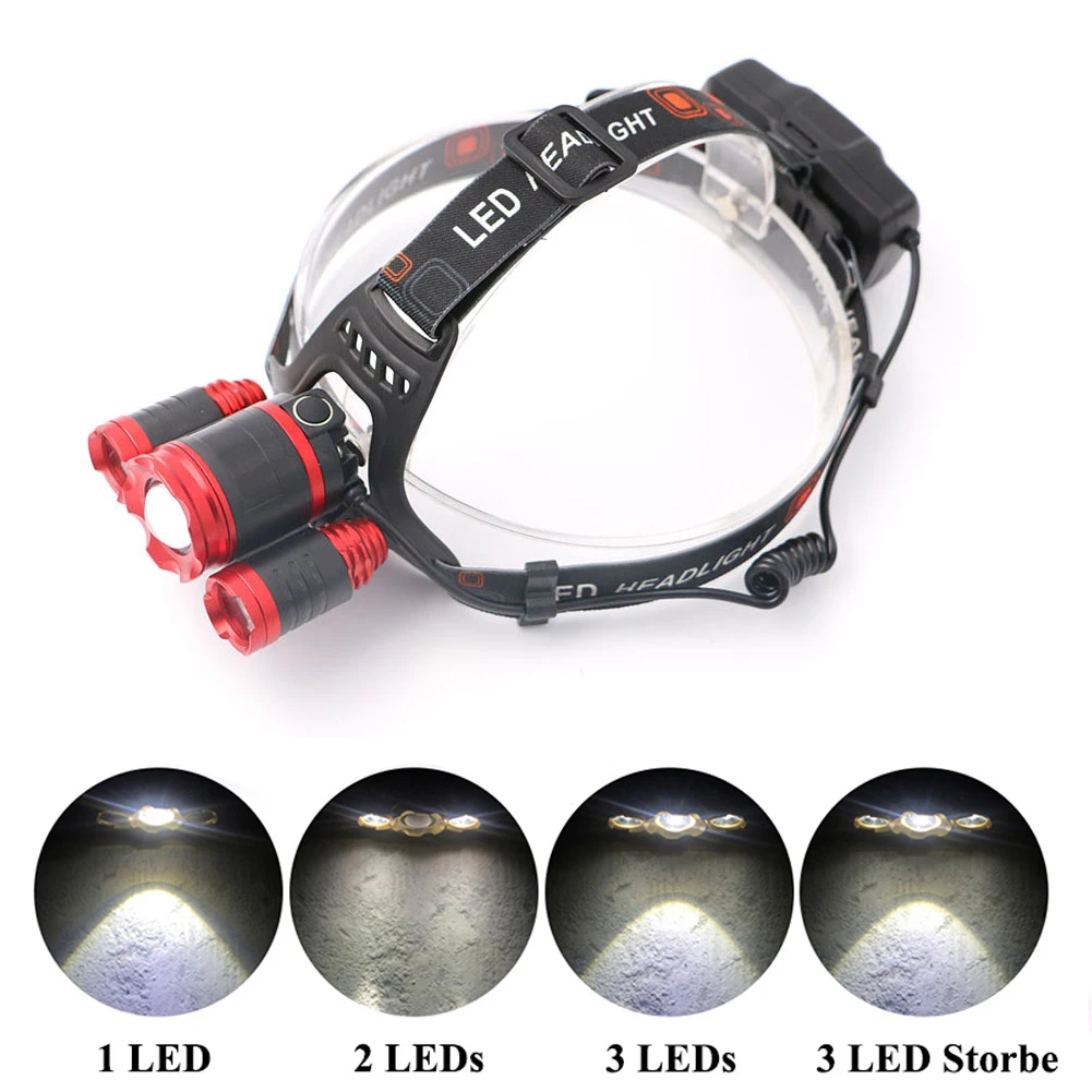 Супер яркий светодиодный налобный фонарь 3 * T6 Zoom светодиодный налобный фонарик налобный фонарь лампа + 2*18650 аккумулятор + ACавтомобильзарядное устройство USB