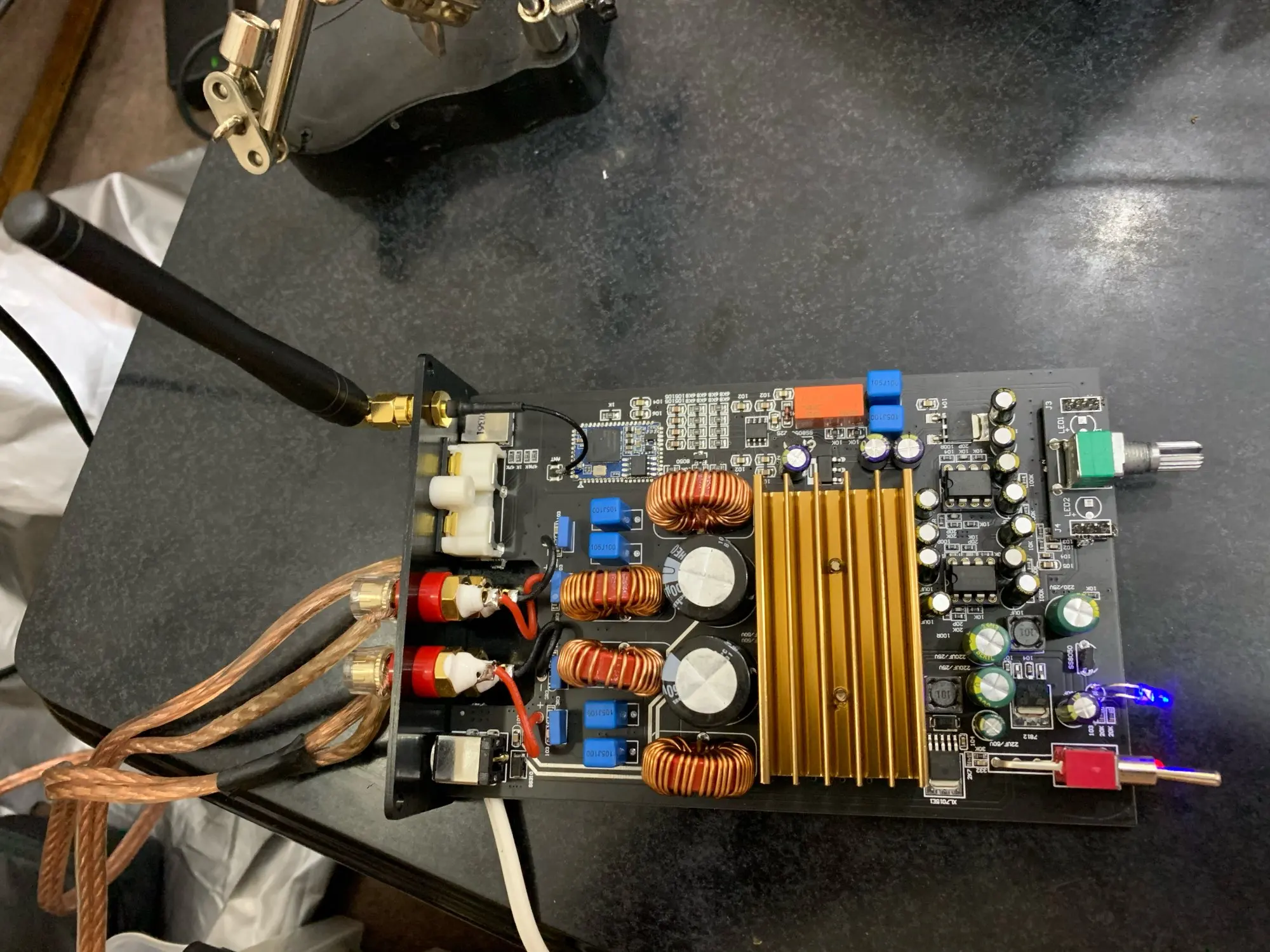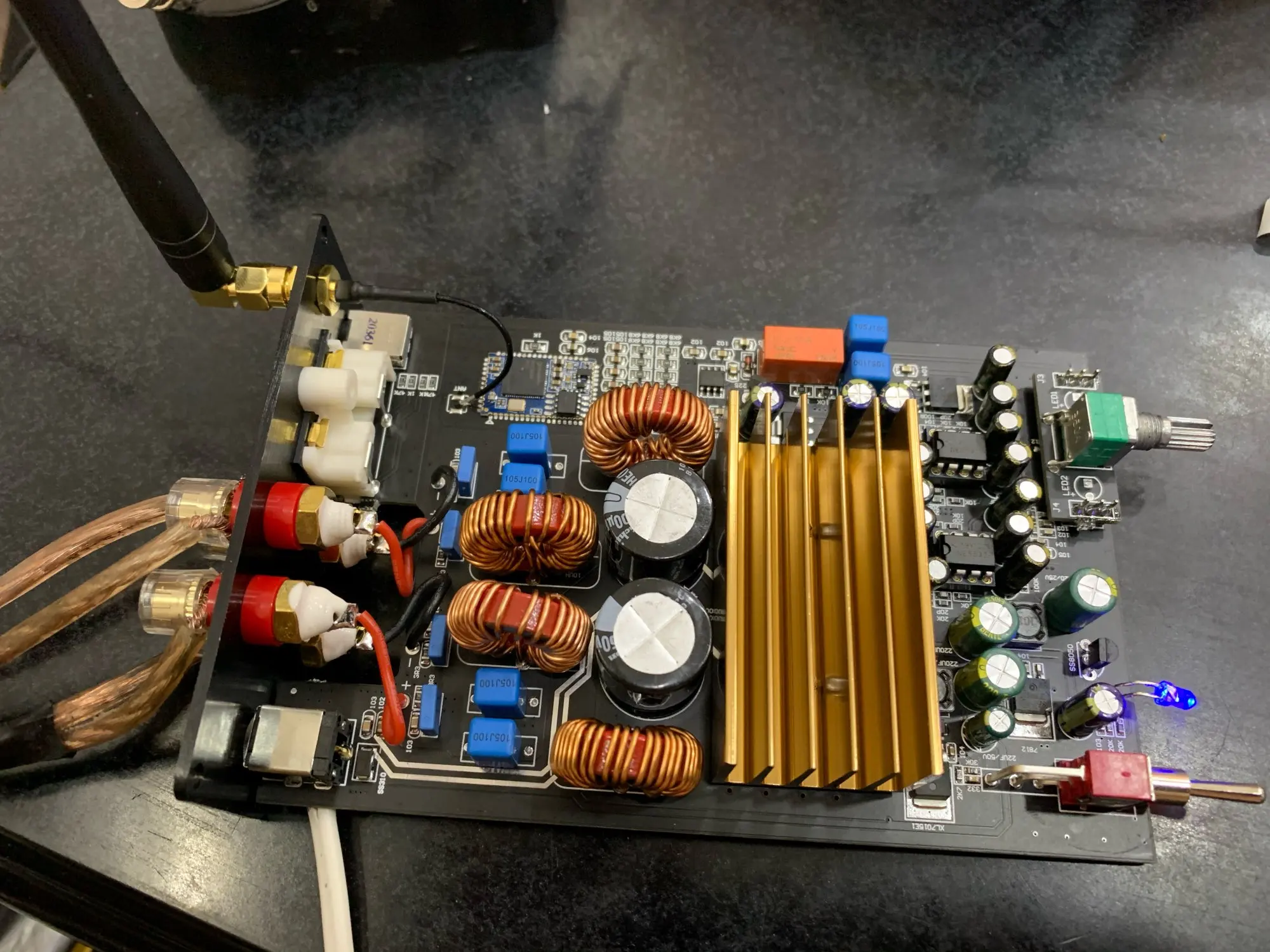 Всё работает. Запитал от ноутбучного блока 19в 4.3а. Поработал с недельку. Затем подкинул 32в и 9а. Разницы не заметил. Слушаю только через блютуз. Если на максимальную громкость даёшь входной сигнал, басит даже на низкой мощности громкости.