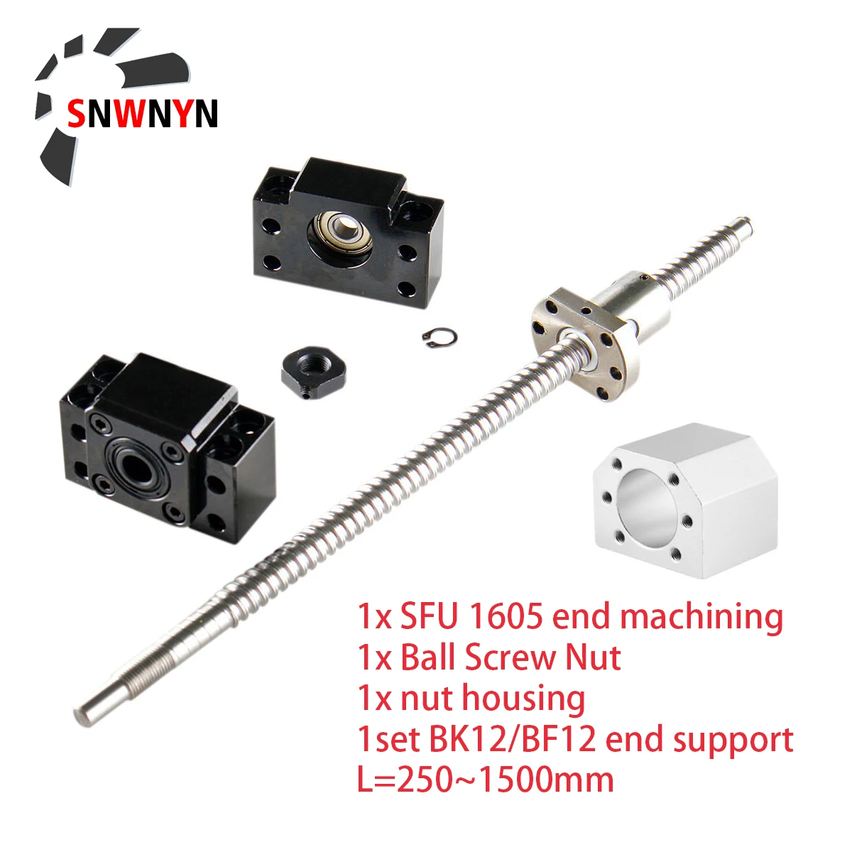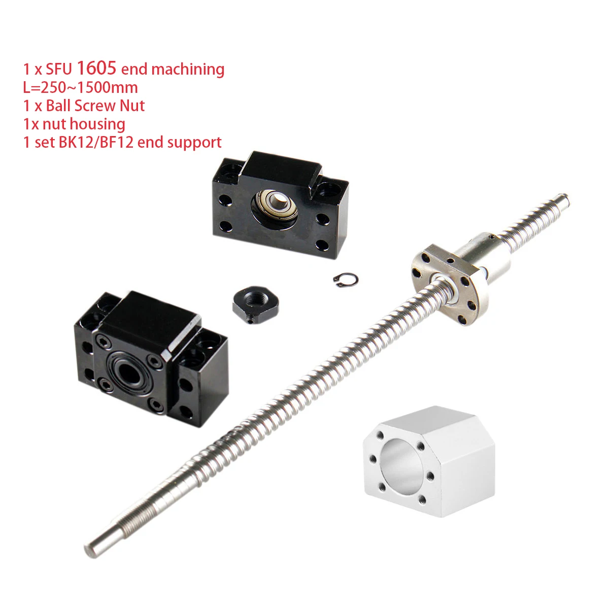 SFU1605 набор: SFU1605 -250 ~ 1500 мм скрученный шариковый винт C7 с концевой обработкой + 1605 шариковая гайка + Корпус гайки + BK/BF12 концевая опора для ЧПУ