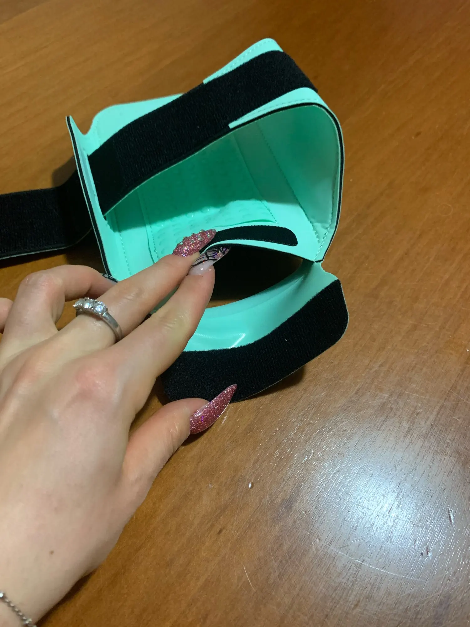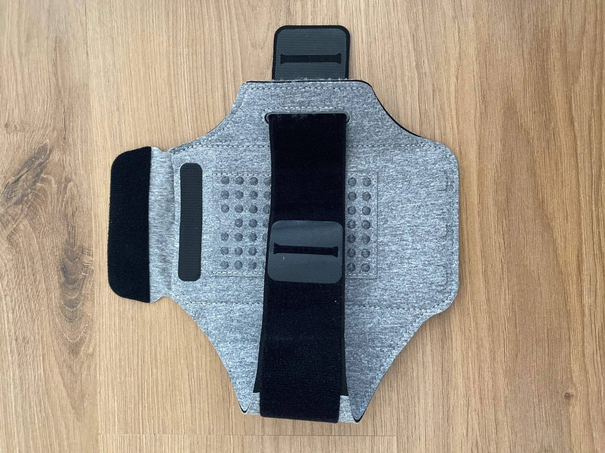 Элемент, как описано, очень гибкий и имеет 3 отверстия в нижней части, чтобы можно было положить кабели наушников. На данный момент липучка очень хорошо прилипает как к опоре, где находится мобильный телефон, так и к браслету. Кажется немного хрупким, но на данный момент это работает.