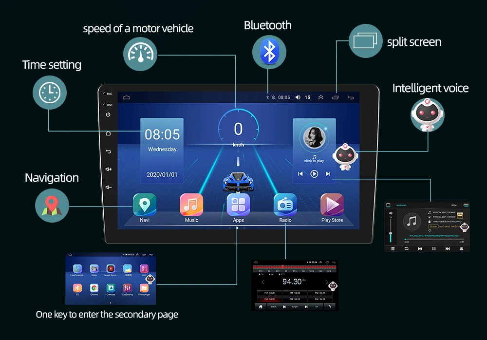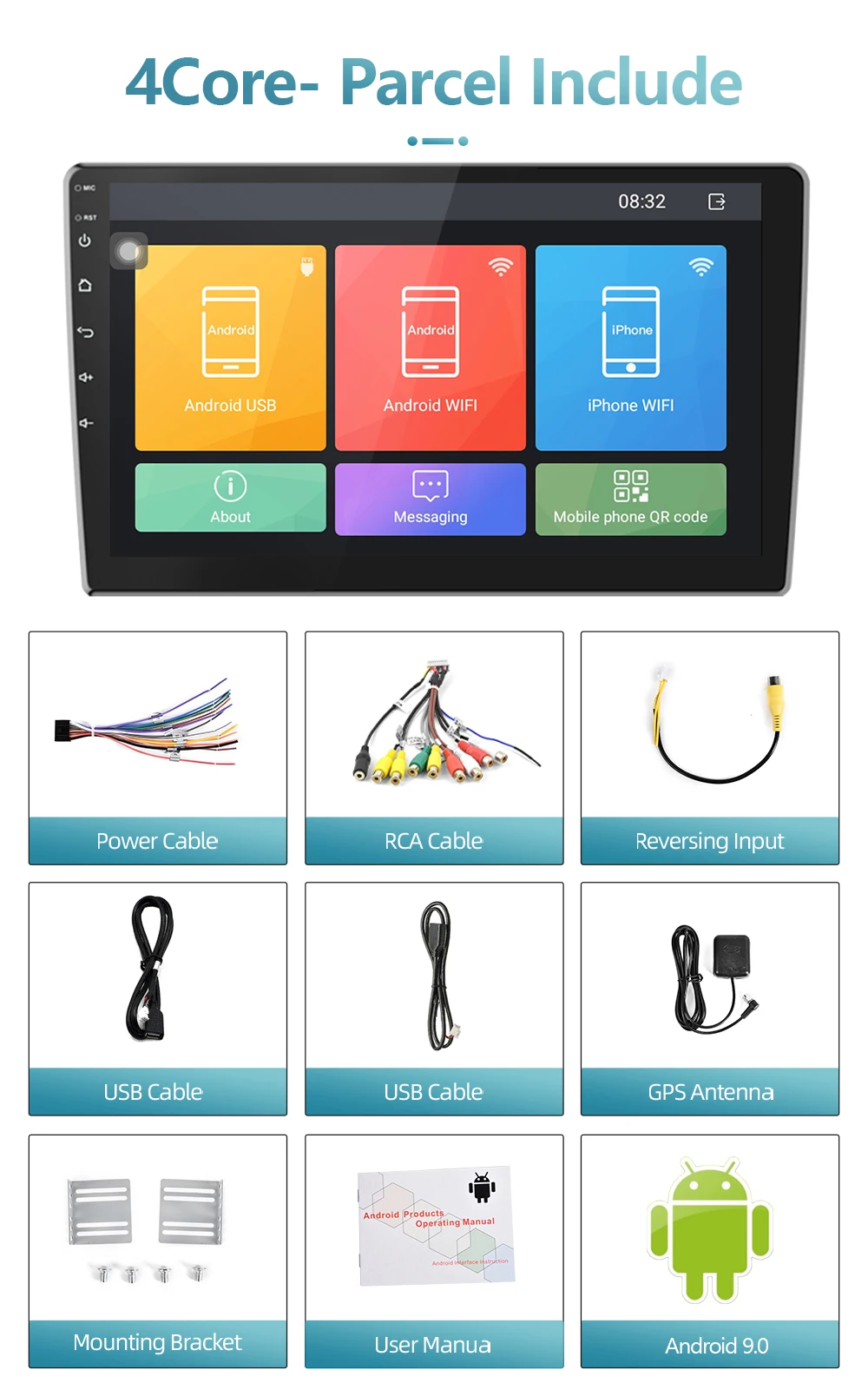 Характеристики:Система: Android 9,0Размер экрана: 7/9/10 ''2.5D экран из закаленного стеклаПамять:1 Гб (RAM)+ 16 Гб (ROM)2 Гб (RAM)+ 32 Гб (ROM)Разрешение экрана: 1024*600Зеркальная ссылка: Android/IOSGps-навигация: ВстроенныйФункция Wi-Fi: Встроенный
