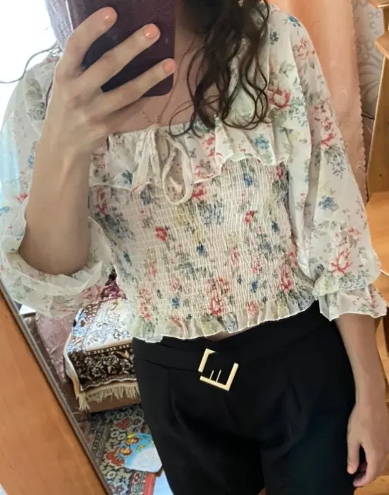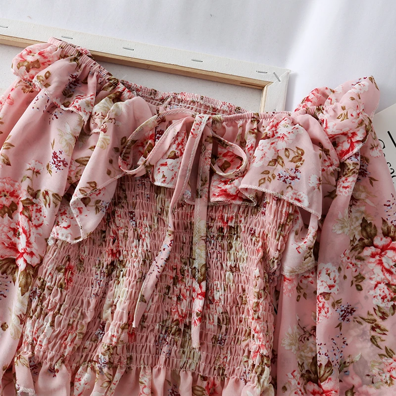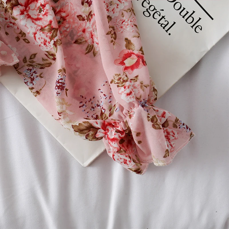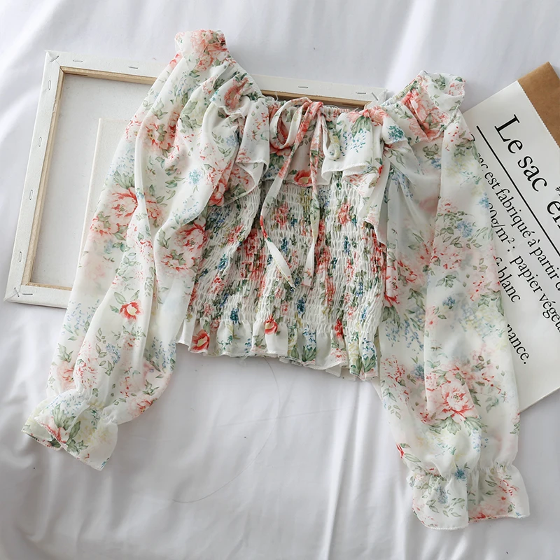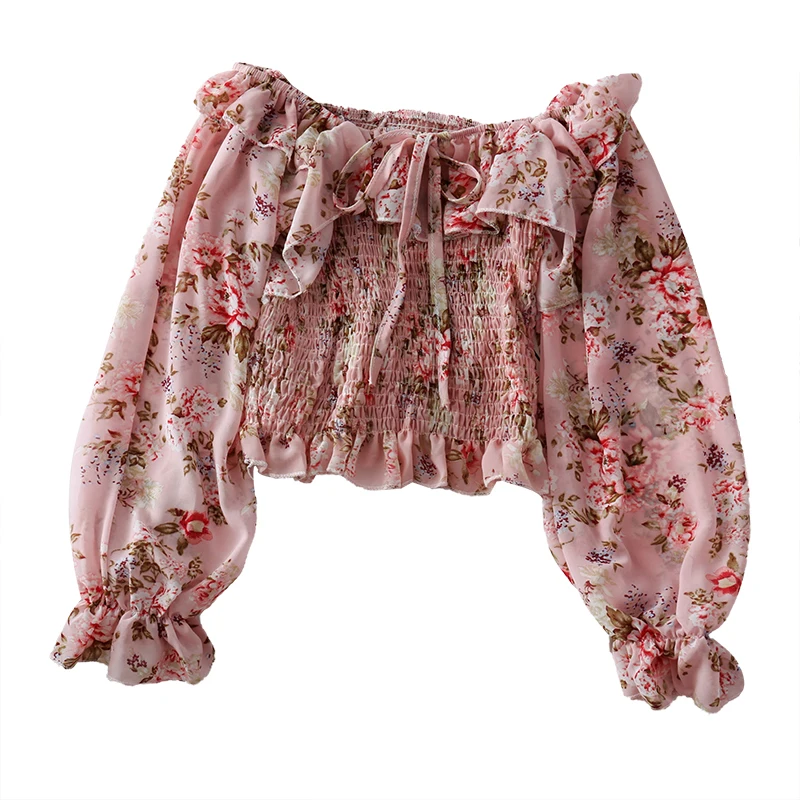 Женская шифоновая рубашка, с цветочным кружевом, на одно плечо, с оборками и рукавами-фонариками