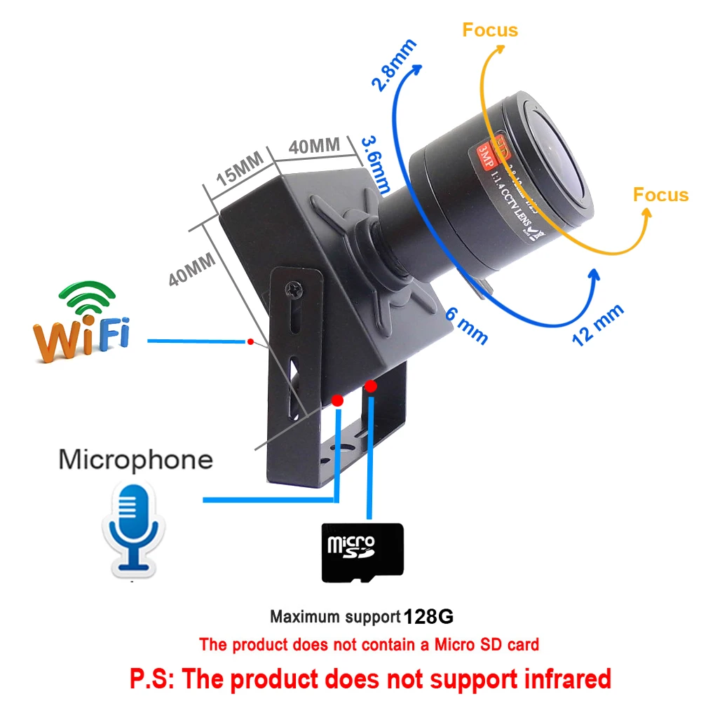 Меньший размер: 4 см * 4 см * 1,5 см Поддержка ручного зум-объектива 2,8 мм-12 мм Поддержка беспроводного соединения Поддержка подключения проводного сетевого кабеля Поддержка точки доступа AP Поддержка записи Micro SD Встроенный микрофон Поддержка разрешения HD (2560*1920 / 2560*1440) Поддержка компьютера, телефона Android, подключения iPhone