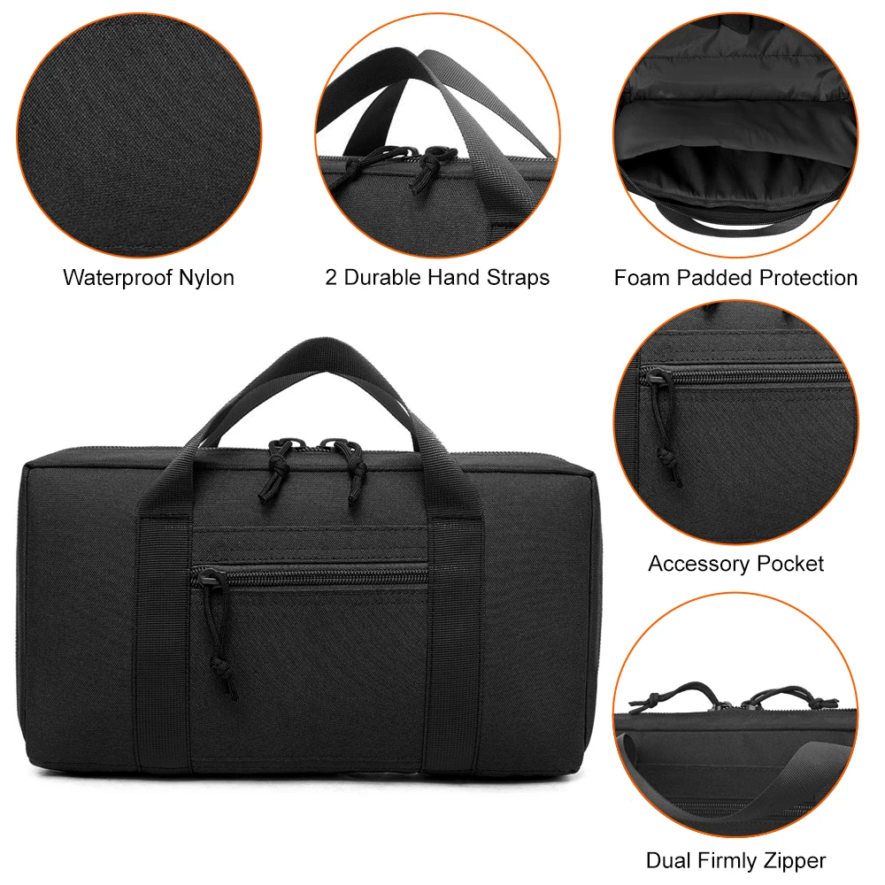 Особенности -- Изготовлен из нейлона высокой плотности. -- С волшебным ремешком на передней части, который может прикрепить небольшие вещи, такие как патч, мешочек и т. Д. -- С 2 шт. ручной ремень для переноски. -Может держать 2 оружия. -- С 7 держателями эластичного ремешка для фонарика, небольших шестеренок, корпуса, журнала и т. Д. -- Одно отделение с подкладкой из пены с застежкой-молнией. -Пенная подкладка обеспечивает полную защиту. Параметры -- Материал: водонепроницаемый нейлон -- Вес: 280 г -Цвет: черный/коричневый -- Размер: 33*18*7 см/13*7,08*2,76" Посылка включает в себя 1 х нейлоновый мягкий чехол-сумка с пистолетом