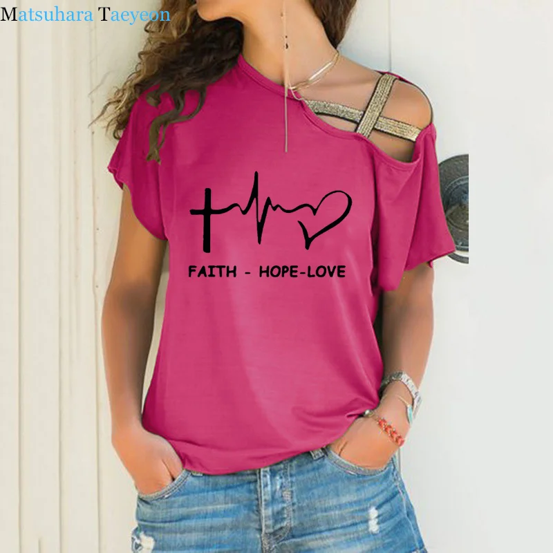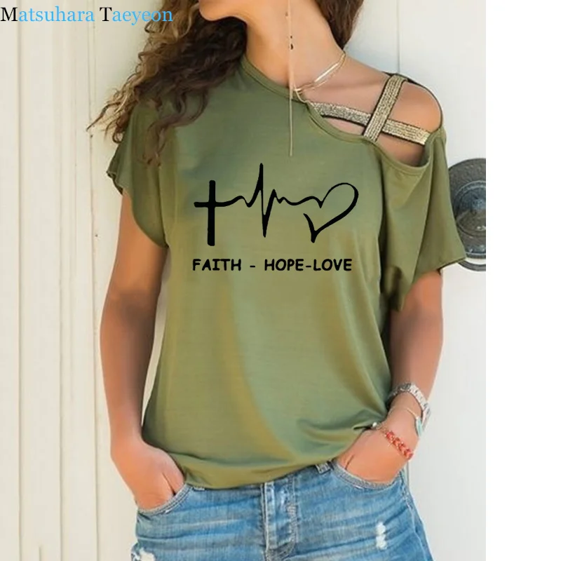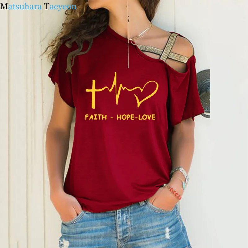 Женская футболка с косым вырезом-лодочкой и надписью Faith Hope Love Christian