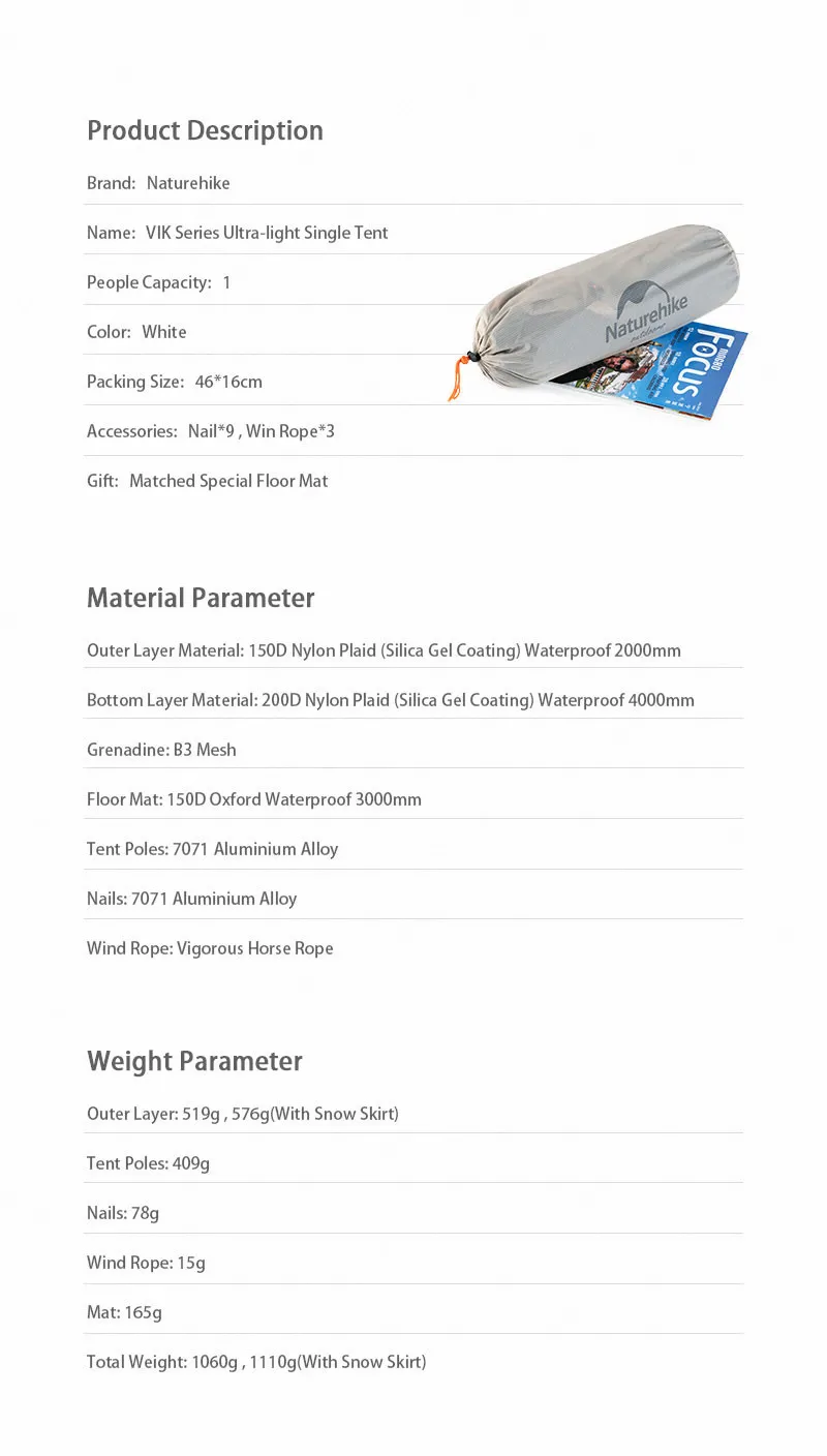 Бренд: NaturehikeНомер модели: NH18W001-KНазвание: VIK Серия Ультра-светильник с одной палаткойВместимость: 1Цвет: белыйРазмер упаковки: 46*16 смАксессуары: гвоздь * 9 , Win Rope * 3Подарок: специальный напольный коврикПараметры материалаМатериал внешнего слоя: 150D нейлоновая клетка (покрытие из силикагеля) Водонепроницаемая 2000 ммМатериал нижнего слоя: 200D нейлоновая клетка (покрытие из силикагеля) Водонепроницаемая 4000 ммГренадин: B3 сеткаНапольный коврик: 150D Оксфорд водонепроницаемый 3000 ммСтолбы палатки: 7071 алюминиевый сплавГвозди: 7071 алюминиевый сплавВетровая веревка: энергичная скакалкаПараметры весаВнешний слой: 519 г, 576 г (с юбкой для снежной погоды)Столбы палатки: 409 гНогти: 78 гВетровая веревка: 15 гКоврик: 165 гОбщий вес: 1060 г, 1110 г (с юбкой для снежной погоды)