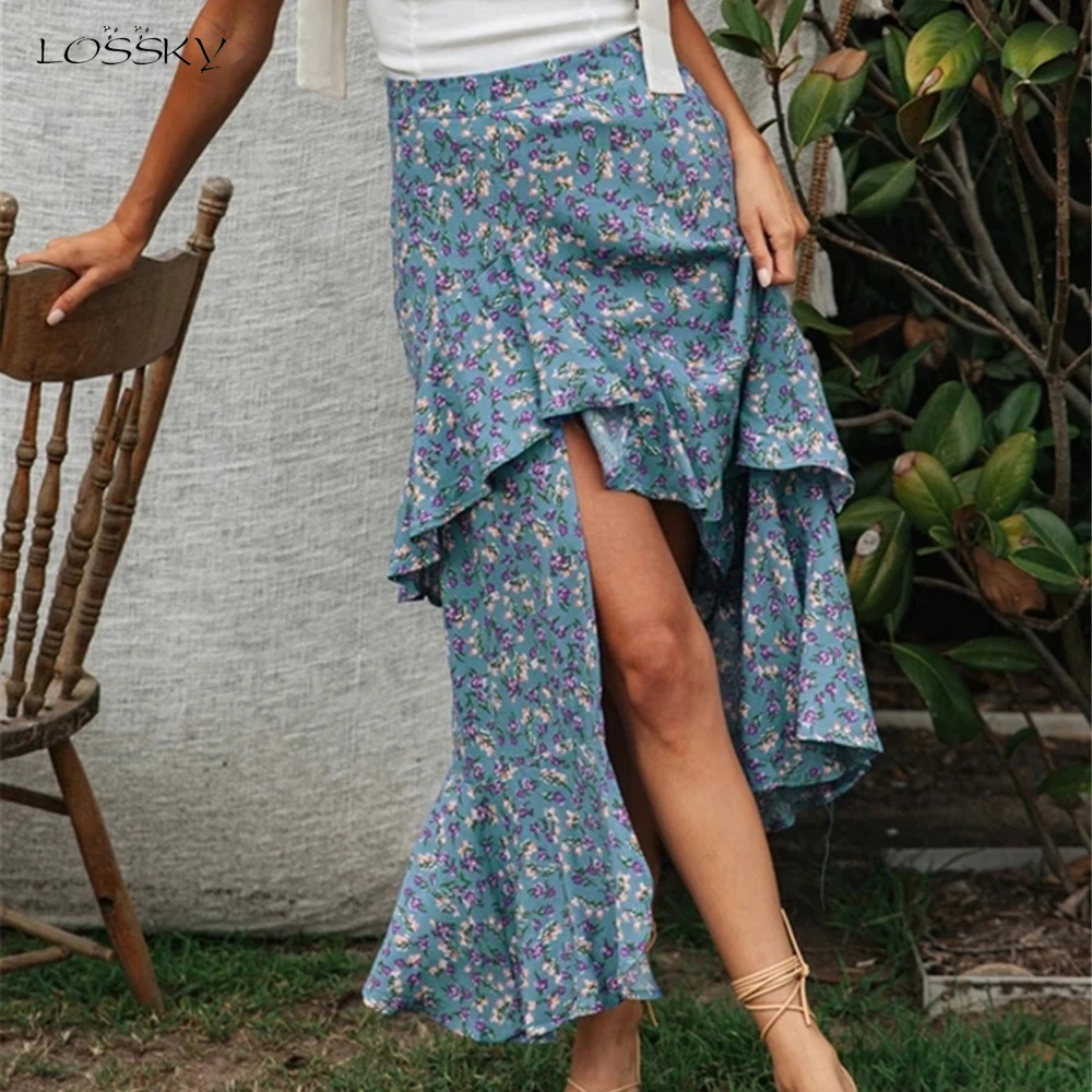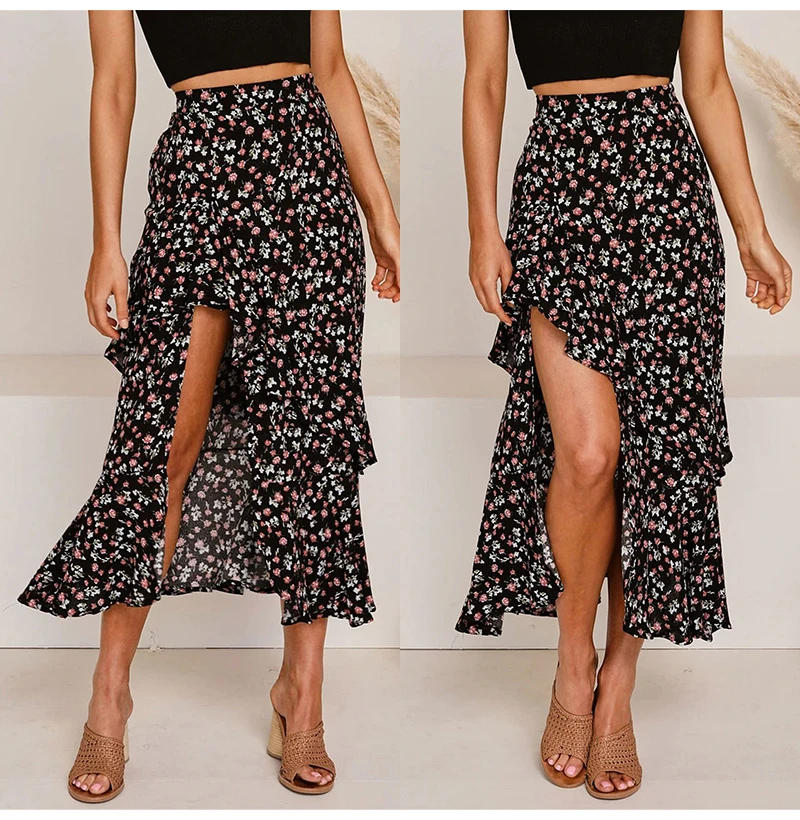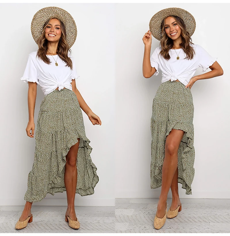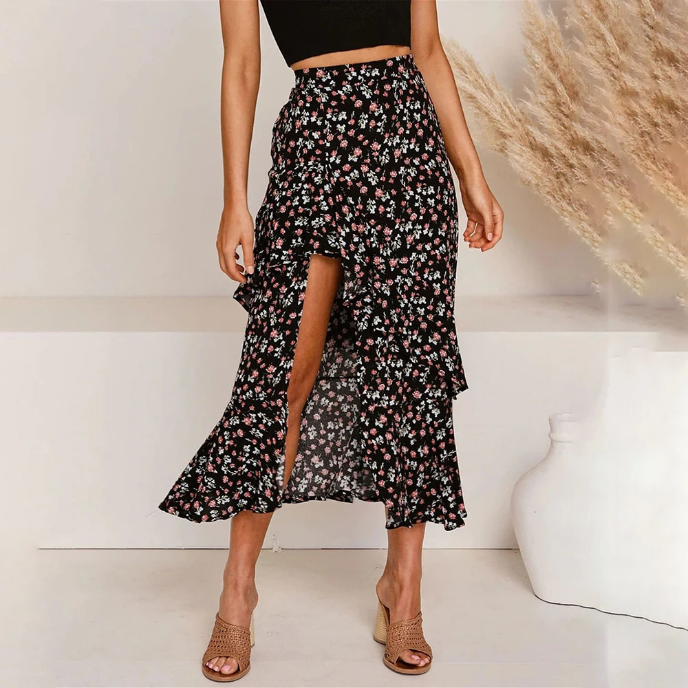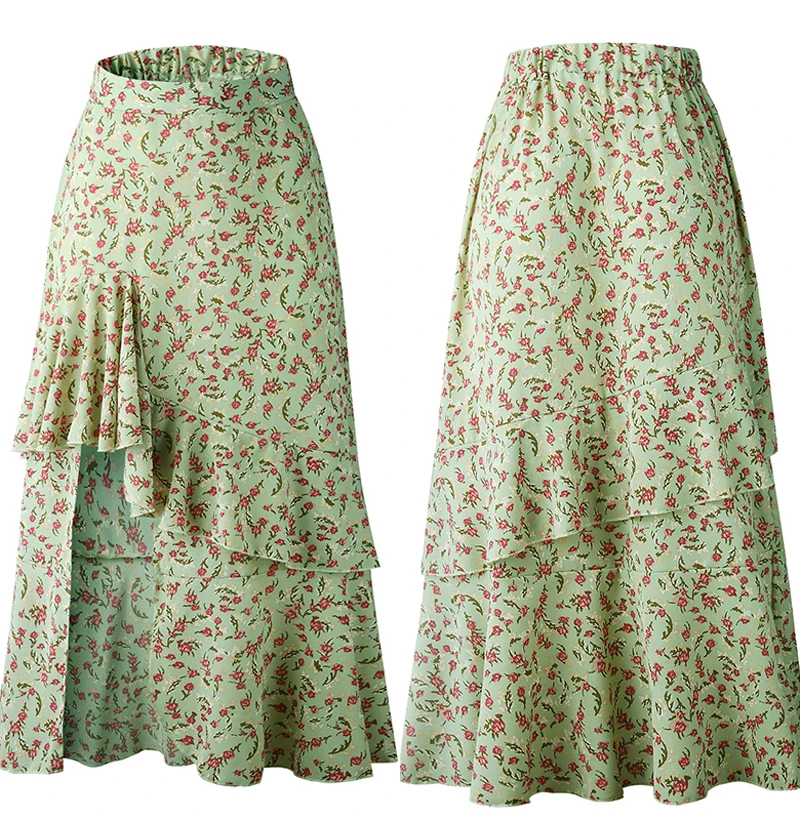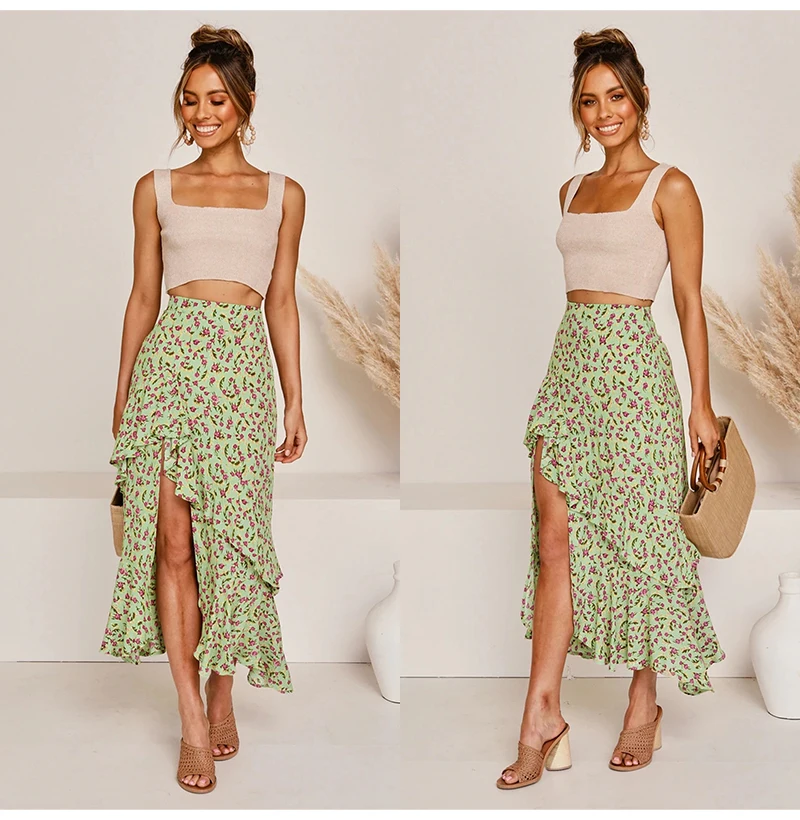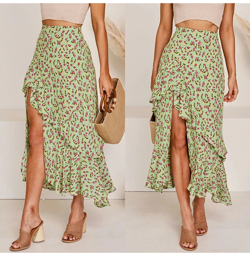 Юбка Женская средней длины с завышенной талией, асимметричная юбка с цветочным принтом, с оборками, пикантная Длинная зеленая одежда с разрезом, лето 2020