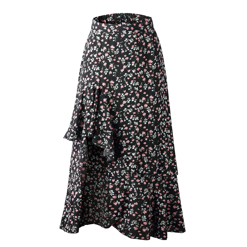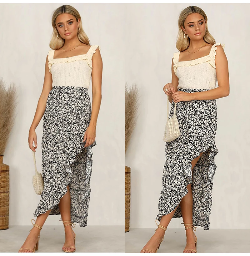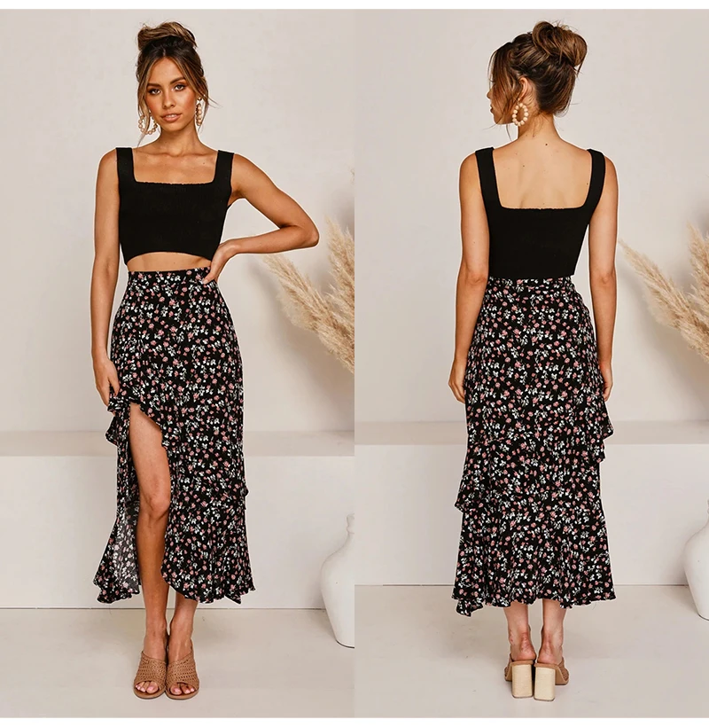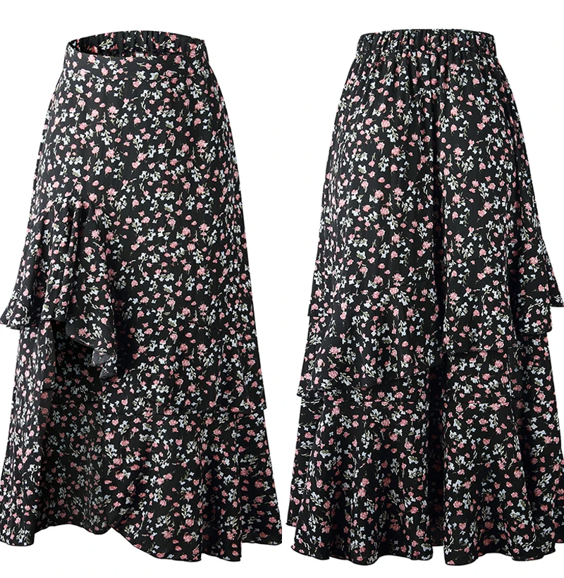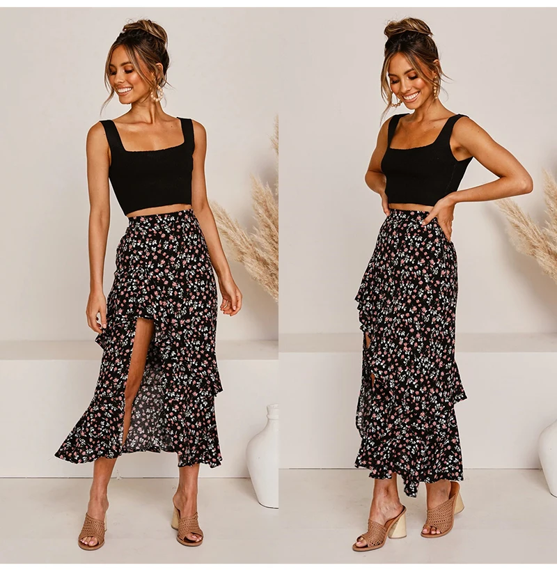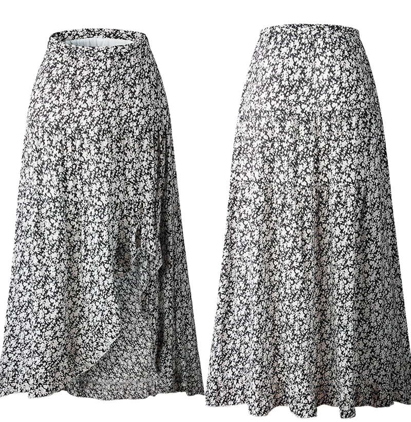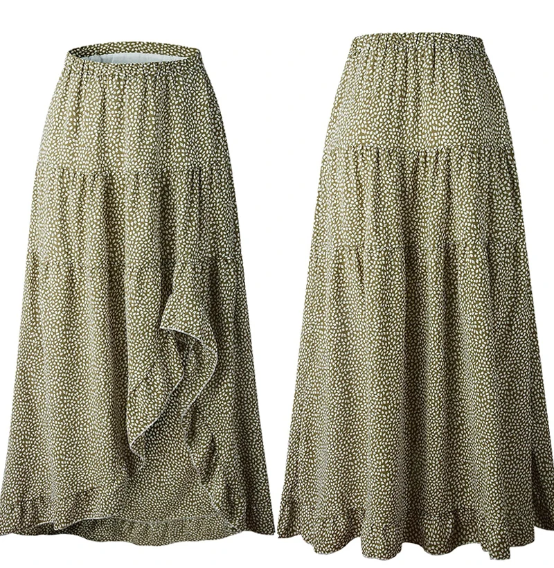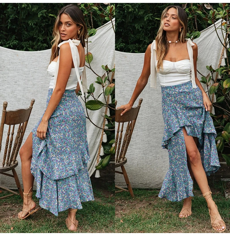 Юбка Женская средней длины с завышенной талией, асимметричная юбка с цветочным принтом, с оборками, пикантная Длинная зеленая одежда с разрезом, лето 2020
