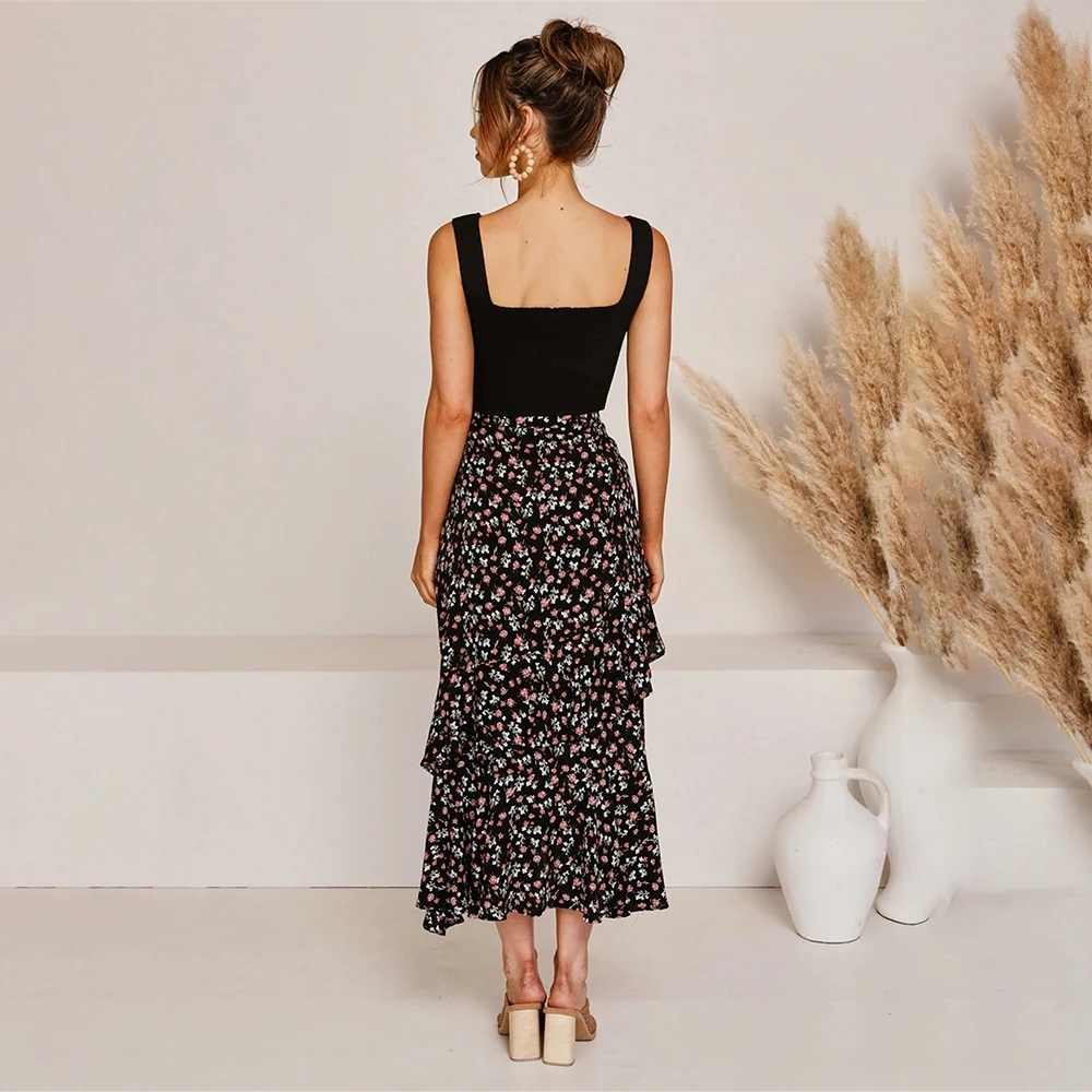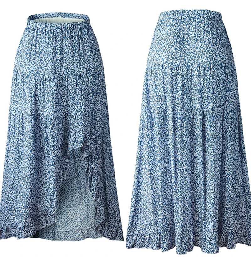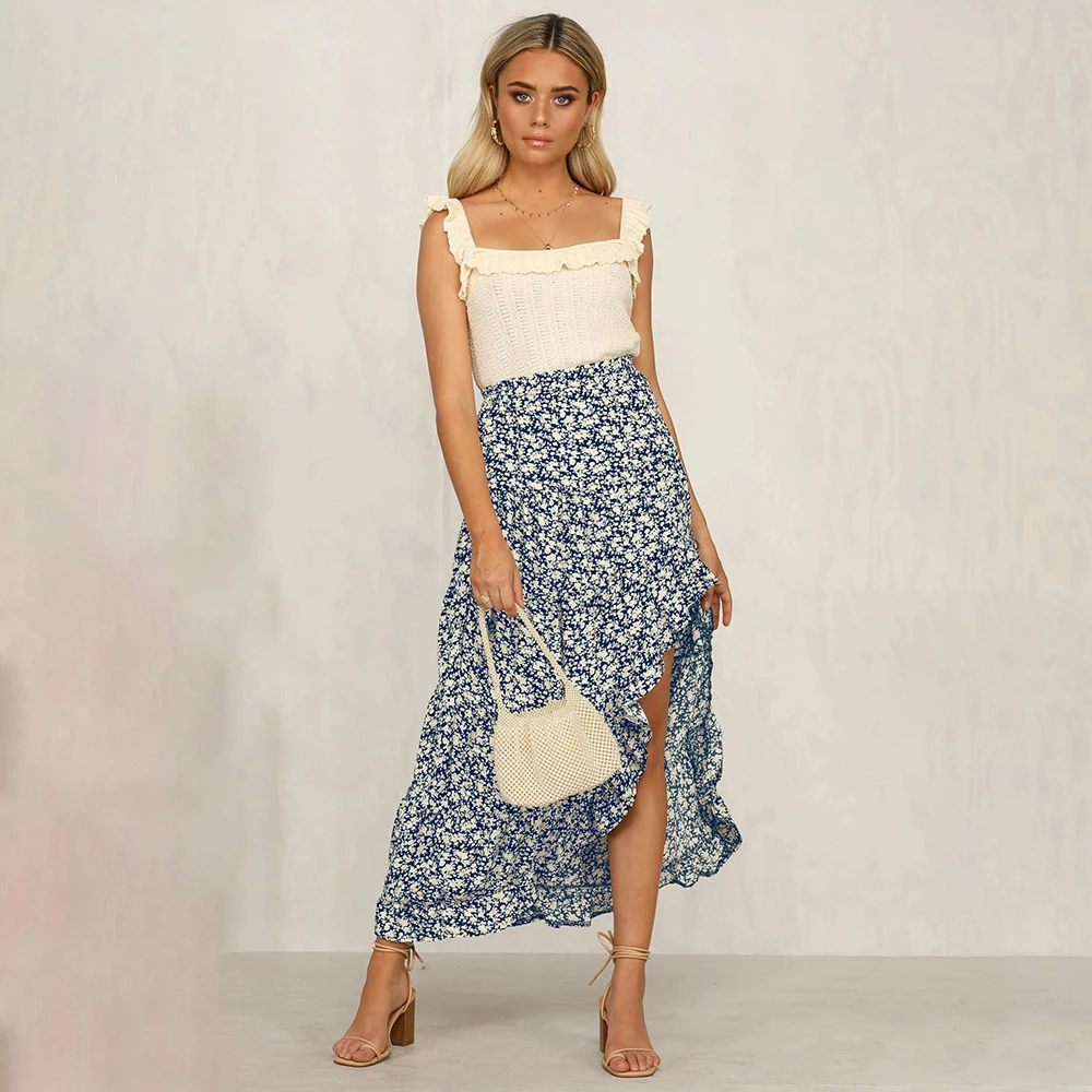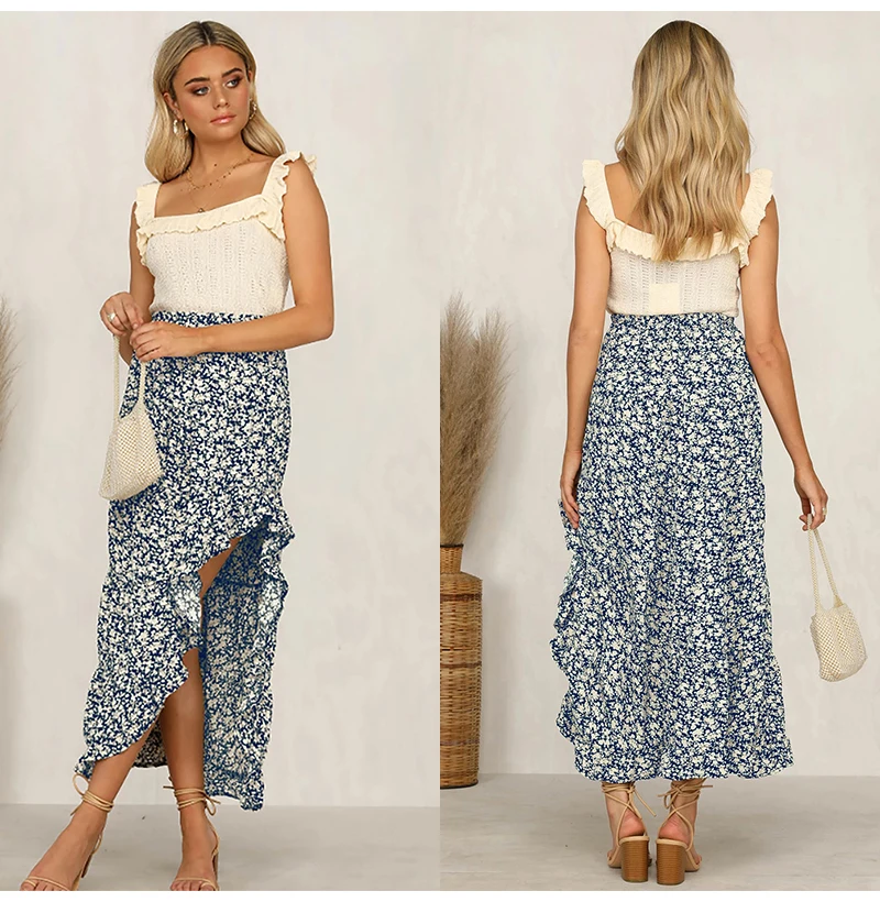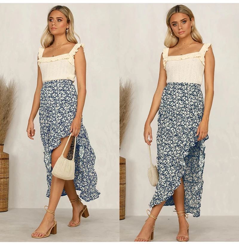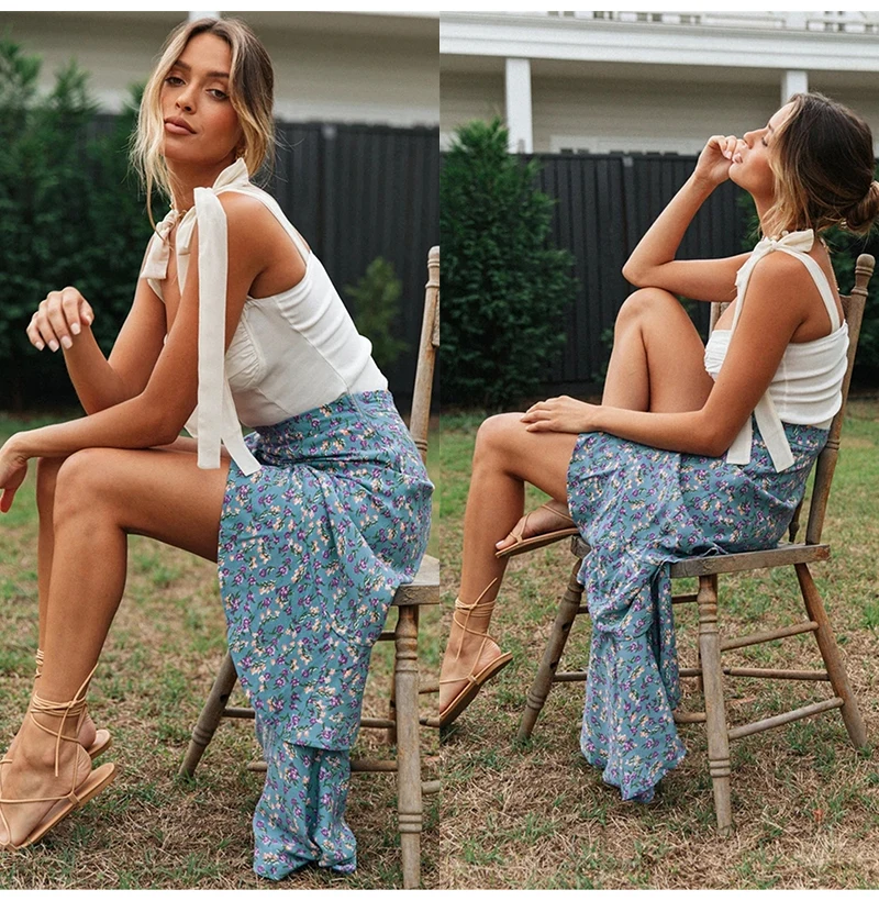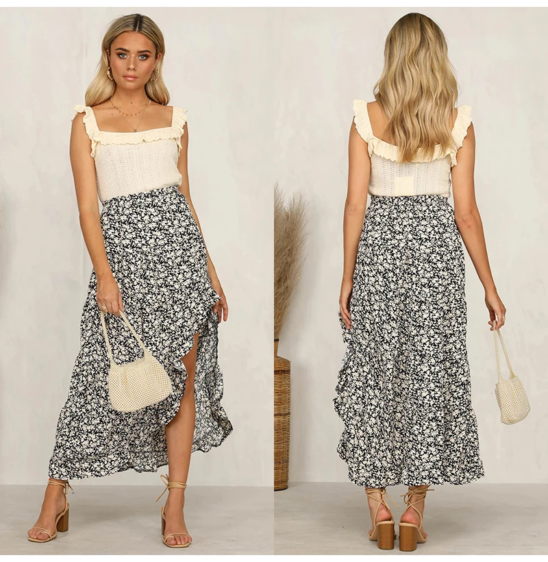 Юбка Женская средней длины с завышенной талией, асимметричная юбка с цветочным принтом, с оборками, пикантная Длинная зеленая одежда с разрезом, лето 2020