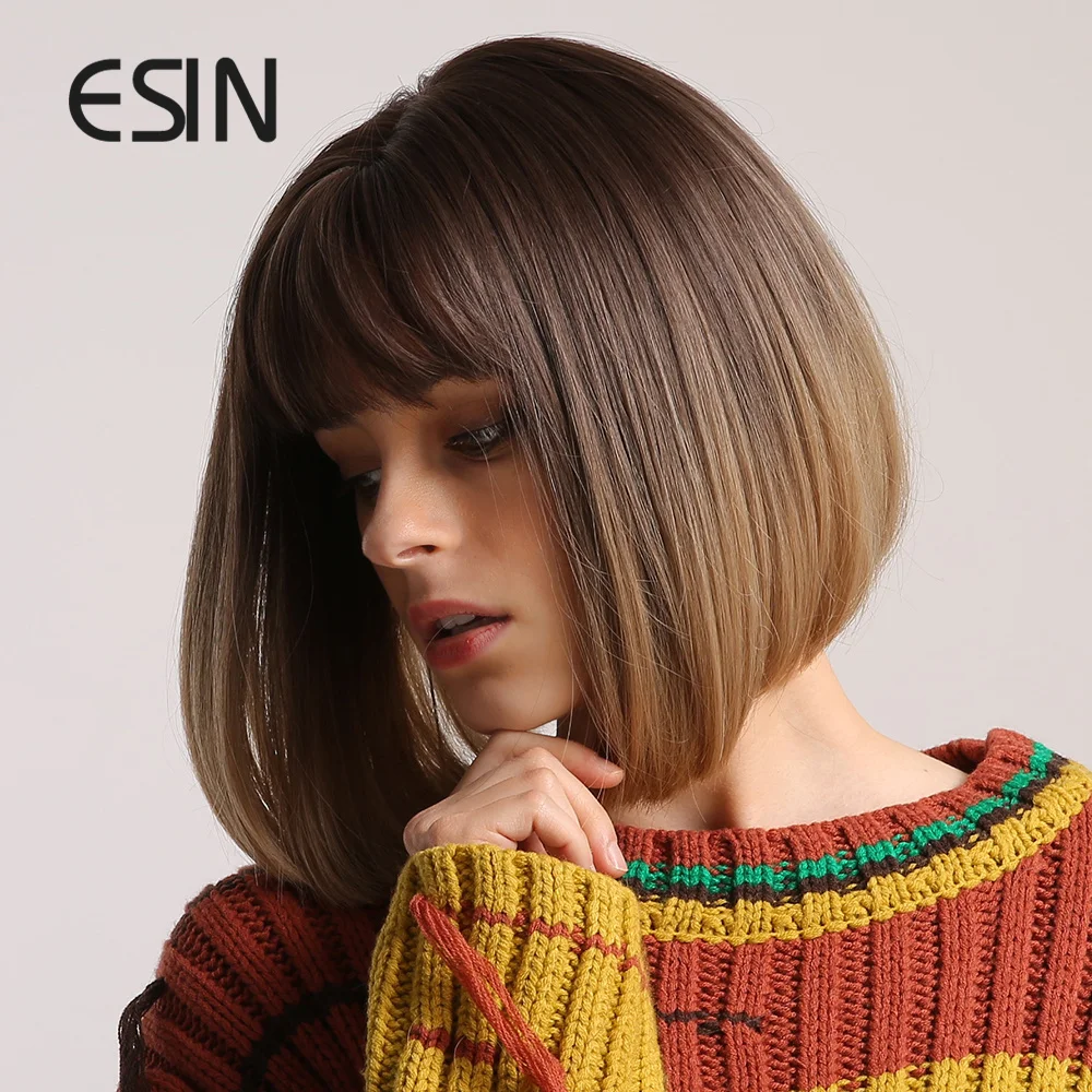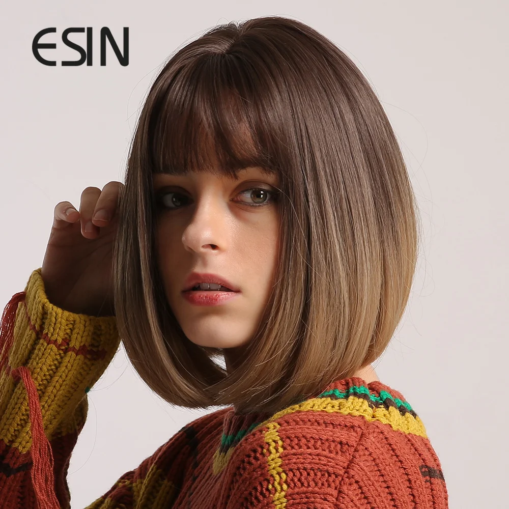 ESIN синтетические волосы коричневый Омбре светильник-коричневого средней длины прямой боб парик с челкой Косплей парики для женщин термостойкие
