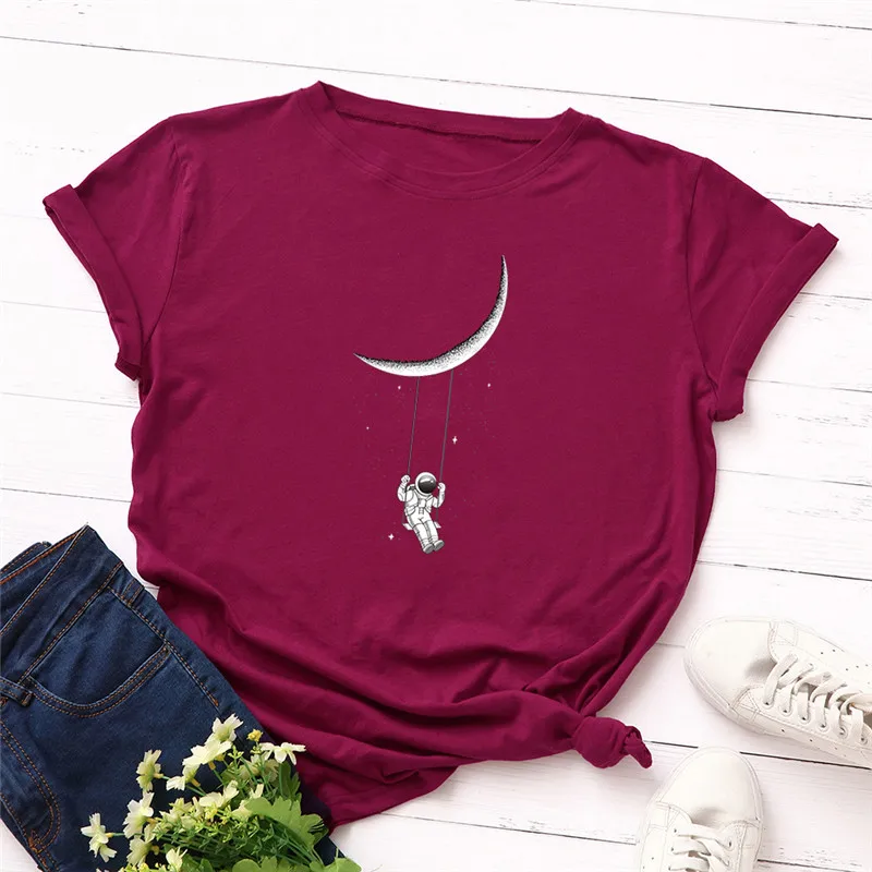 Футболка с принтом Луны, космонавта, Женская хлопковая летняя футболка с коротким рукавом, розовые топы, Повседневная футболка