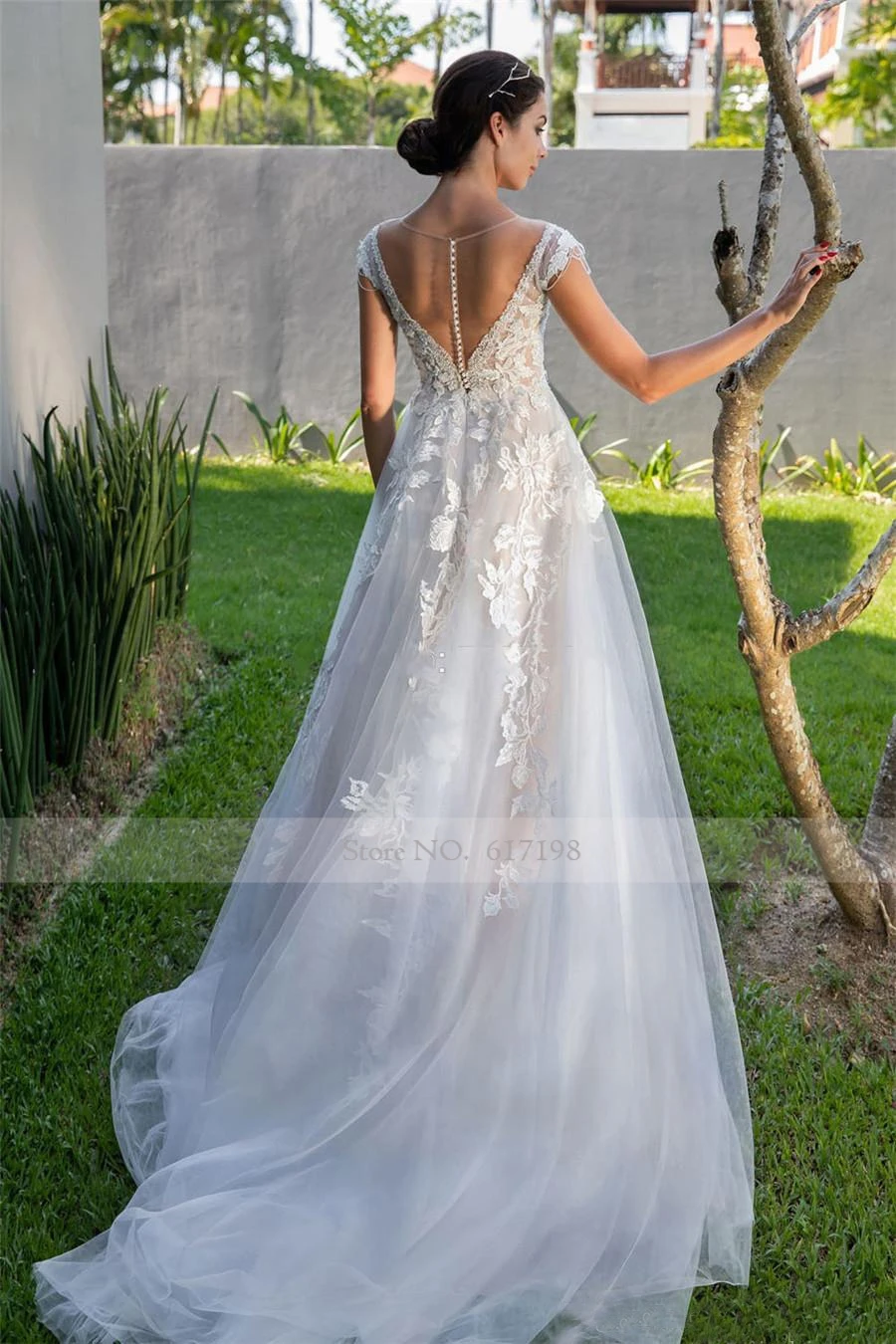 Женское кружевное свадебное платье, прозрачное ТРАПЕЦИЕВИДНОЕ ПЛАТЬЕ ИЗ ТЮЛЯ С V-образным вырезом и рукавами-крылышками, со шлейфом, 2020
