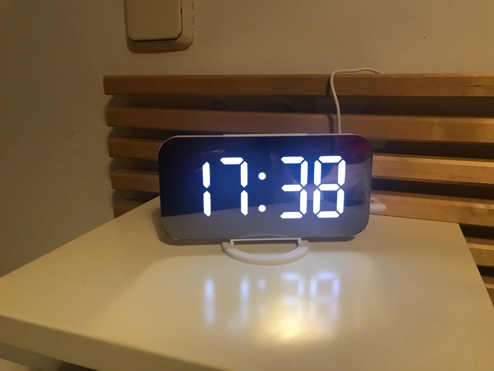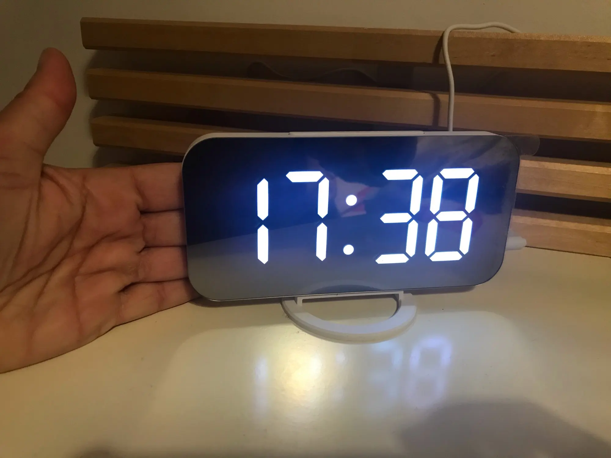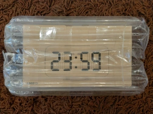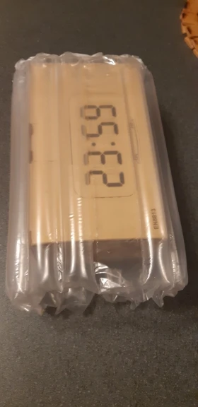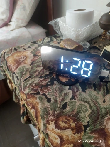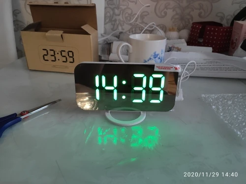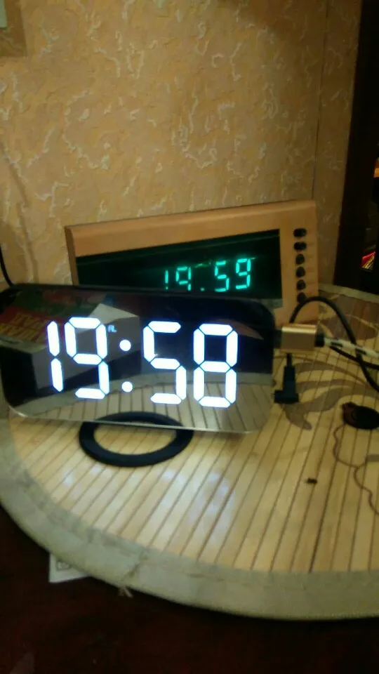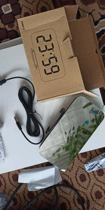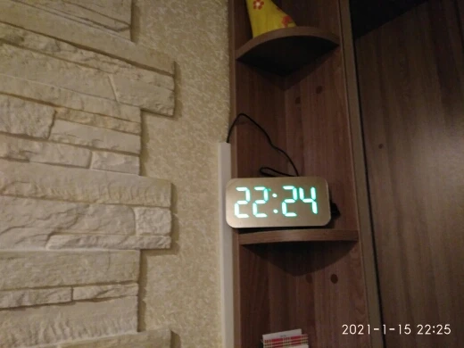 Часы ок, есть батарейка чтобы не сбивались при отключении питания. Но два момента - блока питания в комплекте нет, для работы часов нужна любая зарядка на USB. И коробка, хотя и была упакована в воздушный матрац, дошла как будто её пинали ногами. Хорошо, что зеркальное стекло не разбилось.