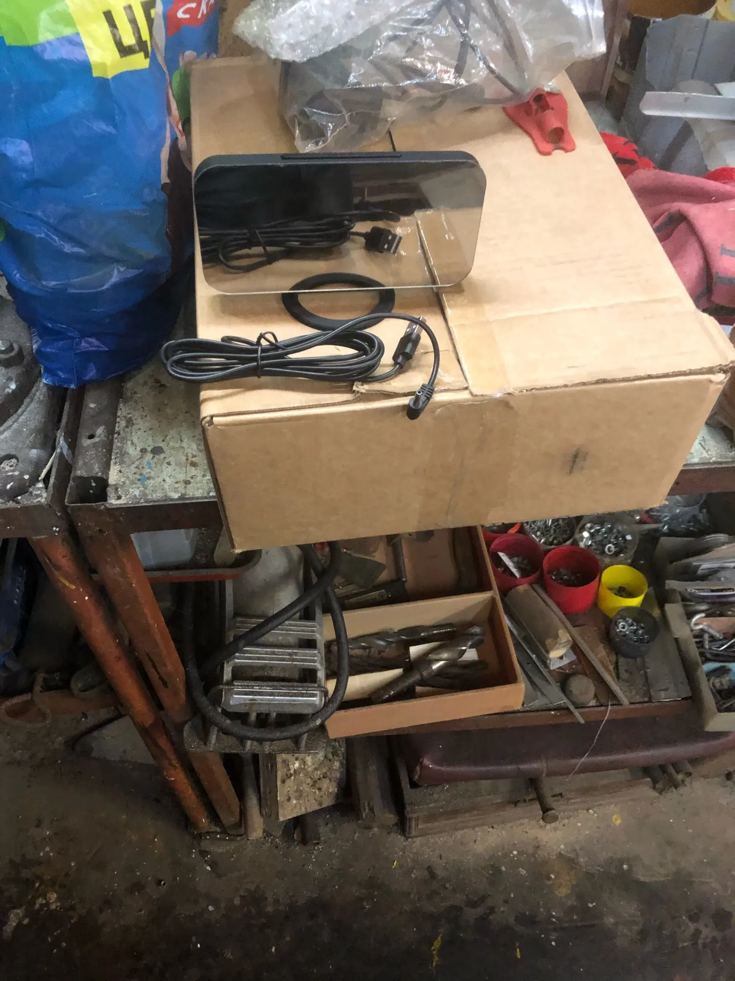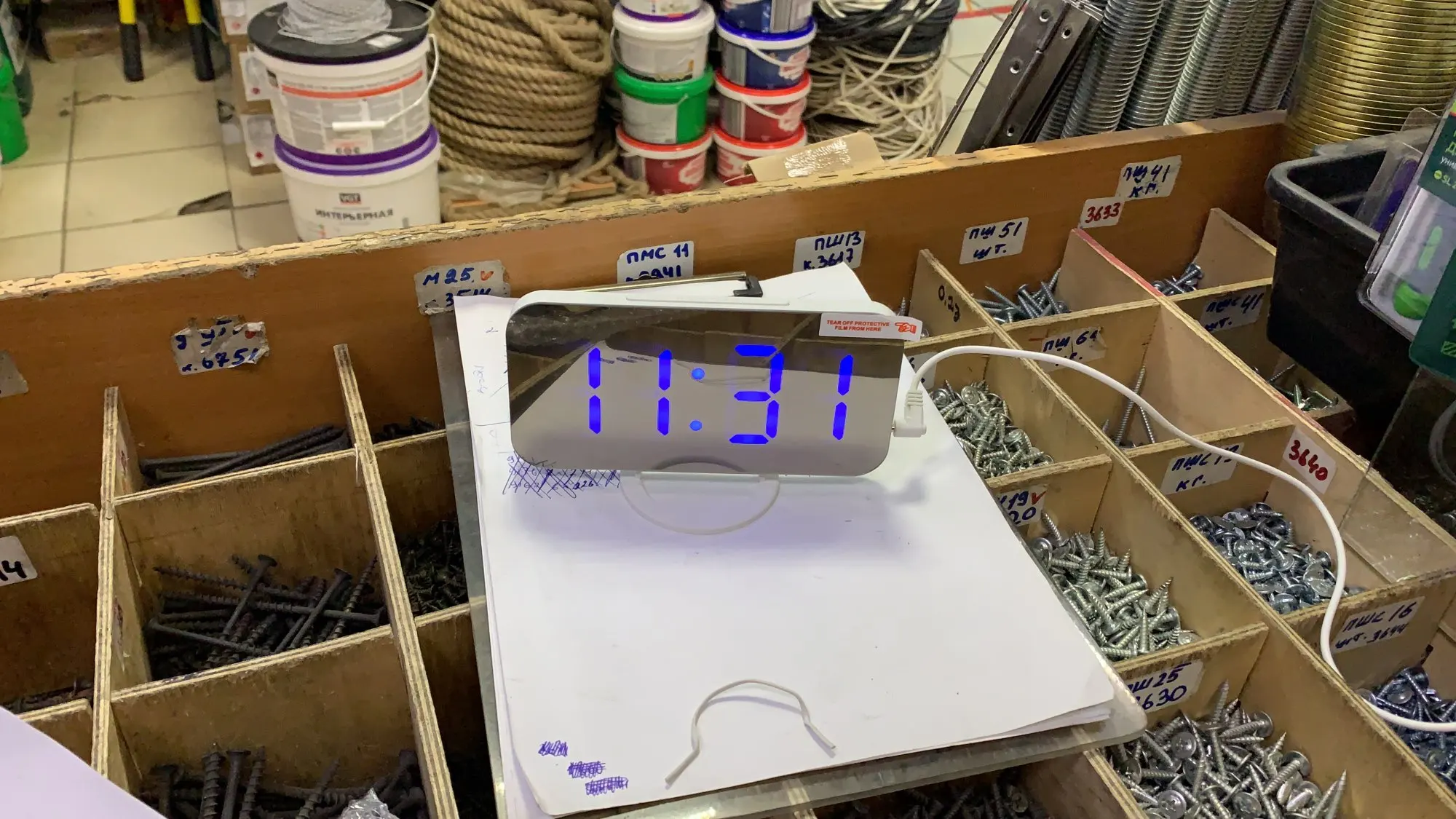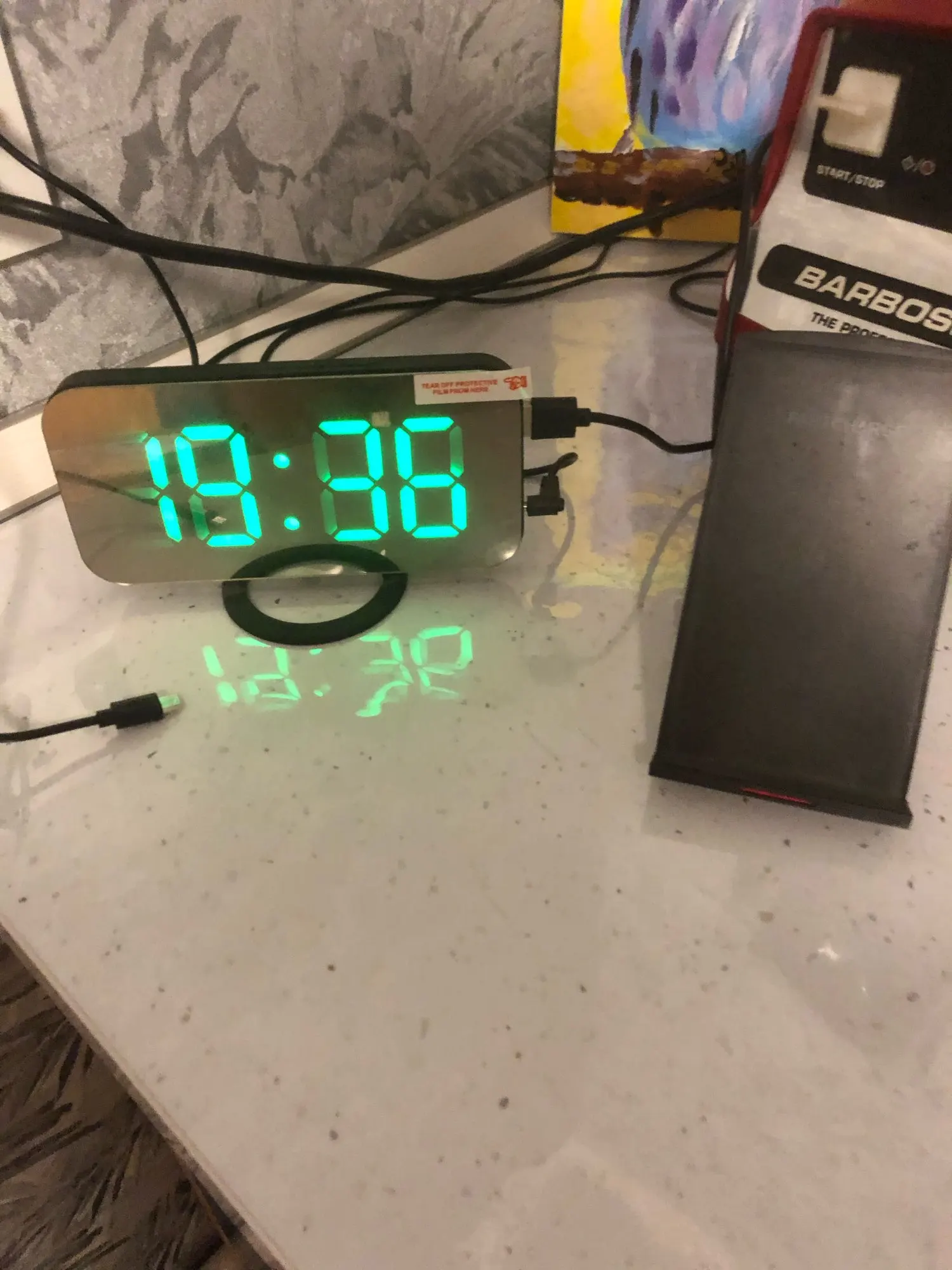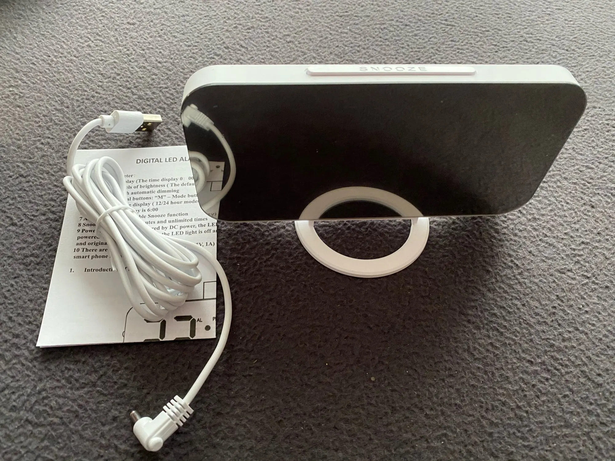 Часы ок, есть батарейка чтобы не сбивались при отключении питания. Но два момента - блока питания в комплекте нет, для работы часов нужна любая зарядка на USB. И коробка, хотя и была упакована в воздушный матрац, дошла как будто её пинали ногами. Хорошо, что зеркальное стекло не разбилось.