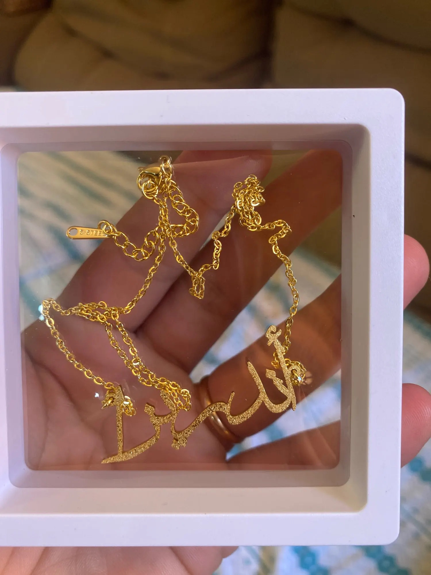 Красивое Ожерелье, имя подошло правильно. Ожерелье на арабском языке очень крепкое, поверьте, что оно не сломается. Отличное качество занимает 26 дней.