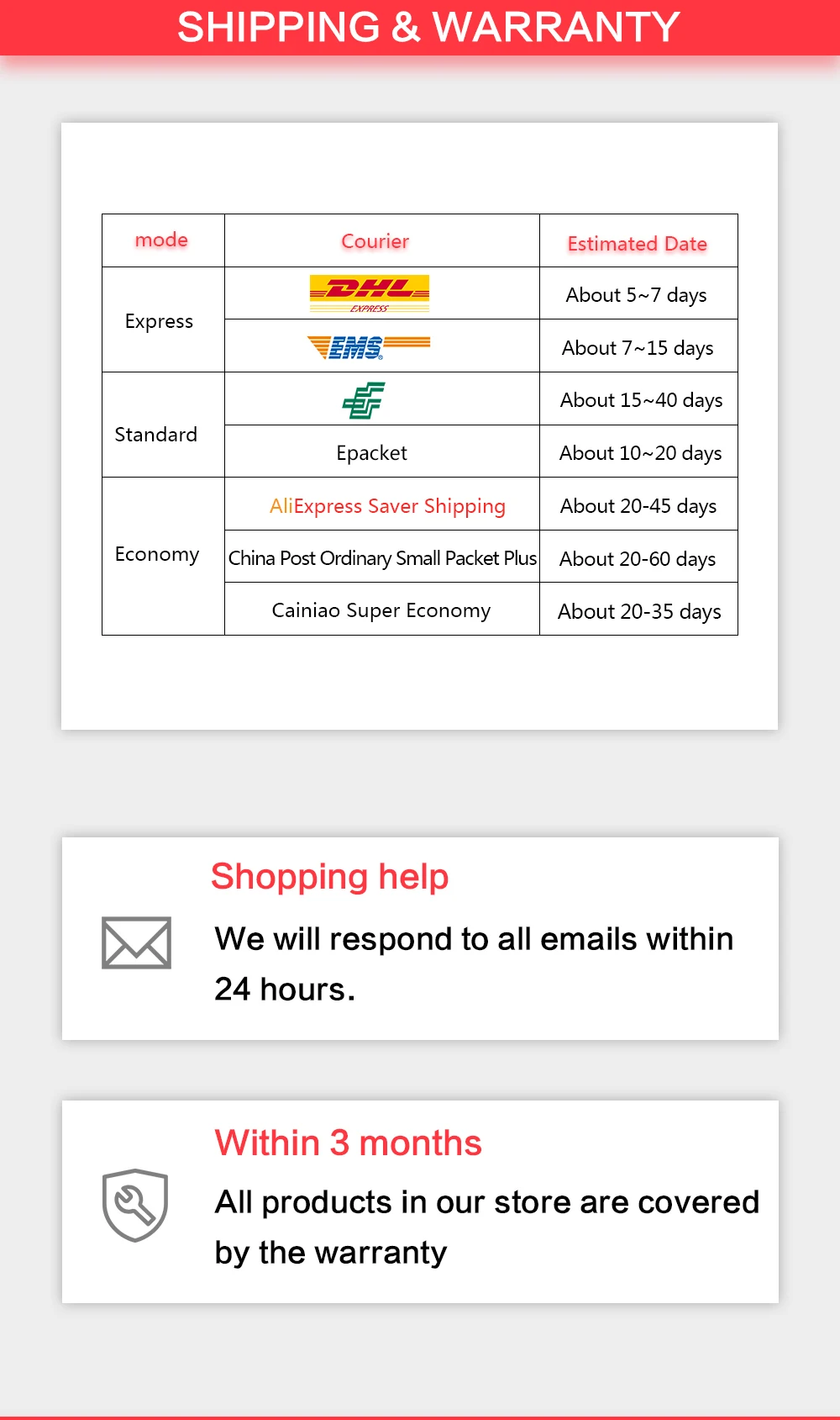 1) Мы гарантируем любой ущерб из-за несчастных случаев, но видео об открытии посылки должно быть предоставлено в течение 48 часов после получения.