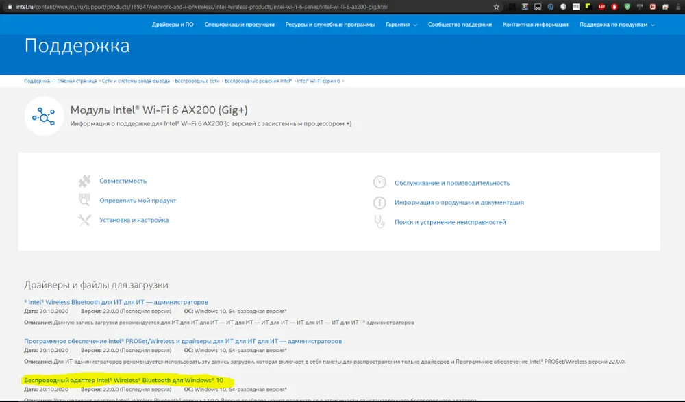 С момента оплаты до получения в отделении почты россии прошло 9 дней. Доставка из Китая. В комплекте: доп. крепежная планка для узких корпусов, винт крепления, шнур для подключения блютус модуля к USB, две антенны и бумажная инструкция на буржуйско-китайском. Диска с дровами небыло. Но он как бы не особо то и нужен. После подключения платы и включения ПК Win10 x64 даже ничего не спросила и загрузилась как обычно. Ткнув в значек сетевых подключений обнаружил там свои WiFi сети. Через деспетчер устройств проверил - драйвера на WIFI стали нормально, а вот на блютус пришлось качать и ставить вручную. Искать в яндексе по запросу "intel ax200 bluetooth driver". первая ссылка выдачи, на скрине отмечены нужные драйвера.