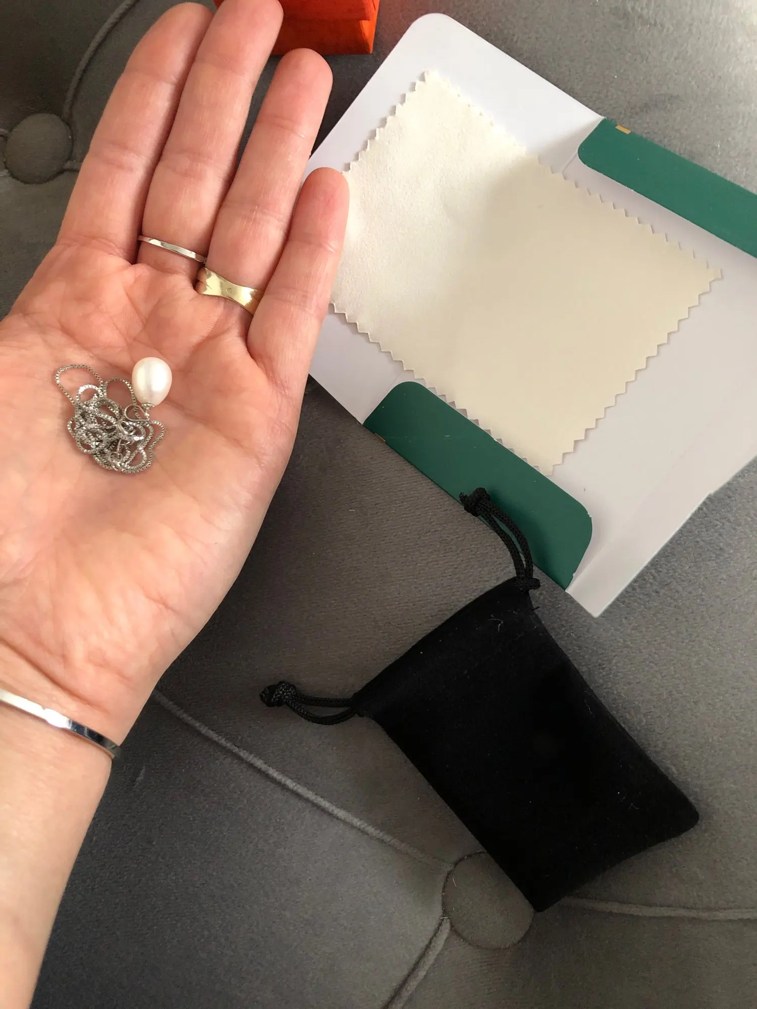 Я люблю жемчуг, и там я действительно доволен, честно говоря, он слишком красивый и более хорошо упакован в его бархатный мешочек с даже маленькой тканью, чтобы очистить жемчуг слишком мило